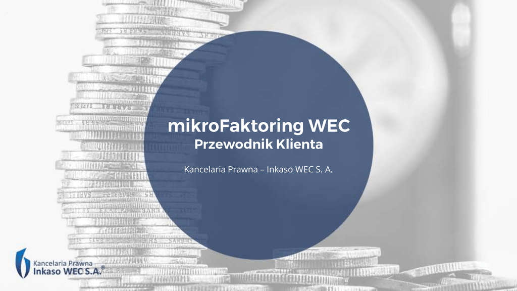 Kancelaria Prawna – Inkaso WEC S. A. 1. Najważniejsze pojęcia 2. Faktoring krok po kroku • Jak zgłosić odbiorcę? • Jak zgłosić faktury i korekty? • Kiedy faktor dokona wypłaty zaliczki i co to są Dostępne Środki? 3. Jak właściwie wystawić fakturę podlegającą cesji? 4. Co to jest Okres Finansowania? • Definicja • Jakie są konsekwencje wyjścia faktury poza Okres Finansowania? 5. Co to jest Limit Odbiorcy? • Definicja • Co zrobić, gdy Limit jest niewystarczający? 6. Dlaczego zdarza się, że faktury nie są zaakceptowane do finansowania? • Błędne udokumentowanie lub wystawienie faktury • Niezaakceptowanie odbiorcy • Korekty, kompensaty, płatności bezpośrednie, reklamacje 7. Kto, jak i kiedy prowadzi kontrolę wierzytelności? Szanowni Państwo, Faktoring w Polsce ma krótką historię, jednak wraz z upływem czasu staje się coraz bardziej popularny i konsekwentnie dynamicznie się rozwija. Dla wielu przedsiębiorców jest nadal nową formą finansowania firm. Ten przewodnik jest przeznaczony dla naszych Klientów, a jego celem jest ułatwienie sprawnego przekazywania faktur do finansowania. Zachęcamy do zapoznania się z nim. Wytłumaczymy, na czym polega ta usługa oraz przybliżymy Państwu wszelkie niezbędne informacje na ten temat. Mamy nadzieję, że niniejszy przewodnik pod usłudze faktoringu, okaże się dla Państwa przydatnym narzędziem ułatwiającym działanie w biznesie. Wszystkie aktualne informacje i usługi naszej spółki znajdziecie Państwo na naszej stronie: www.kancelariawec.eu Życzę miłej i owocnej lektury, Remigiusz Brzeziński, Prezes Zarządu Kancelarii Prawnej - Inkaso WEC S. A. 1. Faktoring – wykup przez podmiot świadczący usługę faktoringu (faktora) nieprzeterminowanych wierzytelności przedsiębiorstw (faktorantów) należnych im od kontrahentów (odbiorców) z tytułu dostaw i usług oraz na świadczeniu na ich rzecz dodatkowych usług (np. inkaso należności, monitoring płatności, prowadzenie rozliczeń, pomoc w ściąganiu przeterminowanych należności). 2. Cesja – przeniesienie Państwa wierzytelności wynikającej z wystawionych faktur na Kancelarię Inkaso WEC SA. Skutkuje przeniesieniem praw na kancelarię, w tym prawa do zapłaty od odbiorcy. 3. Cesja zwrotna – zwrotnie wierzytelności na klienta. przeniesienie praw wynikających z przekazanej 4. Dostępne środki – dostępna kwota na koncie faktoringowym, pozostająca do Państwa dyspozycji. 5. Faktor – Kancelaria Inkaso WEC SA – instytucja finansująca. 6. Klient – w umowie i wzajemnych relacjach termin, jakim określamy Państwa przedsiębiorstwo. 7. Limit finansowania – maksymalna kwota faktur, jakie możemy dla Państwa sfinansować. 8. Należności wzajemne – rozliczenia pomiędzy klientem a odbiorcą w sytuacji, gdy obie strony wzajemnie świadczą dla siebie usługę lub sprzedają towar. 9. Prowizja stała – stała stawka, jaką potrąca kancelaria z przekazywanych do finansowania faktur. 10. Prowizja zmienna – stawka zależna od czasu od uruchomienia finansowania do momentu spłaty przez odbiorcę. Jest ilorazem dni i stawki określonej w umowie. 11. Prowizja administracyjna – stała stawka za postawienie limitu do Państwa dyspozycji. Płatna 7 dni od podpisania umowy i w każdą rocznicę na podstawie wystawionej faktury VAT. Stanowi procent od limitu finasowania. 12. Okres finansowania – to maksymalny czas finansowania od momentu wystawienia faktury. 13. Wierzytelności zaakceptowane – faktury, które sprawdziliśmy i finansujemy. 14. Wierzytelności niezaakceptowane – te, których finansowania odmówiliśmy np. z powodu niepełnej lub błędnie przygotowanej dokumentacji, należności sporne, przeterminowane. 15. Sporna faktura – faktura, której zapłaty w całkowitej lub częściowej odmawia odbiorca. Celem zgłoszenia nowego, niezaakceptowanego wcześniej odbiorcy należy skontaktować się z Biurem Kancelarii Inkaso WEC SA telefonicznie pod nr +48 42 681 74 74 lub droga elektroniczną [email protected]. Po zweryfikowaniu dział analiz wyda decyzję o objęciu odbiorcy umowa faktoringu. Ważne! Wraz ze zgłoszeniem należy dostarczyć umowę współpracy z kontrahentem celem weryfikacji, czy nie zawiera zapisów kolidujących z umową faktoringu np. zakazu cesji. Celem zgłoszenia wierzytelności do finansowania należy: 1. Przygotować kartę długu będącą załącznikiem do wiążącej nas umowy. Karcie należy nadać nr zgodnie z kolejnością przekazywania zgłoszeń począwszy od nr 1 i uzupełnić o dane odbiorcy oraz dane z finansowanych faktur. Karta powinna być podpisana przez osobę reprezentującą i opatrzona pieczęcią firmową. 2. Faktury wystawione na odbiorcę powinny być opatrzone klauzulą: „Wierzytelność objęta niniejszą fakturą została przelana na Kancelarią Prawną - Inkaso WEC S.A., 90-361 Łódź, Piotrkowska 270. Zobowiązanie z faktury wygasa wyłącznie przez zapłatę na rachunek bankowy Kancelarii WEC 74 1140 1108 0000 5909 0800 1001” i podpisane przez osobę reprezentującą. Takie faktury wysyłają Państwo do swojego odbiorcy i te same w formie skanu przekazują nam. Powyższa klauzula i podpis na fakturze są konieczne, aby cesja wierzytelności była skuteczna. Komplet dokumentów, czyli: • Zgodnie z wytycznymi przygotowaną kartę długu • Faktury opatrzone klauzulą cesyjną i podpisem osoby reprezentującej wystawcę • Dokumenty potwierdzające zamówienie i odbiór usług/towarów Wysyłają Państwo w formie elektronicznej na adres: [email protected]. Środki uruchamiamy do 3 dni roboczych od dostarczenia kompletnej dokumentacji i pozytywnego potwierdzenia transakcji. W ciągu 3 dni roboczych dokonujemy weryfikacji przekazanych faktur. Osoby delegowane po stronie kancelarii sprawdzają, czy dokumenty zostały wystawione poprawnie i potwierdzone przez klienta i odbiorcę. Sprawdzamy również, czy odbiorca nie kwestionuje wykonanych us