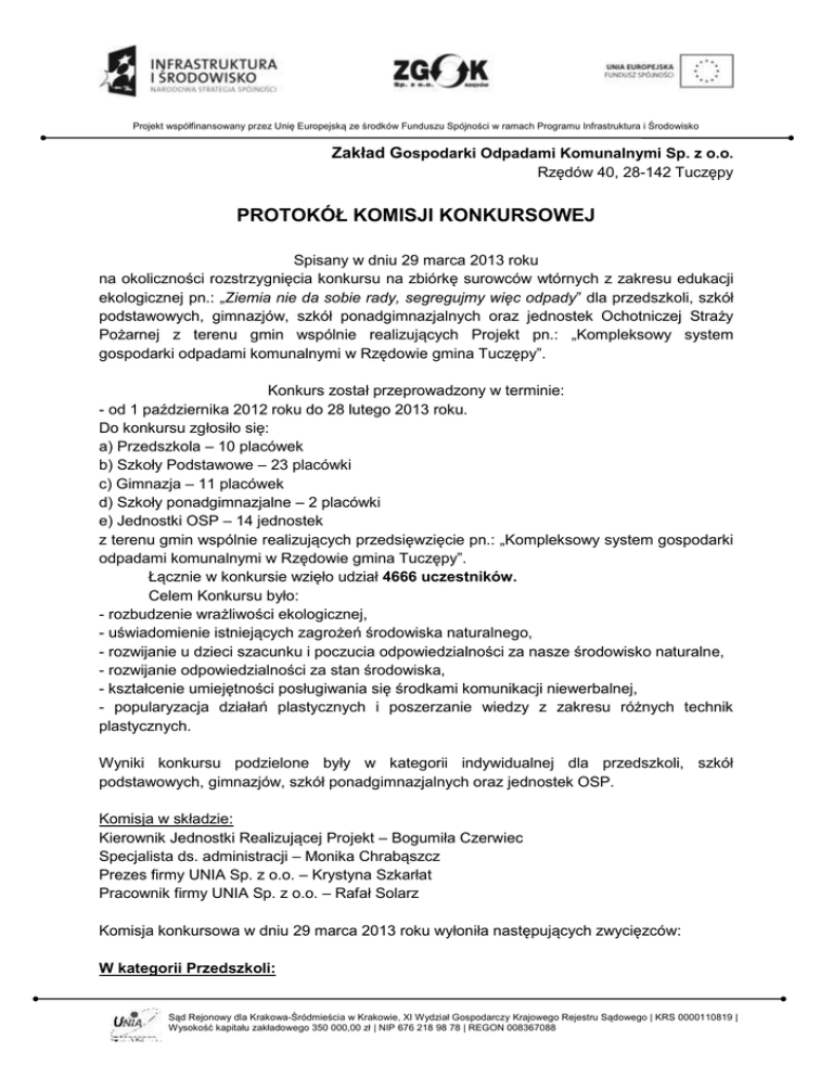 Projekt współfinansowany przez Unię Europejską ze środków Funduszu Spójności w ramach Programu Infrastruktura i Środowisko Zakład Gospodarki Odpadami Komunalnymi Sp. z o.o. Rzędów 40, 28-142 Tuczępy PROTOKÓŁ KOMISJI KONKURSOWEJ Spisany w dniu 29 marca 2013 roku na okoliczności rozstrzygnięcia konkursu na zbiórkę surowców wtórnych z zakresu edukacji ekologicznej pn.: „Ziemia nie da sobie rady, segregujmy więc odpady” dla przedszkoli, szkół podstawowych, gimnazjów, szkół ponadgimnazjalnych oraz jednostek Ochotniczej Straży Pożarnej z terenu gmin wspólnie realizujących Projekt pn.: „Kompleksowy system gospodarki odpadami komunalnymi w Rzędowie gmina Tuczępy”. Konkurs został przeprowadzony w terminie: - od 1 października 2012 roku do 28 lutego 2013 roku. Do konkursu zgłosiło się: a) Przedszkola – 10 placówek b) Szkoły Podstawowe – 23 placówki c) Gimnazja – 11 placówek d) Szkoły ponadgimnazjalne – 2 placówki e) Jednostki OSP – 14 jednostek z terenu gmin wspólnie realizujących przedsięwzięcie pn.: „Kompleksowy system gospodarki odpadami komunalnymi w Rzędowie gmina Tuczępy”. Łącznie w konkursie wzięło udział 4666 uczestników. Celem Konkursu było: - rozbudzenie wrażliwości ekologicznej, - uświadomienie istniejących zagrożeń środowiska naturalnego, - rozwijanie u dzieci szacunku i poczucia odpowiedzialności za nasze środowisko naturalne, - rozwijanie odpowiedzialności za stan środowiska, - kształcenie umiejętności posługiwania się środkami komunikacji niewerbalnej, - popularyzacja działań plastycznych i poszerzanie wiedzy z zakresu różnych technik plastycznych. Wyniki konkursu podzielone były w kategorii indywidualnej dla przedszkoli, szkół podstawowych, gimnazjów, szkół ponadgimnazjalnych oraz jednostek OSP. Komisja w składzie: Kierownik Jednostki Realizującej Projekt – Bogumiła Czerwiec Specjalista ds. administracji – Monika Chrabąszcz Prezes firmy UNIA Sp. z o.o. – Krystyna Szkarłat Pracownik firmy UNIA Sp. z o.o. – Rafał Solarz Komisja konkursowa w dniu 29 marca 2013 roku wyłoniła następujących zwycięzców: W kategorii Przedszkoli: Sąd Rejonowy dla Krakowa-Śródmieścia w Krakowie, XI Wydział Gospodarczy Krajowego Rejestru Sądowego | KRS 0000110819 | Wysokość kapitału zakładowego 350 000,00 zł | NIP 676 218 98 78 | REGON 008367088 Projekt współfinansowany przez Unię Europejską ze środków Funduszu Spójności w ramach Programu Infrastruktura i Środowisko 1. Przedszkole, Dobiesławice 38, 28-512 Bejsce - 127,13 pkt - aparat fotograficzny 2. Przedszkole, Dobiesławice 38A, 28-512 Bejsce - 87,75 pkt – drukarka atramentowa 2. Przedszkole, ul. Podwale 1, 28-100 Wiślica – 79 pkt – drukarka atramentowa 2. Przedszkole, ul. Żapniowska 1, 28-230 Połaniec – 76,18 pkt – drukarka atramentowa 3. Przedszkole, Niziny 120A, 28-142 Tuczępy – 38,4 pkt – skaner 3. Przedszkole, ul. Kielecka 17, 28-225 Szydłów – 33,8 pkt – skaner 3. Przedszkole, Wójcza 20A, 28-133 Pacanów – 33,05 pkt – skaner 3. Przedszkole Mostki 65, 28-200 Staszów – 31,8 pkt – skaner Indywidualne wyróżnienia: 1. Macheta Marcin - Przedszkole, Dobiesławice 38A, 28-512 Bejsce 2. Kwaśniewska Roksana - Przedszkole, Dobiesławice 38A, 28-512 Bejsce 3. Sara Wiśniewski - Przedszkole, Dobiesławice 38, 28-512 Bejsce 4. Weronika Makuch - Przedszkole, Dobiesławice 38, 28-512 Bejsce 5. Guca Kamil - Przedszkole, Wójcza 20A, 28-133 Pacanów 6. Guca Emil - Przedszkole, Wójcza 20A, 28-133 Pacanów 7. Kwiecień Kacper - Przedszkole, ul. Żapniowska 1, 28-230 Połaniec 8. Nadia Anioł - Przedszkole Mostki 65, 28-200 Staszów 9. Wojciech Wójcik - Przedszkole, ul. Kielecka 17, 28-225 Szydłów 10. Patrycjusz Leśniewski - Przedszkole, ul. Podwale 1, 28-100 Wiślica 11. Mateusz Adamczyk - Przedszkole, ul. Podwale 1, 28-100 Wiślica 12. Patrycja Kwiecień - Przedszkole, ul. Podwale 1, 28-100 Wiślica 13. Magdalena Czyszczoń - Przedszkole, ul. Podwale 1, 28-100 Wiślica 14. Wypych Natalia - Przedszkole, Dobiesławice 38, 28-512 Bejsce 15. Noga Oliwia - Przedszkole, Dobiesławice 38, 28-512 Bejsce Wyróżnieni uczniowie otrzymują odtwarzacze Mp4 W kategorii Szkoła Podstawowa: 1. Szkoła Podstawowa, ul. Nowokorczyńska 4, 28-520 Opatowiec – 347 pkt – aparat fotograficzny 2. Szkoła Podstawowa, Krzczonów 41, 28-520 Opatowiec – 140 pkt - drukarka 2. Szkoła Podstawowa, Dobiesławice 38A, 28-512 Bejsce – 73,35 pkt - drukarka 3. Szkoła Podstawowa, Stary Korczyn 85, 28-136 Nowy Korczyn – 68 pkt - skaner 3. Szkoła Podstawowa, Brzostków 1, 28-136 Nowy Korczyn – 66,47 pkt - skaner 3. Szkoła Podstawowa, ul. szkolna 9/1 28-236 Rytwiany – 63,6 pkt - skaner 3. Szkoła Podstawowa, Czajków Południowy 133, 28-200 Staszów – 61 pkt - skaner 3. Szkoła Podstawowa, Solec 22, 28-225 Szydłów – 42,92 pkt – skaner Indywidualne wyróżnienia: 1. Kacper Pietras - Szkoła Podstawowa, Dobiesławice 38A, 28-512 Bejsce 2. Maria Marzec - Szkoła Podstawowa, Dobiesławice 38A, 28-512 Bejsce 3. Wiktoria Krzeczkowska - Szkoła Podstawowa, Dobiesławice 38A, 28-512 Bejsce 4. Anna Książek - Szkoła Podstawowa, Dobiesławice 38A, 28-512 Bejsce 5. Madej Dominik - Szkoła Podstawowa, ul. Nowokorczyńska 4, 28-520 Opatowiec 6. Wróbel Nikola - Szkoła Podstawowa, ul. Nowokorczyńska 4, 28-520 Opatowiec 7. Król Gabriela - Szkoła Podstawowa, ul. Nowokorczyńska 4, 28-520 Opatowiec 8. Maj Wiktoria - Szkoła Podstawowa, ul. Nowokorczyńska 4, 28-520 Opatowiec 9. Ćwik Jarosław - Szkoła Podstawowa, ul. Nowokorczyńska 4, 28-520 Opatowiec 10. Czosnek Kacper – Szkoła Podstawowa, ul. Nowokorczyńska 4, 28-520 Opatowiec 11. Rogóz Joanna – Szkoła Podstawowa, ul. Nowokorczyńska 4, 28-520 Opatowiec Sąd Rejonowy dla Krakowa-Śródmieścia w Krakowie, XI Wydział Gospodarczy Krajowego Rejestru Sądowego | KRS 0000110819 | Wysokość kapitału zakładowego 350 000,00 zł | NIP 676 218 98 78 | R