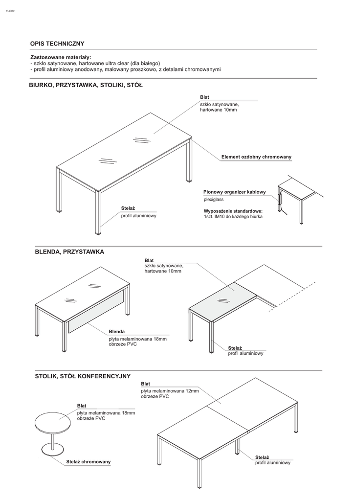 01/2012 OPIS TECHNICZNY Zastosowane materiały: - szkło satynowane, hartowane ultra clear (dla białego) - profil aluminiowy anodowany, malowany proszkowo, z detalami chromowanymi BIURKO, PRZYSTAWKA, STOLIKI, STÓŁ Blat . szkło satynowane, hartowane 10mm Element ozdobny chromowany Pionowy organizer kablowy plexiglass Stelaż . . profil aluminiowy Wyposażenie standardowe: 1szt. IM10 do każdego biurka BLENDA, PRZYSTAWKA Blat szkło satynowane, hartowane 10mm Blenda . płyta melaminowana 18mm obrzeże PVC Stelaż profil aluminiowy . STOLIK, STÓŁ KONFERENCYJNY Blat . płyta melaminowana 12mm obrzeze PVC Blat . płyta melaminowana 18mm obrzeże PVC Stelaż chromowany . Stelaż profil aluminiowy . OPIS TECHNICZNY SZAFY Wieniec górny . płyta melaminowana 28mm obrzeże PVC Front: System „Push-to-open” . laminat HPL Boki . płyta melaminowana 18mm obrzeże PVC Półka . płyta melaminowana 18mm obrzeże PVC Stopki . regulacja od wewnątrz Wieniec dolny Front, ramka aluminiowa płyta melaminowana 18mm obrzeże PVC szkło hartowane bezbarwne w ramce aluminiowej . . KOMODA ZE SZKŁEM Wieniec górny szkło satynowane, hartowane 10mm Front System „Push-to-open” szkło satynowane, hartowane 4mm Boki płyta melaminowana 18mm obrzeże PVC Stopki regulacja od wewnątrz Półka płyta melaminowana 18mm obrzeże PVC KONTENER SLK13H Wieniec górny . płyta melaminowana 18mm obrzeże PVC Korpus . płyta melaminowana 18mm, obrzeże PVC Zamek centralny . blokada wysuwu szuflady łamany kluczyk Szuflady metalowe . z systemem cichego domyku „silent system”, prowadnice kulkowe, nośność 35 kg Front . HPL obrzeże PVC Kółka . Ø 50mm, dwa z hamulcem OPIS TECHNICZNY Zastosowane materiały: - płyta melaminowana - profil aluminiowy anodowany, malowany proszkowo, z detalami chromowanymi BIURKO, PRZYSTAWKA, STOLIKI, STÓŁ Blat . płyta melaminowana 12mm obrzeże PVC Element ozdobny chromowany Pionowy organizer kablowy plexiglass Stelaż . profil aluminiowy Wyposażenie standardowe: 1szt. IM10 do każdego biurka BLENDA, PRZYSTAWKA Blat . płyta melaminowana 12mm obrzeże PVC Blenda . płyta melaminowana 18mm obrzeże PVC Stelaż profil aluminiowy . STOLIK, STÓŁ KONFERENCYJNY Blat . płyta melaminowana 12mm obrzeze PVC Blat . płyta melaminowana 18mm obrzeże PVC Stelaż chromowany . Stelaż profil aluminiowy . OPIS TECHNICZNY SZAFY Wieniec górny . płyta melaminowana 28mm obrzeże PVC Front, ramka aluminiowa . szkło hartowane, bezbarwne w ramce aluminiowej Front: System „Push-to-open” . laminat HPL Boki . płyta melaminowana 18mm obrzeże PVC Półka . płyta melaminowana 18mm obrzeże PVC Stopki Zamek patentowy . Wieniec dolny . regulacja od wewnątrz . płyta melaminowana 18mm obrzeże PVC Front . płyta melaminowana 18mm, obrzeże PVC KOMODA, SZAFA ZS02, ZS03 Wieniec górny płyta melaminowana 12mm, obrzeŻe PVC Front System „Push-to-open” płyta melaminowana 18mm obrzeże PVC Boki płyta melaminowana 18mm, obrzeże PVC Wieniec górny płyta melaminowana 28mm obrzeże PVC Front drzwi przesuwne zamocowane na metalowym mechanizmie z samodomykiem Półka płyta melaminowana 18mm, obrzeże PVC Stopki regulacja od wewnątrz ZS02 płyta melaminowana 18mm pokryta laminatem HPL obrzeże PCV Stopki . regulacja od wewnątrz Szuflada płyta melaminowana 12mm, obrzeże PVC ZS03 płyta melaminowana 18 mm obrzeże PVC KONTENER SLK13H Wieniec górny . płyta melaminowana 18mm obrzeże PVC Korpus . płyta melaminowana 18mm, obrzeże PVC Zamek centralny . blokada wysuwu szuflady łamany kluczyk Szuflady metalowe . z systemem cichego domyku „silent system”, prowadnice kulkowe, nośność 35 kg Front . HPL obrzeże PVC Kółka . Ø 50mm, dwa z hamulcem