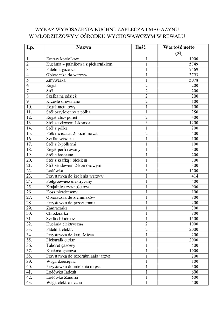 WYKAZ WYPOSAŻENIA KUCHNI, ZAPLECZA I MAGAZYNU W MŁODZIEŻOWYM OŚRODKU WYCHOWAWCZYM W REWALU Lp. 1. 2. 3. 4. 5. 6. 7. 8. 9. 10. 11. 12. 13. 14. 15. 16. 17. 18. 19. 20. 21. 22. 23. 24. 25. 26. 27. 28. 29. 30. 31. 32. 33. 34. 35. 36. 37. 38. 39. 40. 41. 42. 43. Nazwa Zestaw kociołków Kuchnia 4 palnikowa z piekarnikiem Patelnia gazowa Obieraczka do warzyw Zmywarka Regał Stół Szafka na odzież Krzesło drewniane Regał metalowy Stół przyścienny z półką Regał alu.- poliet Stół ze zlewem 1-komor Stół z półką Półka wisząca 2-poziomowa Szafka wisząca Stół z 2-półkami Regał perforowany Stół z basenem Stół z szafką i blokiem Stół ze zlewem 2-komorowym Lodówka Przystawka do krojenia warzyw Podgrzewacz elektryczny Krajalnica żywnościowa Kosz nierdzewny Obieraczka do ziemniaków Przystawka do przecierania Zamrażarka Chłodziarka Szafa chłodnicza Kuchnia elektryczna Patelnia elektr. Przystawka do kraj. Mięsa Piekarnik elektr. Taboret gazowy Kuchnia gazowa Przystawka do rozdrabniania jarzyn Waga dziesiętna Przystawka do mielenia mięsa Lodówka Indesit Lodówka Zanussi Waga elektroniczna Ilość 1 1 1 1 1 2 2 2 2 1 1 2 3 1 2 1 1 1 1 1 1 3 1 1 1 1 1 1 1 1 1 2 2 1 1 1 1 1 1 1 1 1 1 Wartość netto (zł) 1000 5749 7569 3793 5078 200 200 200 100 100 250 400 1200 200 400 100 100 300 200 300 300 1500 414 400 900 100 800 200 300 800 1500 1000 2000 200 2000 500 1000 200 100 300 600 600 500 44. 45. 46. 47. 48. 49. 50. 51. 52. 53. 54. 55. 56. 57. 58. 59. 60. 61. 62. 63. 64. Napęd + stojak Przystawka do tarcia sera Taborek grzewczy gaz Przystawka do ostrzenia Kloc do mięsa Stół z blatem Paleta PCV Basen 2-komorowy Separator skrobi Podstawa do zmywarki Uzdatniacz do wody Regały magazynowe Szafka Stół ze zlewem 1 komor. Regał alu - polietyl Krzesło drewniane Biurko Zamrażarka Zamrażarka Zanussi Lodówka na jaja Naświetlacz do jaj Spis zakończono na poz. 64. 1 1 2 1 1 1 3 1 1 1 1 1 1 3 4 1 1 4 1 1 1 500 100 3000 100 100 300 600 1500 500 300 200 200 100 3000 800 100 100 2000 1000 500 700
