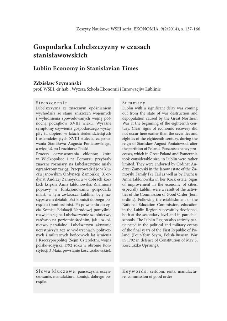 Zeszyty Naukowe WSEI seria: EKONOMIA, 9(2/2014), s. 137-166 Gospodarka Lubelszczyzny w czasach stanisławowskich Lublin Economy in Stanislavian Times Zdzisław Szymański prof. WSEI, dr hab., Wyższa Szkoła Ekonomii i Innowacjiw Lublinie Streszczenie Summar y S ł o w a k l u c z o w e : pańszczyzna, oczyn- K e y w o r d s : serfdom, rents, manufactu- Lubelszczyzna ze znacznym opóźnieniem wychodziła ze stanu zniszczeń wojennych i wyludnienia spowodowanych wojną północną początków XVIII wieku. Wyraźne symptomy ożywienia gospodarczego wystąpiły tu dopiero w latach siedemdziesiątych i osiemdziesiątych XVIII stulecia, za panowania Stanisława Augusta Poniatowskiego, a więc już po I rozbiorze Polski. Procesy oczynszowania chłopów, które w Wielkopolsce i na Pomorzu przybrały znaczne rozmiary, na Lubelszczyźnie miały ograniczony zasięg. Przeprowadził je w kluczu janowskim Ordynacji Zamojskiej X ordynat Andrzej Zamoyski, a w dobrach kockich księżna Anna Jabłonowska. Znamiona poprawy w funkcjonowaniu gospodarki miast, w tym zwłaszcza Lublina, były następstwem działalności komisji dobrego porządku (boni ordinis). Po powołaniu do życia Komisji Edukacji Narodowej pomyślnie rozwijało się na Lubelszczyźnie szkolnictwo, zarówno na poziomie średnim, jak i szkolnictwo parafialne. Lubelszczyzn aktywnie uczestniczyła też w wydarzeniach politycznych i militarnych końcowych lat istnienia I Rzeczypospolitej (Sejm Czteroletni, wojna polsko-rosyjska 1792 roku w obronie Konstytucji 3 Maja, powstanie kościuszkowskie). szowanie, manufaktura, komisja dobrego porządku Lublin with a significant delay was coming out from the state of war destruction and depopulation caused by the Great Northern War at the beginning of the eighteenth century. Clear signs of economic recovery did not occur here earlier than the seventies and eighties of the eighteenth century, during the reign of Stanisław August Poniatowski, after the partition of Poland. Peasants tenancy processes, which in Great Poland and Pomerania took considerable size, in Lublin were rather limited. They were endorsed by Ordinat Andrzej Zamoyski in the Janow estate of the Zamoyski Family Fee Tail as well as by Duchess Anna Jabłonowska in her Kock estate. Signs of improvement in the economy of cities, especially Lublin, were a result of the activities of the Commission of Good Order (boni ordinis). Following the establishment of the National Education Commission, education in the Lublin Region successfully developed, both at the secondary level and in parochial schools. The Lublin Region also actively participated in the political and military events of the final years of the First Republic of Poland (Four-Year Seym, Polish-Russian War in 1792 in defence of Constitution of May 3, Kościuszko Uprising). re, commission of good order Zeszyty Naukowe WSEI seria: EKONOMIA, 9(2/2014) 138 WSEI Scientific Journal series: ECONOMICS, 9(2/2014) 1 . Lub els z c z y zna w p o c z ąt ka ch d r u g iej p oł ow y XVIII w ieku – go sp o d ark a i sp oł e c z eństwo Lubelszczyzna w dzisiejszym tego słowa znaczeniu w czasach przedrozbiorowych obejmowała ziemie wchodzące w skład różnych jednostek administracyjnych. Utworzone w 1474 roku województwo lubelskie objęło większość położonych na wschód od środkowej Wisły ziem etnicznie polskich, a więc ziemię lubelską (powiaty lubelski i urzędowski) oraz ziemię łukowską. W obręb województwa lubelskiego nie weszły wówczas tereny dawnej Rusi Halicko-Włodzimierskiej przyłączone do Polski w XIV wieku przez Kazimierza Wielkiego, a więc ziemia chełmska z Chełmem, Krasnymstawem i Szczebrzeszynem, będąca do czasów rozbiorów częścią województwa ruskiego ze stolicą we Lwowie, ani też ziemia bełska z której później utworzono województwo bełskie. W skład województwa lubelskiego nie wchodziła również Biała (obecnie Biała Podlaska) aż do końca istnienia I Rzeczypospolitej pozostająca integralną częścią Wielkiego Księstwa Litewskiego. W skali ówczesnego Królestwa Polskiego województwo lubelskie należało do większych (w drugiej połowie XVI wieku jego powierzchnia wynosiła 10684 km)2 i stanowiło zwarty i jednolity obszar między Wisłą, Sanem, Wieprzem i Liwcem (lewobrzeżnym dopływem Bugu)1. Po unii z Litwą w r. 1385 Lubelszczyzna znalazła się w centrum rozległej monarchii jagiellońskiej. Sprzyjało to rozwojowi gospodarczemu, nasileniu akcji osadniczej i tym samym wzrostowi liczby ludności. W połowie wieku XVI dorównała ona poziomem zaawansowania cywilizacyjnego pozostałym ziemiom polskim, mimo iż pozostała nadal obszarem słabo zaludnionym2. Na okres po unii lubelskiej z 1569r. do wojen połowy XVII wieku przypada apogeum rozwoju całej Lubelszczyzny i jej roli w Rzeczypospolitej Obojga Narodów. Do dziejów ojczystych, w tym okresie, wniosła ona olbrzymi, niepodważalny wkład. Jej rola w wielu dziedzinach życia gospodarczego, politycznego i kulturalnego była przodująca3. Wojny jakie toczyła Rzeczypospolita w połowie XVII wieku miały decydujący wpływ na upadek gospodarczy całego kraju, w tym również województwa lubelskiego i ziem sąsiednich. W przypadku Lubelszczyzny nastąpiła jej marginalizacja w obrębie Rzeczypospolitej, mimo że aż do I rozbioru Polski pozostawała ona w centrum rozległego terytorialnie państwa. Jej obszar w latach ,,potopu” szwedz- 1 2 3 T. Mencel, Wstęp, [w:] Dzieje Lubelszczyzny, t. I, T. Mencel (red.), Warszawa 1974, s. 10-11. S. Tworek, W okresie Odrodzenia i reformacji 1569-1648, [w:] Dzieje Lubelszczyzny, t. I, s. 243. Szacuje się, że w ósmym dziesięcioleciu XVI wieku liczba ludności zamieszkującej ziemie etnicznie polskie Korony (Wielkopolska, Małopolska, Mazowsze, Prusy Królewskie) wynosiła 3400 tys.; dawało to średnią gęstość zaludnienia 20,6 osób na 1 km2. B. Zientara, A. Mączak, J. Ihnatowicz, Z. Landau, Dzieje gospodarcze Polski do roku 1