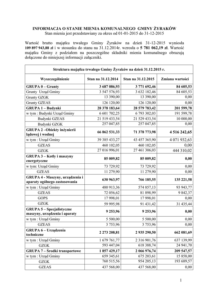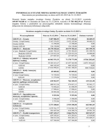 INFORMACJA O STANIE MIENIA KOMUNALNEGO GMINY ŻYRAKÓW Stan mienia jest przedstawiany za okres od 01-01-2015 do 31-12-2015 Wartość brutto majątku trwałego Gminy Żyraków na dzień 31-12-2015 wyniosła 109 897 943,88 zł i w stosunku do stanu na 31.12.2014r. wzrosła o 5 781 062,19 zł. Wartość majątku Gminy z podziałem na poszczególne składniki mienia komunalnego obrazują dołączone do niniejszej informacji załączniki. Struktura majątku trwałego Gminy Żyraków na dzień 31.12.2015 r. Wyszczególnienie GRUPA 0 – Grunty Grunty Urząd Gminy Grunty GZGK Grunty GZEAS GRUPA 1 – Budynki w tym : Budynki Urząd Gminy Budynki GZEAS Budynki GZGK GRUPA 2 –Obiekty inżynierii lądowej i wodnej w tym : Urząd Gminy GZEAS GZGK GRUPA 3 – Kotły i maszyny energetyczne w tym: Urząd Gminy GZEAS GRUPA 4 - Maszyny, urządzenia i aparaty ogólnego zastosowania w tym : Urząd Gminy GZEAS GOPS GZGK GRUPA 5 – Specjalistyczne maszyny, urządzenia i aparaty w tym : Urząd Gminy GZEAS GRUPA 6 – Urządzenia techniczne w tym : Urząd Gminy GZGK GRUPA 7 – Środki transportowe w tym : Urząd Gminy GZGK GZEAS Stan na 31.12.2014 Stan na 31.12.2015 Zmiana wartości 3 687 086,93 3 547 576,93 13 390,00 3 771 692,46 3 632 182,46 13 390,00 84 605,53 84 605,53 0,00 126 120,00 28 378 183,64 6 601 702,25 21 519 433,54 257 047,85 126 120,00 28 579 783,42 6 793 302,03 21 529 433,54 257 047,85 0,00 201 599,78 191 599,78 10 000,00 0,00 66 862 531,33 71 378 773,98 4 516 242,65 39 385 433,27 460 102,05 27 016 996,01 43 457 365,90 460 102,05 27 461 306,03 4 071 932,63 0,00 444 310,02 85 009,82 85 009,82 0,00 73 729,92 11 279,90 73 729,92 11 279,90 0,00 0,00 630 963,97 766 185,55 135 221,58 480 913,36 72 056,62 17 998,01 574 857,13 81 898,99 17 998,01 93 943,77 9 842,37 0,00 59 995,98 91 431,42 31 435,44 9 253,96 9 253,96 0,00 5 500,00 3 753,96 5 500,00 3 753,96 0,00 0,00 2 273 208,81 2 935 290,50 662 081,69 1 679 761,77 593 447,04 1 857 429,17 659 345,61 760 515,56 2 316 901,76 618 388,74 2 066 976,74 675 203,61 954 205,13 637 139,99 24 941,70 209 547,57 15 858,00 193 689,57 437 568,00 437 568,00 0,00 1 GRUPA 8 – Narzędzia, przyrządy, ruchomości i wyposażenie w tym : Urząd Gminy GOPS GZEAS RAZEM ŚRODKI TRWAŁE 333 214,06 304 977,45 -28 236,61 266 783,67 11 400,00 55 030,39 104 116 881,69 232 813,06 11 400,00 60 764,39 109 897 943,88 -33 970,61 0,00 5 734,00 5 781 062,19 Za okres od 01.01.2015 roku do 31.12.2015 roku wartość majątku trwałego Gminy Żyraków inwestycji zmieniła się w następujący sposób: Grunty Zmniejszenia: W okresie od 1 stycznia 2015 r. do 31 grudnia 2015 r. w obrocie mieniem komunalnym sprzedano działki w m. Bobrowa i Góra Motyczna zabudowane budynkami mieszkalnymi oraz działka w Żyrakowie o łącznej powierzchni 0,1914 ha, zasiedzona została działka w Bobrowej o pow. 0,09 ha i łącznie odpisano w wartości ewidencyjnej na kwotę 619,37 zł. Ponadto w związku z, między innymi, podziałami i zamianami nieruchomości za działki na poszerzenie dróg gminnych odpisano nieruchomości o łącznej powierzchni 2,8963 ha na kwotę 36.437,00 zł. Razem zmniejszenia 37.056,37 zł. Zwiększenia: Zakupiono grunty od osób fizycznych pod przepompownie ścieków i pod drogi gminne oraz przejęto nieodpłatnie i zamieniono się na działki pod drogi gminne na łączną wartość 103.327,90 zł o łącznej powierzchni 0,9687 ha. Zwiększenia związane z podziałami nieruchomości o powierzchni 2,2661 ha na kwotę 18.334,00 zł. Razem zwiększenia 121.661,90 zł. Budynki, które są własnością mienia komunalnego Gminy Żyraków zostały przekazane w trwały zarząd dla Zespołów Szkół Publicznych oraz Publicznych Przedszkoli. Na podstawie umowy użyczenia zostały przekazane budynki dla Ochotniczych Straży Pożarnych, Gabinetów Rehabilitacji i Ośrodka Zdrowia w Żyrakowie. W budynkach gdzie znajdują się lokale mieszkalne i użytkowe zostały zawarte umowy najmu. Zabudowania dworskie w Straszęcinie zostały oddane w dzierżawę Centrum Kultury i Promocji w Żyrakowie. Grunty rolne będące własnością mienia komunalnego Gminy Żyraków o powierzchni 13,84 ha zostały wydzierżawione na cele rolnicze dla osób fizycznych oraz grunty o powierzchni 0,0137 ha wydzierżawiono na cele nierolnicze, natomiast grunty o powierzchni 1,70 ha zostały oddane w użytkowanie wieczyste. Budynki i budowle Zwiększenia: 1. Termomodernizacja remizy OSP w Żyrakowie na kwotę 161.758,40 zł. 2. Zwiększono wartość budynku remizy OSP w Korzeniowie, w związku z budową i przebudową ogrodzenia przy budynku remizy na kwotę 15.000,00 zł. 3. Zakup wiat przystankowych zlokalizowanych w miejscowościach Bobrowa, Nagoszyn i Straszęcin na łączną kwotę 14.841,38 zł. 2 4. 5. 6. 7. 8. 9. 10. 11. 12. 13. Wybudowano odcinki kanalizacji sanitarnej w m. Bobrowa, Bobrowa Zakącie, Góra Motyczna, Korzeniów, Straszęcin, Wiewiórka, Wola Wielka, Zasów i Zawierzbie na łączną wartość – 1.441.798,24 zł oraz przepompownie ścieków w m. Bobrowa Zakącie, Góra Motyczna, Korzeniów, Straszęcin, Wola Wielka i Zawierzbie na łączną wartość – 498.906,06 zł. Wykonanie odcinka sieci wodociągowej w miejscowości Straszęcin na kwotę 8.726,05 zł Wykonanie instalacji technologicznych wodociągowych i sterowniczych od studni głębinowych do budynku stacji uzdatniania wody w Nagoszynie na kwotę 189.794,76 zł. Rozbudowa oczyszczalni ścieków w miejscowości Zawierzbie na kwotę 411.758,23 zł. Wykonano przebudowę drogi gminnej pn. "Wiewiórka – Zasów" – tzw. „Sikornik” na kwotę 728.100,00 zł. Wykonano przebudowę drogi gminnej pn. „Zawierzbie – Straszęcin” nr 106714 R na kwotę 144.684,32 zł. Przebudowa drogi gminnej na odcinku od drogi powiatowej do szpitala psychiatrycznego na kwotę 380.828,20 zł. Wykonanie odwodnienia drogi gminnej w miejscowości Wola Wielka pn. „Ubojnia – Słota” na kwotę 87.441,10 zł. Przebudowa drogi gminnej w miejscowości Wola