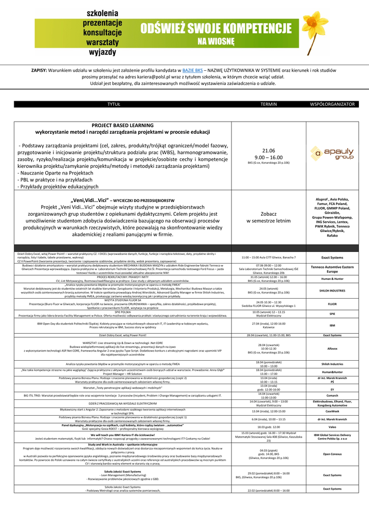 ZAPISY: Warunkiem udziału w szkoleniu jest założenie profilu kandydata w BAZIE BKS – NAZWĘ UŻYTKOWNIKA W SYSTEMIE oraz kierunek i rok studiów prosimy przesyłać na adres [email protected] wraz z tytułem szkolenia, w którym chcecie wziąć udział. Udział jest bezpłatny, dla zainteresowanych możliwość wystawienia zaświadczenia o udziale. TYTUŁ TERMIN WSPÓŁORGANIZATOR PROJECT BASED LEARNING wykorzystanie metod i narzędzi zarządzania projektami w procesie edukacji - Podstawy zarządzania projektami (cel, zakres, produkty/trójkąt ograniczeń/model fazowy, przygotowanie i inicjowanie projektu/struktura podziału prac (WBS), harmonogramowanie, zasoby, ryzyko/realizacja projektu/komunikacja w projekcie/osobiste cechy i kompetencje kierownika projektu/zamykanie projektu/metody i metodyki zarządzania projektami) - Nauczanie Oparte na Projektach - PBL w praktyce i na przykładach - Przykłady projektów edukacyjnych „Veni,Vidi…Vici” – WYCIECZKI DO PRZEDSIĘBIORSTW Projekt „Veni Vidi…Vici” obejmuje wizyty studyjne w przedsiębiorstwach zorganizowanych grup studentów z opiekunami dydaktycznymi. Celem projektu jest umożliwienie studentom zdobycia doświadczenia bazującego na obserwacji procesów produkcyjnych w warunkach rzeczywistych, które pozwalają na skonfrontowanie wiedzy akademickiej z realiami panującymi w firmie. Dzień Dobry Excel, witaj Power Point! – warsztat praktyczny CZ. I EXCEL (wprowadzanie danych, funkcje, funkcje i narzędzia tekstowe, daty, przydatne skróty i narzędzia, listy I tabele, tabele przestawne, wykresy) CZ II PowerPoint (tworzenie prezentacji, tworzenie i zapisywanie szablonów, przydatne skróty, widok prezentera, zapisywanie) Budowa i działanie amortyzatora – warsztat praktyczny dedykowany studentom MECHNIKA I BUDOWA MASZYN z udziałem Ride Engineerów fabryki Tenneco w Gliwicach Prezentacja wprowadzająca. Zajecia praktyczne w Laboratorium Techniki Samochodowej Pol.Śl. Prezentacja samochodu testowego Ford Focus – jazda testowa! Każdy z uczestników musi posiadać aktualne ubezpieczenie NW! PROCES REKRUTACYJNY: PRAWDY I MITY CV, List Motywacyjny, Rozmowa kwalifikacyjna w praktyce. Case study z aktywnym udziałem uczestników. „Analiza ryzyka powstania błędów w przemyśle motoryzacyjnym w oparciu o metodę FMEA” Warsztat dedykowany jest do studentów ostatnich lat studiów kierunków: Zarządzanie i Inżynieria Produkcji, Metalurgia, Mechanika i Budowa Maszyn a także wszystkich osób zainteresowanych branżą automotive. W trakcie spotkania prowadzący Andrzej Wierzbicki, Advanced Quality Manager w firmie Shiloh Industries, przybliży metodę FMEA, przekazując zarówno wiedzę teoretyczną jak i praktyczne przykłady. WIZYTA STUDYJNA FLUOR SA Prezentacja (Biuro Fluor w Gliwicach, korporacja FLUOR na świecie, pracownia ORUROWANIA – specyfika, zakres działalności, przykładowe projekty), Spotkanie z pracownikami FLUOR, wizytacja na projekcie SPIE POLSKA Prezentacja firmy jako lidera branży Facility Management w Polsce. Oferta możliwości odbywania praktyk i elastycznego zatrudnienia na terenie kraju i województwa. 21.06 9.00 – 16.00 BKS (G-ce, Konarskiego 20 p.106) Zobacz w semestrze letnim Aluprof , Avio Polska, Famur, FCA Poland, FLUOR, GMMP Poland, Górażdże, Grupa Powen-Wafapomp, ING Services, Lentex, PWiK Rybnik, Tenneco Gliwice/Rybnik, Rafako 11:00 – 15:00 Aula CITT Gliwice, Banacha 7 Exact Systems 07.06 09:00 – 12:00 Sala Laboratorium Techniki Samochodowej IŚiE Gliwice, Konarskiego 20b 31.05 (wtorek) 12.00 – 16.00 BKS (G-ce, Konarskiego 20 p.106) Tenneco Automtive Eastern Europe Human & Hunter 24.05 (wtorek) BKS (G-ce, Konarskiego 20 p.106) SHILOH INDUSTRIES 24.05 10.30 – 12.30 Siedziba FLUOR Gliwice ul. Wyszyńskiego 1 FLUOR 10.05 (wtorek) 12 – 13.15 Wydział Elektryczny SPIE IBM Open Day dla studentek Politechniki Śląskiej: Kobiety pracujące w nietuzinkowych obszarach IT, IT-Leadership w kobiecym wydaniu, Proces rekrutacyjny w IBM, Success story w spódnicy 27.04 (środa), 12:00-16:00 Katowice IBM Dzień Dobry Excel, witaj Power Point! 28.04 (czwartek), 11.00-15.00, BKS Exact Systems WARSZTAT: Live streaming Up & Down w technologii .Net CORE Budowa wieloplatformowej aplikacji do live streamingu, prezentacji danych na żywo z wykorzystaniem technologii ASP.Net CORE, frameworka Angular 2 oraz języka Type Script. Dodatkowo konkurs z atrakcyjnymi nagrodami oraz upominki VIP dla najaktywniejszych uczestników 28.04 (czwartek) 10:30-12.30 BKS (G-ce, Konarskiego 20 p.106) Alfavox Analiza ryzyka powstania błędów w przemyśle motoryzacyjnym w oparciu o metodę FMEA „Nie takie kompetencje straszne na jakie wyglądają” Zajęcia praktyczne z aktywnym uczestnictwem osób biorących udział w warsztacie. Prowadzenie: Anna Głąb* Project Manager – HR Solution Podstawy pisania Biznesu Planu: Rodzaje i znaczenie planowania w działalności gospodarczej (część 2) Warsztaty praktyczne dla osób zainteresowanych założeniem własnej firmy. Warsztat „Testy penetracyjne aplikacji webowych i mobilnych” BIG ITIL TRIO: Warsztat przedstawiał będzie role oraz wzajemnie korelacje 3 procesów (Incydent, Problem i Change Management) w zarządzaniu usługami IT. DZIEŃ Z PRACODAWCĄ NA WYDZIALE ELEKTRYCZNYM 18.04 (poniedziałek) 10.00 – 13.00 18.04 (poniedziałek) 13.00 – 17.00 13.04 (środa) 10.00 – 13.15 13.04 (środa) godz. 12.00-16:00 14.04 (czwartek) 11:00-13:00 14.04 (czwartek), 9:00 – 13:00 Wydział Elektryczny Shiloh Industries Human&Hunter dr inż. Marek Krannich PŚ EY Comarch Elektrobudowa, Elhand, Fluor, Kongsberg Automotive Błyskawiczny start z Angular 2: Zapoznanie z metodami szybkiego tworzenia aplikacji internetowych w technologii SPA. Podstawy pisania Biznesu Planu: Rodzaje i znaczenie planowania w działalności gospodarczej (część 1) Warsztaty praktyczne dla osób zainteresowanych założeniem własnej firmy. Panel dyskusyjny „Motoryzacja na szpilkach