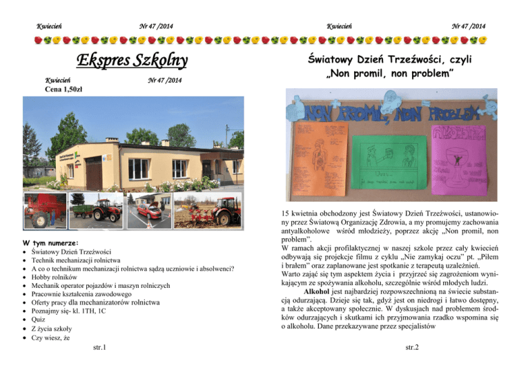 Kwiecień Nr 47 /2014 Ekspres Szkolny Kwiecień Cena 1,50zł Nr 47 /2014 W tym numerze: Światowy Dzień Trzeźwości Technik mechanizacji rolnictwa A co o technikum mechanizacji rolnictwa sądzą uczniowie i absolwenci? Hobby rolników Mechanik operator pojazdów i maszyn rolniczych Pracownie kształcenia zawodowego Oferty pracy dla mechanizatorów rolnictwa Poznajmy się- kl. 1TH, 1C Quiz Z życia szkoły Czy wiesz, że str.1 Kwiecień Nr 47 /2014 Światowy Dzień Trzeźwości, czyli „Non promil, non problem” 15 kwietnia obchodzony jest Światowy Dzień Trzeźwości, ustanowiony przez Światową Organizację Zdrowia, a my promujemy zachowania antyalkoholowe wśród młodzieży, poprzez akcję „Non promil, non problem”. W ramach akcji profilaktycznej w naszej szkole przez cały kwiecień odbywają się projekcje filmu z cyklu „Nie zamykaj oczu” pt. „Piłem i brałem” oraz zaplanowane jest spotkanie z terapeutą uzależnień. Warto zająć się tym aspektem życia i przyjrzeć się zagrożeniom wynikającym ze spożywania alkoholu, szczególnie wśród młodych ludzi. Alkohol jest najbardziej rozpowszechnioną na świecie substancją odurzającą. Dzieje się tak, gdyż jest on niedrogi i łatwo dostępny, a także akceptowany społecznie. W dyskusjach nad problemem środków odurzających i skutkami ich przyjmowania rzadko wspomina się o alkoholu. Dane przekazywane przez specjalistów str.2 Kwiecień Nr 47 /2014 nie pozwalają jednak zbagatelizować tego problemu. W Polsce żyje ok. 700-800 tys. alkoholików oraz 3 mln osób zagrożonych uzależnieniem. Każdego roku dziesiątki tysięcy osób umiera z powodu bezpośrednich lub pośrednich skutków spożycia alkoholu. Około połowy śmiertelnych wypadków drogowych oraz znaczny odsetek aktów przemocy można przypisać zmienionym, na skutek spożycia alkoholu, stanom świadomości. Ze względu na wpływ na zdrowie człowieka, alkohol został uznany przez Światową Organizację Zdrowia (WHO) za środek odurzający. Alkohol jest niewątpliwie substancją psychoaktywną, ponieważ wpływa na funkcjonowanie ośrodkowego układu nerwowego oraz może powodować uzależnienie fizyczne i psychiczne. Pomimo negatywnych konsekwencji przyjmowania alkoholu, osoby nadużywające go borykają się z trudnościami w kontrolowaniu spożycia. Następstwem jest przyzwyczajenie organizmu do substancji, co powoduje, że do osiągnięcia tego samego efektu konieczne jest stałe zwiększanie dawki. Wreszcie alkohol, jak wszystkie substancje odurzające, wpływa na życie osobiste, społeczne i rodzinne. Obserwuje się jednak coraz większe rozpowszechnienie spożycia alkoholu wśród młodzieży w wieku 15-18 lat. Do picia napojów alkoholowych przyznaje się ponad 92% uczniów III klas gimnazjalnych i ponad 96% uczniów II klas szkół średnich. Jest to niepokojące, ponieważ tak wczesny kontakt z alkoholem pociąga za sobą na ogół poważne konsekwencje (źródło: PARPA). Młodzi ludzie, którzy przechodzą inicjację alkoholową już w wieku 14 lat (lub wcześniej), są bardziej narażeni na uzależnienie, udział w wypadkach drogowych czy przypadkowe zranienia pod wpływem alkoholu. Nadmierne spożycie napojów alkoholowych w okresie dojrzewania może mieć negatywny wpływ na rozwój mózgu (np. powodować częściową utratę pamięci oraz upośledzać inne funkcje tego organu). Na ogół zakłada się, że problemem jest przede wszystkim ilość spożywanego alkoholu. W rzeczywistości nie istnieją tzw. bezpieczne dawki alkoholu, ponieważ jest on substancją toksyczną, szkodliwą w każdej ilości. Z tego powodu Światowa Organizacja Zdrowia uznaje obecnie za pozbawioną ryzyka wyłącznie abstynencję. str.3 Kwiecień Nr 47 /2014 W innych przypadkach zagrożenie dla zdrowia wzrasta proporcjonalnie do ilości spożywanego alkoholu. Wpływ alkoholu nie zależy jednak wyłącznie od jego ilości i rodzaju, lecz także od czynników indywidualnych, takich jak wiek, płeć, przynależność etniczna, waga, sposób konsumpcji (na czczo lub po posiłkach; szybko, w dużych ilościach lub w sposób rozłożony w czasie), przyzwyczajenia (spożycie codzienne lub okazjonalne), ogólny stan zdrowia i ewentualny stres oraz zmęczenie. Skutki picia alkoholu przez młodzież Dzieci i młodzież o wiele szybciej uzależniają się niż osoba dorosła. Z badań wynika, że pijąc intensywnie przed 20 rokiem życia, można uzależnić się już po kilku miesiącach, między 20 a 25 rokiem życia potrzeba na to średnio ok. 3-4 lat, a po 25 roku życia okres uzależnienia się trwa kilka a nawet kilkanaście lat. Rodzice często pozwalają dzieciom na próbowanie alkoholu i częstują ich różnymi alkoholami w wieku 7-10 lat przy różnych okazjach np. nadchodzącego Nowego Roku czy świąt rodzinnych. W większości dzieci stykają się z alkoholem przed zakończeniem 18 roku życia zwykle w przedziale 13-17 lat. Najczęściej próbują alkoholu w postaci wina, piwa oraz wódki. Wśród młodzieży widoczny jest sposób spędzania wolnego czasu (na prywatkach, dyskotekach, biwakach) z alkoholem. Jest to pewnego rodzaju sposób bycia, moda. U młodzieży bardzo ważne są następstwa psychologiczne nadużywania alkoholu będące wynikiem destrukcyjnego działania alkoholu na ośrodkowy układ nerwowy. Obserwuje się tu typowy zespół objawów: obniżenie aktywności psychicznej, brak sprawności intelektualnej, upośledzenie zdolności koncentracji uwagi, zaburzenia zapamiętywania, zwiększona męczliwość, wzmożona drażliwość i pobudliwości. Młodzież ta z reguły źle się uczy, jest niezdyscyplinowana, nadmiernie drażliwa, przez co stwarza wiele problemów rodzicom i pedagogom. Najważniejsze są jednak psychospołeczne konsekwencje picia alkoholu przez młodych ludzi. Obserwuje się bowiem u nich bardzo znamienne zaburzenia osobowości i charakteru. Problem alkoholizmu wśród młodzieży jest jednym z najważniejszych problem