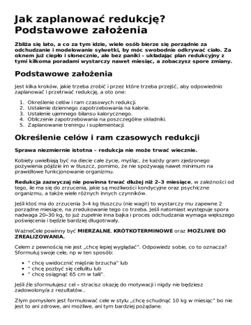 Jak zaplanować redukcję? Podstawowe założenia Zbliża się lato, a co za tym idzie, wiele osób bierze się porządnie za odchudzanie i modelowanie sylwetki, by móc swobodnie odkrywać ciało. Za oknem już ciepło i słonecznie, ale bez paniki – układając plan redukcyjny z tymi kilkoma poradami wystarczy nawet miesiąc, a zobaczysz spore zmiany. Podstawowe założenia Jest kilka kroków, jakie trzeba zrobić i przez które trzeba przejść, aby odpowiednio zaplanować i przetrwać redukcję, a oto one: 1. 2. 3. 4. 5. Określenie celów i ram czasowych redukcji. Ustalenie dziennego zapotrzebowania na kalorie. Ustalenie ujemnego bilansu kalorycznego. Obliczenie zapotrzebowania na poszczególne składniki. Zaplanowanie treningu i suplementacji. Określenie celów i ram czasowych redukcji Sprawa niezmiernie istotna – redukcja nie może trwać wiecznie. Kobiety uwielbiają być na diecie całe życie, myśląc, że każdy gram zjedzonego pożywienia pójdzie im w tłuszcz, pomimo, że nie spożywają nawet minimum na prawidłowe funkcjonowanie organizmu. Redukcja zazwyczaj nie powinna trwać dłużej niż 2–3 miesiące, w zależności od tego, ile ma się do zrzucenia, jakie są możliwości kondycyjne oraz psychiczne organizmu, a także wiele różnych innych czynników. Jeśli ktoś ma do zrzucenia 3–4 kg tłuszczu (nie wagi!) to wystarczy mu zapewne 2 porządne miesiące, na zredukowanie tego co trzeba. Jeśli natomiast występuje spora nadwaga 20–30 kg, to już zupełnie inna bajka i proces odchudzania wymaga większego poświęcenia i będzie bardziej długotrwały. WażneCele powinny być MIERZALNE, KRÓTKOTERMINOWE oraz MOŻLIWE DO ZREALIZOWANIA. Celem z pewnością nie jest „chcę lepiej wyglądać”. Odpowiedz sobie, co to oznacza? Sformułuj swoje cele, np w ten sposób: ” chcę uwidocznić mięśnie brzucha” lub ” chcę pozbyć się cellulitu lub ” chcę osiągnąć 65 cm w talii”. Jeśli źle sformułujesz cel – stracisz okazję do motywacji i nigdy nie będziesz zadowolony/a z rezultatów.. Złym pomysłem jest formułować cele w stylu „chcę schudnąć 10 kg w miesiąc” bo nie jest to ani zdrowe, ani możliwe, ani tym bardziej pożądane. Dzienne zapotrzebowania na kalorie Podstawowy krok, od którego powinno rozpocząć się jakąkolwiek dietę, zmianę nawyków żywieniowych, redukcję czy przybieranie na masie to ustalenie zapotrzebowania kalorycznego. Istnieje kilka sposobów na określenie swojego zapotrzebowania kalorycznego: a) Kalkulator CPM: Najprostszy z możliwych sposobów to użycie kalkulatora CPM (całkowitej przemiany materii). Metoda ta zawiera duży margines błędu, jednak zazwyczaj się sprawdza. Problemem jest ustalenie współczynnika aktywności, gdyż większość osób zdecydowanie go zawyża, przez co otrzymuje zafałszowany wynik.b) b) Wzór: Zdecydowanie bardziej preferuje tę metodę. Początkowo należy ustalić PPM (podstawową przemianę materii): dla mężczyzn 20–34 lata: PPM = Waga ciała x 24 dla mężczyzn powyżej 35 lat: PPM = Waga ciała x 21,6 dla kobiet 20–34 lata: PPM = Waga ciała x 21,6 dla kobiet powyżej 35 lat: PPM = Waga ciała x 19,2 Następnie należy pomnożyć wynik przez współczynnik aktywności, który zazwyczaj, dla każdej przeciętnej osoby prowadzącej normalny tryb życia i ćwiczącej 3–4 razy w tygodniu rekreacyjnie – wynosi 1,4–1,5. Otrzymany wynik jest naszym przybliżonym DZIENNYM ZAPOTRZEBOWANIEM NA KALORIE. Ujemny bilans kaloryczny Prosta sprawa, od otrzymanego CPM z poprzedniego punktu odejmujemy początkowo 15% i tym sposobem otrzymujemy nasze zapotrzebowanie na redukcję. W planowaniu każdej diety bilans energetyczny odgrywa istotną rolę. Lepiej zacząć od odjęcia mniejszej ilości kalorii i dopiero, gdy złapie nas stagnacja i waga przestanie spadać – powoli odcinać kalorie. Lepiej wyciągnąć maksymalnie dużo z diety, a aeroby traktować tylko jako narzędzie pomocnicze. Istotnym elementem planowania redukcji, jest również nasz typ budowy – jeśli należymy do endomorfików i łatwo przybieramy tkankę tłuszczową – musimy obciąć ok. 20%, jeśli zaś jesteśmy ektomorfikami – wystarczy obciąć 10–15%. Zapotrzebowania na poszczególne składniki Wszystko zależy od tego, jaką dietę preferujemy. Osobiście uważam, że zbilansowana dieta wg. dr Johna Berardiego jest najlepszym wyjściem, dzięki któremu nie możemy pominąć etapu testowania na sobie, jak działają na nas węglowodany. Dieta Berardiego polega na unikaniu łączeniu tłuszczów i węglowodanów w jednym posiłku. Idealnie nadaje się do redukcji tkanki tłuszczowe. Warto zastosować przykładowe jadłospisy i przekonać się na własnej skórze. Świetnie nadają się zarówno dla osób, które dopiero zaczynają swoją przygodę z treningami, dla biegaczy jak i dla trenujących sporty siłowe. Obliczanie poszczególnych składników krok po kroku: 1. obliczamy ilość białka – zazwyczaj najlepszą ilością jest 2–3 g/kg dla osób trenujących (w zależności od intensywności treningów) i ok 1,2–1,8 g/kg dla osób nietrenujących. 2. obliczamy ilość tłuszczów – zazwyczaj jest to 1 g/kg 3. resztę kalorii, których nam brakuje do naszego zapotrzebowania na redukcję uzupełniamy węglowodanami. Pamiętamy, że 1 g węglowodanów oraz 1 g białka to 4 kcal, natomiast 1 g tłuszczu dostarcza nam 9 kcal. przykład: kobieta 60 kg – zapotrzebowanie na redukcję 1600kcal białko 2 x 60 = 120g (120 x 4 kcal = 480kcal) tłuszcze 1 x 60 = 60 g (60 x 9 kcal = 540 kcal) węglowodany (540kcal+480kcal = 1020kcal , 1600kcal–1020kcal = 580kcal) 580kcal/4kcal = 145g Można również w zależności od samopoczucia wprowadzić carb cycling, pamiętając jednak by tygodniowy bilans kaloryczny wciąż był ujemny. Trening i suplementacja Tematyka bardzo obszerna i wymagająca większej ilości czasu, aby wszystko opisać, jednak generalnie zasada wymaga co najmniej 3 