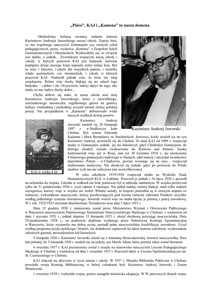 „Pióro”, KAJ i ,,Kamena” to nasza domena Obchodzimy kolejną rocznicę nadania imienia Kazimierza Andrzeja Jaworskiego naszej szkole. Zapyta ktoś, co ma wspólnego nauczyciel Gimnazjum czy różnych szkół pedagogicznych, poeta, wydawca „Kameny” z Zespołem Szkół Gastronomicznych i Hotelarskich. Wydawałoby się, ze związek jest daleki, a jednak... Zwornikiem wiążącym naszą szkołę i szkoły, w których pracował KAJ jest budynek, któremu poplątane dzieje naszego kraju napisały różne koleje losu. Był tu więc i klasztor, i szkoła dla rosyjskich panien, i siedziby władz austriackich, czy niemieckich, i szkoły w których pracował KAJ. Nadszedł jednak czas, że teraz my tutaj urzędujemy. Różne więc duchy błąkają się po salach tego budynku – i dobre i złe. Oczywiście, należy dążyć do tego, aby miały na nas wpływ duchy dobre... Chyba dobrze się stało, że nasza szkoła nosi imię Kazimierza Andrzeja Jaworskiego, który z niewielkiego, zaściankowego miasteczka, zagubionego gdzieś na granicy kultury wschodniej i zachodniej uczynił niemal stolicę polskiej poezji. Nie przypadkiem w „Kamenie” debiutowało wielu naszych wielkich dzisiaj poetów. Kazimierz Andrzej Jaworski urodził się 28 listopada 1897 r. w Siedliszczu koło Kazimierz Andrzej Jaworski Chełma. Był synem Edwarda Kajetana i Marii Bronisławy ze Smoleńskich. Jaworscy, kiedy urodził się im syn Kazimierz Andrzej, przenieśli się do Chełma. To tutaj KAJ od 1909 r. rozpoczął naukę w Gimnazjum, jednak jej nie dokończył, gdyż Chełmskie Gimnazjum, do którego chodził, zostało ewakuowane do Rostowa nad Donem. Naukę kontynuował więc już w Rosji, tam też 30 kwietnia 1916 r., po ukończeniu 8 klasowego gimnazjum rządowego w Sumach, zdał maturę i otrzymał świadectwo dojrzałości. Potem - w Charkowie, pewnie wzorując się na ojcu - rozpoczął studiowanie medycyny. Nie ukończył jej jednak, gdyż po powrocie do Polski studiów tych mu nie zaliczono [nie nostryfikowano]. KAJ w wieku 4 lat W roku szkolnym 1919/1920 rozpoczął studia na Wydziale Nauk Humanistycznych KUL w Lublinie. Przerwał je jednak i 16 lipca 1920 r. poszedł na ochotnika do wojska. Udziału w walkach nie brał, ponieważ był w oddziale sanitarnym. W wojsku przebywał tylko do 31 października 1920 r., czyli raptem 4 miesiące. Nie pełnił żadnej ważnej funkcji, miał tylko stopień szeregowca, kariery więc w wojsku nie zrobił. Władze uznały, że krajowi potrzebni są w równym stopniu co żołnierze, wykształceni nauczyciele, którzy przebywających pod trzema różnymi zaborami Polaków uczyliby według jednolitego systemu oświatowego. Jaworski wrócił więc na studia łącząc je później z pracą zawodową. W r. szk. 1922/1923 otrzymał absolutorium. Świadectwo nosi datę 3 lipca 1923 r. Dnia 15 grudnia 1920 r. mianowany został przez Ministerstwo Wyznań i Oświecenia Publicznego w Warszawie nauczycielem Państwowego Seminarium Nauczycielskiego Męskiego w Chełmie, z ważnością od dnia 1 stycznia 1921 r., jednak dopiero 15 listopada 1923 r. złożył służbową przysięgę nauczycielską. Dnia 29 października 1928 r., na podstawie dyplomu wydanego przez Państwową Komisję Egzaminacyjną w Warszawie, która wystawiła mu dobrą ocenę, posiadł pełne nauczycielskie kwalifikacje zawodowe. Uczył według programu języka polskiego i historii, ale dodatkowo zajmował się także teatrem szkolnym, wydawaniem szkolnych gazetek, prowadzeniem kół literackich. 9 listopada 1926 r. Kazimierz Jaworski ożenił się z Antoniną Monczakowską, również nauczycielką. Dwa lata później, bo 5 listopada 1928 r. urodził się im jedyny syn Marek Adam, który później także został literatem. 6 września 1937 r. KAJ przeniesiony został z urzędu na stanowisko nauczyciela Liceum Pedagogicznego Męskiego w Chełmie z ważnością od dnia 1 września 1937 r. Pracował także w Liceum Ogólnokształcącym im. St. Czarnieckiego w Chełmie. KAJ włączał się aktywnie w życie miasta i szkoły. W 1937 r. Miejska Biblioteka Publiczna w Chełmie powołała swoją Komisję Biblioteczną, w której członkami byli: Kazimierz Andrzej Jaworski i Zenon Waśniewski. 1 września 1939 r. wybuchła wojna, potem nastąpiła niemiecka okupacja. W W pierwszych dniach wojny niektóre chełmskie szkoły rozpoczęły normalną naukę, ale wkrótce, z nakazu władz okupacyjnych, zaprzestano nauczania na poziomie średnim, zaś na poziomie podstawowym program nauczania został mocno ograniczony. KAJ podjął się wówczas tajnego nauczania. Długo to nie trwało, ponieważ już 20 czerwca 1940 r. został aresztowany przez gestapo. Trafił najpierw do Zamku Lubelskiego, potem zaś do obozu koncentracyjnego w Sachsenhausen koło Berlina. 2 lutego 1942 r. wypuszczony został na wolność. Po powrocie zamieszkał w aptece swego wuja Stefana Iwanowskiego w Sawinie, gdzie podjął oficjalnie pracę księgowego, ale faktycznie poświęcił się tajnemu nauczaniu. 25 lipca 1944r. Kazimierz Andrzej Jaworski w Chełmie, przygotowywał się do do objęcia posady nauczyciela. Od 1 września 1944 r. rozpoczął pracę w chełmskim Liceum Pedagogicznym, gdzie pracował do 1949 r. Po przejściu na emeryturę przeniósł się do Lublina. W Lublinie całkowicie poświęcił się pracy literackiej zajmując stanowiska w różnych jednostkach pracujących na rzecz kultury. Od 1953 do 1964 r. był kierownikiem artystycznym „Artosu” i „Estrady” w Lublinie. Współpracował z „Kurierem Lubelskim” i „Sztandarem Ludu”, gdzie prowadził działy literackie. Zmarł 6 września 1973 r. Pochowany został w Lublinie na cmentarzu przy ul. Lipowej. Talenty artystyczne odziedziczył KAJ najprawdopodobniej po matce, uzdolnionej pianistce i dobrze zapowiadającej się śpiewaczce, która niestety nie potrafiła wybić się na wyżyny w prowincjonalnych miasteczkach. Udało się natomiast wejść na szczyty literackiego p