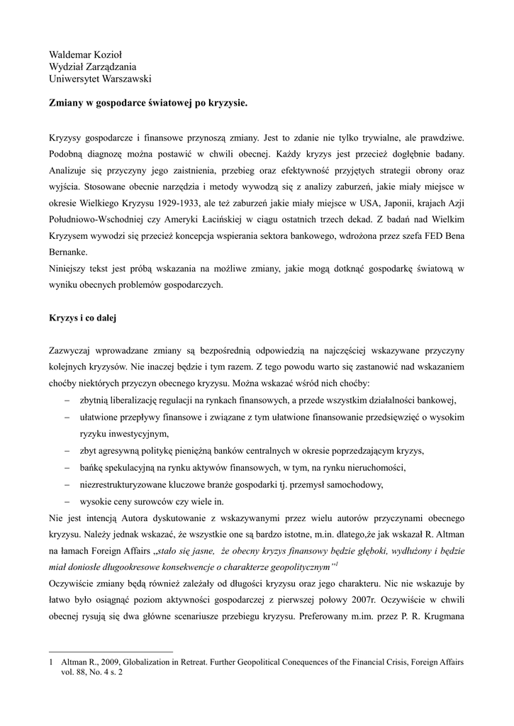 Waldemar Kozioł Wydział Zarządzania Uniwersytet Warszawski Zmiany w gospodarce światowej po kryzysie. Kryzysy gospodarcze i finansowe przynoszą zmiany. Jest to zdanie nie tylko trywialne, ale prawdziwe. Podobną diagnozę można postawić w chwili obecnej. Każdy kryzys jest przecież dogłębnie badany. Analizuje się przyczyny jego zaistnienia, przebieg oraz efektywność przyjętych strategii obrony oraz wyjścia. Stosowane obecnie narzędzia i metody wywodzą się z analizy zaburzeń, jakie miały miejsce w okresie Wielkiego Kryzysu 1929-1933, ale też zaburzeń jakie miały miejsce w USA, Japonii, krajach Azji Południowo-Wschodniej czy Ameryki Łacińskiej w ciągu ostatnich trzech dekad. Z badań nad Wielkim Kryzysem wywodzi się przecież koncepcja wspierania sektora bankowego, wdrożona przez szefa FED Bena Bernanke. Niniejszy tekst jest próbą wskazania na możliwe zmiany, jakie mogą dotknąć gospodarkę światową w wyniku obecnych problemów gospodarczych. Kryzys i co dalej Zazwyczaj wprowadzane zmiany są bezpośrednią odpowiedzią na najczęściej wskazywane przyczyny kolejnych kryzysów. Nie inaczej będzie i tym razem. Z tego powodu warto się zastanowić nad wskazaniem choćby niektórych przyczyn obecnego kryzysu. Można wskazać wśród nich choćby: zbytnią liberalizację regulacji na rynkach finansowych, a przede wszystkim działalności bankowej, ułatwione przepływy finansowe i związane z tym ułatwione finansowanie przedsięwzięć o wysokim ryzyku inwestycyjnym, zbyt agresywną politykę pieniężną banków centralnych w okresie poprzedzającym kryzys, bańkę spekulacyjną na rynku aktywów finansowych, w tym, na rynku nieruchomości, niezrestrukturyzowane kluczowe branże gospodarki tj. przemysł samochodowy, wysokie ceny surowców czy wiele in. Nie jest intencją Autora dyskutowanie z wskazywanymi przez wielu autorów przyczynami obecnego kryzysu. Należy jednak wskazać, że wszystkie one są bardzo istotne, m.in. dlatego,że jak wskazał R. Altman na łamach Foreign Affairs „stało się jasne, że obecny kryzys finansowy będzie głęboki, wydłużony i będzie miał doniosłe długookresowe konsekwencje o charakterze geopolitycznym”1 Oczywiście zmiany będą również zależały od długości kryzysu oraz jego charakteru. Nic nie wskazuje by łatwo było osiągnąć poziom aktywności gospodarczej z pierwszej połowy 2007r. Oczywiście w chwili obecnej rysują się dwa główne scenariusze przebiegu kryzysu. Preferowany m.im. przez P. R. Krugmana 1 Altman R., 2009, Globalization in Retreat. Further Geopolitical Conequences of the Financial Crisis, Foreign Affairs vol. 88, No. 4 s. 2 jeszcze w artykule z 19992 scenariusz długotrwałego przebywania w tzw. „pułapce płynności” (ang. liquidity trap) i utrzymującego się silnego zaangażowania państwa, choćby w postaci długoterminowej pomocy dla instytucji finansowych, oraz pojawiająca się coraz częściej koncepcja szybkiego odzyskania zdolności prowadzenia polityki pieniężnej poprzez szybkie wyjście z pułapki płynności (rys. 1). Rys. 1. Strategie wyjścia z kryzysu ΔPKB t Linią ciągłą oznaczono strategię „japońską” Linią przerywaną strategię „szybkiego wyjścia” z pułapki płynności Źródło: Opracowanie Autora W przypadku pierwszej z tych strategii będziemy mieli do czynienia z długim okresem stagnacji gospodarczej podobnym do doświadczeń japońskich z ostatnich 10-15 lat, w drugim z pewną drugą falą kryzysu (choćby w wyniku gwałtownego podniesienia stóp procentowych). Jednakże oba nie pozostaną bez konsekwencji dla gospodarki światowej i funkcjonujących w nich podmiotów. Warto więc bliżej przyjrzeć się poszczególnym procesom, które mogą wystąpić w gospodarce światowej, tym bardziej, że najbliższe lata w oczekiwaniach wielu specjalistów można będzie określić jako „wiek niestabilności”3. Globalizacja - czy i jaki charakter W chwili obecnej widoczne jest wyraźne spowolnienie procesów globalizacyjnych. Jeszcze dwa lata temu, choć po 2001r. wyraźnie proces ten uległ spowolnieniu, to wydawało się, że nie jest zagrożony przynajmniej na płaszczyźnie gospodarczej. 2 Krugman P.R., 1999, The Return of Depression Economics, Foreign Affairs, vol 78, No.1 3 Określenia tego użyto w „Foreign Policy” March/April 2009 , dla łącznego określenia kliku procesów o charakterze społeczno-ekonomiczno-politycznym – przyp. Autora W chwili obecnej wyraźnie widać sygnały o odwróceniu globalizacji4. Spadają obroty handlu międzynarodowego, wyhamowano procesy liberalizacji i deregulacji rynków (obserwujemy powolny proces reregulacji rynków, przede wszystkim rynku finansowego), problemy gospodarcze zmuszają coraz większą grupę państw wysokorozwiniętych (na których oparty był przecież proces globalizacji) do zwiększenia skali interwencjonizmu5. Jak pisze Altman „era lesseferyzmu się kończy”6. Będące pod coraz większą kontrolą państwa, pochłonięte procesami restrukturyzacyjnymi gospodarki krajów wysokorozwiniętych nie będą z taką siłą dążyć do umiędzynarodowienia. W końcu skala umiędzynarodowienia systemów finansowych zmusiła USA czy Wielką Brytanię do utrzymywania w systemie aktywów posiadanych przez instytucje z innych krajów co jak pokazały ostatnie miesiące jest bardzo kosztowne. Łącznie FED, administracja i FDIC „wpompowały” w system ok. 13 bln USD, a więc nieomal tyle i wynosiło PKB USA. To nie wszystko, należy bowiem wskazać, że straty nieamerykańskich instytucji bankowych na aktywach ulokowanych w USA przekroczyły 1 bln USD, przecież ponad 50% aktywów brytyjskiego systemu bankowego pochodziło spoza Wielkiej Brytanii. Czy wobec tego najbogatsze państwa stać na takie globalne umiędzynarodowienie? Wydaje się, że przynajmniej na chwilę obecną nie. Dodatkowo dotychczasowe podejście wydaje się mało aktualne. Wskazują na to choćby rozważania