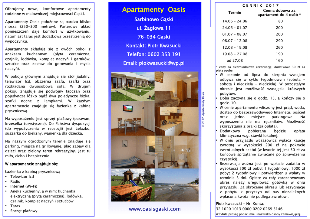 Oferujemy nowe, komfortowe apartamenty rodzinne w malowniczej miejscowości Gąski. Apartamenty Oasis położone są bardzo blisko morza (250-300 metrów). Parterowy układ pomieszczeń daje komfort w użytkowaniu, natomiast taras jest dodatkową przestrzenią do wypoczynku. Apartamenty składają się z dwóch pokoi z aneksem kuchennym (płyta ceramiczna, czajnik, lodówka, komplet naczyń i garnków, sztućce oraz zestaw do gotowania i mycia naczyń). Apartamenty Oasis Sarbinowo Gąski 14.06 – 24.06 180 ul. Żaglowa 11 24.06 – 01.07 200 01.07 – 08.07 260 08.07 – 12.08 290 12.08 – 19.08 260 19.08 - 27.08 190 od 27.08 160 76-034 Gąski Kontakt: Piotr Kwasucki Telefon: 0602 353 191 Email: [email protected] W pokoju głównym znajduje się stół jadalny, telewizor lcd, obszerna szafa, szafki oraz rozkładana dwuosobowa sofa. W drugim pokoju znajduje się podwójny tapczan oraz pojedyncze łóżko bądź dwa pojedyncze łóżka, szafki nocne z lampkami. W każdym apartamencie znajduje się łazienka z kabiną prysznicową. * ceny za siedmiodniową rezerwację; dodatkowe 30 zł za piatą osobę © 2017 Apartamenty Oasis ● Na wyposażeniu jest sprzęt plażowy (parawan, krzesełka turystyczne). Do Państwa dyspozycji (do wypożyczenia w recepcji) jest żelazko, suszarka do bielizny, wanienka dla dziecka. ● ● ● Na naszym ogrodzonym terenie znajduje się parking, miejsce na grillowanie, plac zabaw dla dzieci oraz zielony teren rekreacyjny. Jest tu miło, cicho i bezpiecznie. ● W apartamencie znajduje się: Łazienka z kabiną prysznicową ● Telewizor lcd ● Radio ● Internet (Wi-Fi) ● Aneks kuchenny, a w nim: kuchenka elektryczna (płyta ceramiczna), lodówka, czajnik, komplet naczyń i sztućców ● Taras ● Sprzęt plażowy CENNIK 2017 Cenna dobowa za Termin apartament do 4 osób * ● www.oasisgaski.com W sezonie od lipca do sierpnia wynajem odbywa się w cyklu tygodniowym (sobota – sobota i niedziela - niedziela). W pozostałym okresie jest możliwość wynajęcia krótszych pobytów. Doba zaczyna się o godz. 15, a kończy się o godz. 10. W cenie apartamentu wliczony jest prąd, woda, dostęp do bezprzewodowego Internetu, pościel oraz jedno miejsce parkingowe. Na wyposażeniu nie ma ręczników. Możliwość skorzystania z pralki (za opłatą). Dodatkowo pobierana będzie opłata klimatyczna w.g. stawki lokalnej. W dniu przyjazdu wczasowicz wpłaca kaucję zwrotną w wysokości 200 zł na pokrycie ewentualnych szkód (w kwocie tej jest 50 zł za końcowe sprzątanie zwracane po sprawdzeniu czystości). Rezerwacja ważna jest po wpłacie zadatku w wysokości 500 zł pobyt 1 tygodniowy, 1000 zł pobyt 2 tygodniowy i potwierdzeniu wpłaty w terminie 3 dni. Opłatę za cały zarezerwowany okres należy uregulować gotówką w dniu przyjazdu. Za skrócenie okresu lub rezygnację z pobytu z przyczyn od nas niezależnych wpłacona kwota nie podlega zwrotowi. Piotr Kwasucki - Nr. Konta: 32 1020 1013 0000 0202 0269 5146 W tytule proszę podać imię i nazwisko osoby zamawiającej.
