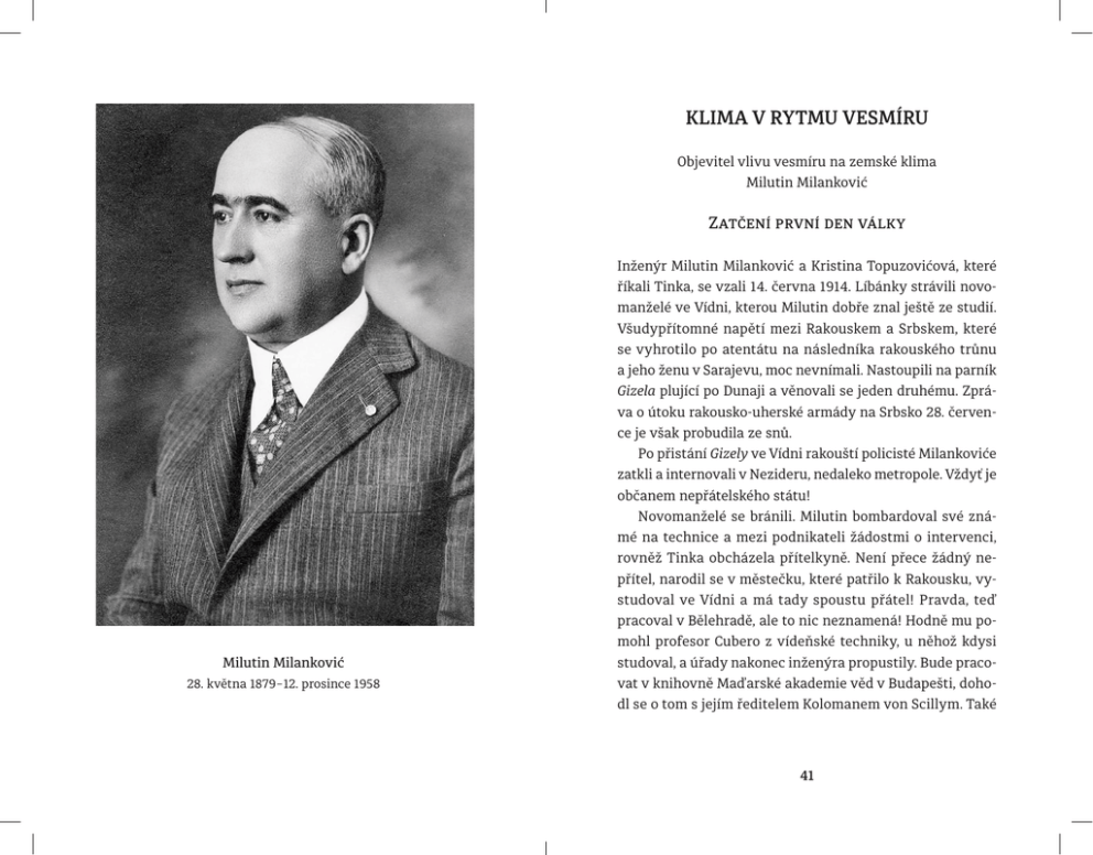 KLIMA V RYTMU VESMÍRU Objevitel vlivu vesmíru na zemské klima Milutin Milanković Zatčení první den války Milutin Milanković 28. května 1879 – 12. prosince 1958 40 Inženýr Milutin Milanković a Kristina Topuzovićová, které říkali Tinka, se vzali 14. června 1914. Líbánky strávili novo manželé ve Vídni, kterou Milutin dobře znal ještě ze studií. Všudypřítomné napětí mezi Rakouskem a Srbskem, které se vyhrotilo po atentátu na následníka rakouského trůnu a jeho ženu v Sarajevu, moc nevnímali. Nastoupili na parník Gizela plující po Dunaji a věnovali se jeden druhému. Zprá va o útoku rakousko-uherské armády na Srbsko 28. červen ce je však probudila ze snů. Po přistání Gizely ve Vídni rakouští policisté Milankoviće zatkli a internovali v Nezideru, nedaleko metropole. Vždyť je občanem nepřátelského státu! Novomanželé se bránili. Milutin bombardoval své zná mé na technice a mezi podnikateli žádostmi o intervenci, rovněž Tinka obcházela přítelkyně. Není přece žádný ne přítel, narodil se v městečku, které patřilo k Rakousku, vy studoval ve Vídni a má tady spoustu přátel! Pravda, teď pracoval v Bělehradě, ale to nic neznamená! Hodně mu po mohl profesor Cubero z vídeňské techniky, u něhož kdysi studoval, a úřady nakonec inženýra propustily. Bude praco vat v knihovně Maďarské akademie věd v Budapešti, doho dl se o tom s jejím ředitelem Kolomanem von Scillym. Také 41 ypomůže v Ústředním meteorologickém ústavu. Ale zů v stane pod dohledem. Do maďarské metropole se přestěhovala i Tinka a v pro sinci 1915 se jim tam narodilo jediné dítě, syn Basil. Milanković pokračoval ve výzkumu, který zahájil už na bělehradské univerzitě. Uvědomil si, že změny zemské ho klimatu nejsou výsledkem jakýchsi jevů týkajících se sa motné naší planety, nýbrž hluboce souvisejí s procesy kos mickými. A toto se pokoušel zjistit. Nejdřív zkoumal vývoj atmo sféry na Marsu a na Venuši. Byla to úmorná práce – všech no počítal ručně. A také paradox – zatímco miliony vojáků mrzly v zákopech a mezitím na sebe střílely, srbský badatel seděl v poklidu nad papírem v jedné ze dvou metropolí ne přátelského státu. Když skončila Velká válka a situace se trochu uklidni la, manželé Milankovićovi se vrátili do Bělehradu, hlavního města nového státu Jugoslávie. Milutin Milanković pocházel z bohaté srbské rodiny, která se do Srbska přestěhovala z Kosova na konci 17. století. Otec Milan byl obchodník a statkář, děda významný filozof. Milu tin se narodil 28. května 1879 v městečku Daly (Dalj) u Oseku ve východním Chorvatsku na hranici se Srbskem. Aby nemusel docházet do základní školy, obstarali mu rodiče domácí učitele. Byl zvídavý, hodně se naučil sám, avšak když mu bylo osm let, otec zemřel a tíha rodiny pře šla na matku Elizabeth. Také strýc Vasa Muačević pomáhal. „Miloval jsem chvíle, kdy jsem seděl na břehu Dunaje a sledoval protější břeh,“ vyznával se později. „Také jsem rád pozoroval noční oblohu. Ty planety a hvězdy byly nádherné.“ V deseti letech se přestěhoval do Bělehradu, musel na stoupit na střední školu. Rovněž jeho bratři a sestry. „Brzy jsem si uvědomil své nedostatky, které vyplynuly z mého předchozího soukromého vzdělávání. Ostatní děti uměly mnohem lépe číst než já. Psaly krásným rukopisem a uměly rychle počítat.“ Naštěstí měl výbornou paměť, zapamatoval si učitelův výklad, aniž se musel doma učit. Brzy se z něj stal premiant třídy. A když se některý spolužák dostal při zkou šení nebo písemných testech do obtíží, snažil se mu pošep tat správné odpovědi. Koncem května 1896 ukončil sedmnáctiletý Milutin střed ní školu. Zesnulý otec si přál, aby převzal jeho statek, stal se rolníkem, avšak chlapce fascinovala matematika. Půjde do Vídně na techniku! Peníze, které mu odkázal otec, na studium postačí. Přemýšlel o elektrotechnice, ale pak dal přednost stavařině. Jako inženýr se uživí, kdežto ma tematika je hladové řemeslo. Na stavební fakultě byla řada znamenitých učitelů, matematiku přednášel vynikajícím způsobem profesor Emanuel Cubero. Tento matematik brzy rozpoznal mladíkův talent a snažil se ho rozvíjet. Milutin nejen pilně studoval, ale účastnil se spolu se svý mi spolužáky též všech zábav a taškařic. Jednu dobu se úzce přátelil s Italkou Alicí, ale jejich vztah se pro něj ukázal jako finančně náročný, proto ho musel ukončit. 42 43 Stavitel betonových mostů a přehrad Získal titul inženýra, ale protože technika měla právo udělovat i doktorát, zůstal tam ještě dva roky. Dizertaci na zvanou Beitrag zur Theorie der Druck-kurven (Příspěvek k te orii tlakových křivek) skvěle obhájil 12. prosince 1904. Stal se prvním Srbem, který získal doktorát v technických vědách, a o nadaného inženýra s doktorátem měly zájem velké firmy. Milanković zakotvil u vídeňského podnikatele barona Adol fa Pittela, který se specializoval na betonové stavby. Mladý konstruktér řídil budování řady mostů, viadukty, akvadukty a přehrady po celém rakousko-uherském mocnářství. V Bě lehradě vedl stavbu kanalizace, přitom ale nezanedbával ani milovanou matematiku a vymyslel soubor základních rov nic pro určení vyztužení betonových nosníků staveb, připra voval železobetonovou konstrukci nového křídla Technic ké univerzity ve Vídni. Získal šest patentů na nové stavební postupy a velice rychle získával reputaci v celé monarchii. Milutin Milanković tvrdil, že ledové doby se na Zemi vracejí ve třech cyklech: po 100 tisíci letech, po 42 tisíci letech a po 21 tisíci letech. Vycházel z předpokladu, že základem klimatu jsou změny slunečního záření. Úspěchy v rakou