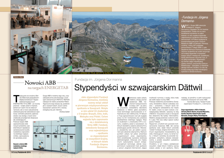 Wydarzenia »Fundacja im. Jürgena Dormanna« W 2007 r. Grupa ABB utworzyła Fundację im. Jürgena Dormanna z kapitałem 20 mln franków szwajcarskich. Działa ona na rzecz kształcenia inżynierów na całym świecie: co roku wypłaca stypendia utalentowanym studentom kierunków technicznych. W Polsce inicjatywa ta koordynowana jest przez Centrum Badawcze ABB w Krakowie. Pierwszą uczelnią, z którą JDF podpisała porozumienie (7 lutego 2008 r.), była Akademia Górniczo-Hutnicza w Krakowie. Ośmioro studentów tej uczelni otrzymuje od fundacji stypendia w wysokości tysiąca złotych miesięcznie. Dodatkowo, każdy jednorazowo otrzymał 3 tys. zł na zakup komputera. Stypendyści są również objęci indywidualną opieką mentora, pracownika Centrum Badawczego – specjalisty w dziedzinie danego kierunku studiów. Co roku do fundacji dołączają kolejni beneficjenci wyłonieni w drodze konkursu. KOLEJKA GÓRSKA NA TITLIS, SZCZYT W ALPACH BERNEŃSKICH Bielsko-Biała Nowości ABB na targach ENERGETAB Fot na kolumnach: Andrzej Gabler/Arch. ABB; Karolina Stachnik T radycyjnie we wrześniu Bielsko-Biała była gospodarzem Międzynarodowych Targów Elektroenergetycznych ENERGETAB. Firma ABB – po rocznej przerwie – wzięła udział w imprezie, jednak tym razem nie we własnym namiocie, ale w nowo wybudowanej wielofunkcyjnej hali widowiskowo-sportowej. Centralne położenie, piętrowe stoisko oraz dostęp z trzech stron zwiększały przystępność ekspozycji dla zwiedzających. Podczas targów ABB zaprezentowała wiele nowych produktów, spośród których największe zainteresowanie budziły rozdzielnica napowietrzna średniego napięcia UniSec, wprowadzona do sprzedaży przez Nowość w ofercie ABB: rozdzielnica średniego napięcia UniSec 8 Dzisiaj Październik 2010 Grupę ABB w kwietniu tego roku, oraz zabezpieczenia pola liniowego z funkcjami sterowniczymi REF615 i REF630 należące do rodziny produktów Relion. Tegoroczne targi cieszyły się, podobnie jak w zeszłych latach, dużym zainteresowaniem zarówno firm z branży energetycznej, jak i klientów. Andrzej Gabler Fundacja im. Jürgena Dor manna Stypendyści w szwajcarskim Dättwil Jako stypendyści Fundacji Jürgena Dormanna, mieliśmy szansę wziąć udział w pierwszym międzynarodowym spotkaniu w Szwajcarii. Wzięło w nim udział 34 studentów z 5 krajów: Brazylii, Chin, Indii, Meksyku oraz Polski. Celem wyjazdu było zapoznanie się z działalnością firmy ABB i fundacji, zwiedzenie Szwajcarii oraz najważniejsze – spotkanie ze stypendystami ze wszystkich krajów, w których działa Fundacja Jürgena Dormanna. W pierwszej części pobytu mieliśmy okazję poznać działalność ABB, mechanizm funkcjonowania Fundacji JDF i jej plany na przyszłość. Zwiedziliśmy laboratoria badawcze w Dättwil, gdzie poznaliśmy nowe technologie wykorzystywane w infrastrukturze sieci elektrycznej. W fabryce w Turgi zaprezentowano nam jak wygląda praca na linii montażowej przy produkcji przekładników średniego napięcia. Wraz ze studentami z uniwersytetu ETH w Zurychu, wzięliśmy udział w warsztatach, na których dostaliśmy zadanie założenia firmy produkującej panele słoneczne. Warsztaty uświadomiły nam, jak wielkim wyzwaniem jest założenie własnej firmy. Ważnym punktem pobytu był pokaz prezentacji przygotowanych przez stypendystów, które przedstawiały wyzwania światowej elektroenergetyki. Dotyczyły one między innymi wykorzystania nowych energooszczędnych technologii. Jednak niezapomnianym wydarzeniem było spotkanie z samym Jürgenem Dormannem, dające możliwość rozmowy z osobą, która miała tak wielki wpływ na losy ABB. Podczas weekendu poznawaliśmy Szwajcarię. Zwiedziliśmy fabryki czekolady oraz sera – produktów, z których słynie ten kraj. Następnie odwiedziliśmy też miasto St. Gallen, znane na całym świecie z benedyktyńskiej biblioteki, wpisanej na listę UNESCO. Oczywiście wizyta w Szwajcarii bez obejrzenia Alp byłaby niekompletna. Mieliśmy okazję podziwiać cudowne widoki z góry Titlis oraz odbyć spacer wzdłuż jeziora Trübsee. Wyjazd ten umożliwił nam poznanie funkcjonowania korporacji ABB, dał szansę spotkania ludzi, dzięki którym powstała i działa Fundacja Jürgena Dormanna oraz innych stypendystów. Dowiedzieliśmy się wielu interesujących rzeczy na temat kultur, z których wywodzą się pozostali stypendyści, zdobyliśmy ciekawe doświadczenia, a przede wszystkim zyskaliśmy nowych przyjaciół. Chcieliśmy w tym miejscu podziękować wszystkim, dzięki którym mieliśmy szansę wzięcia udziału w tym spotkaniu. Mamy nadzieję, że potrafimy w pełni wykorzystać możliwości stwarzane nam przez ABB. Kamila Biernacka, Norbert Kuder, stypendyści Fundacji im. J. Dormanna Grupa stypendystów z AGH w Krakowie. Od lewej: Marcin Okarma, Krzysztof Mięsowicz, Karolina Stachnik, Norbert Kuder, Kamila Biernacka, Grzegorz Ważny, Paweł Bajerski. Październik 2010 Dzisiaj 9