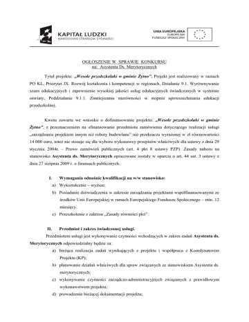 OGŁOSZENIE W SPRAWIE KONKURSU na: Asystenta Ds. Merytorycznych Tytuł projektu: „Wesołe przedszkolaki w gminie Żytno”. Projekt jest realizowany w ramach PO KL, Priorytet IX. Rozwój kształcenia i kompetencji w regionach, Działanie 9.1. Wyrównywanie szans edukacyjnych i zapewnienie wysokiej jakości usług edukacyjnych świadczonych w systemie oświaty, Poddziałanie 9.1.1. Zmniejszanie nierówności w stopniu upowszechniania edukacji przedszkolnej. Kwota zawarta we wniosku o dofinansowanie projektu: „Wesołe przedszkolaki w gminie Żytno”, z przeznaczeniem na sfinansowanie przedmiotu zamówienia dotyczącego realizacji usługi „zarządzania projektem innym niż roboty budowlane” nie przekracza wyrażonej w zł równowartości 14 000 euro, toteż nie stosuje się dla wyboru wykonawcy przepisów właściwych dla ustawy z dnia 29 stycznia 2004r. - Prawo zamówień publicznych (art. 4 pkt 8 ustawy PZP). Zasady naboru na stanowisko Asystenta ds. Merytorycznych opracowane zostały w oparciu o art. 44 ust. 3 ustawy z dnia 27 sierpnia 2009 r. o finansach publicznych. I. Wymagania odnośnie kwalifikacji na w/w stanowisko: a) Wykształcenie – wyższe; b) Posiadanie doświadczenia w zakresie zarządzania projektami współfinansowanymi ze środków Unii Europejskiej w ramach Europejskiego Funduszu Społecznego – min. 12 miesięcy. c) Przeszkolenie z zakresu „Zasady równości płci”. II. Przedmiot i zakres świadczonej usługi. Przedmiotem usługi jest wykonywanie czynności wchodzących w zakres zadań Asystenta ds. Merytorycznych odpowiedzialny będzie za: a) bieżąca realizacja zadań wynikających z projektu i współpraca z Koordynatorem Projektu (KP); b) planowanie działań właściwych dla spraw związanych ze stanowiskiem Asystenta ds. merytorycznych; c) wykonywanie czynności zarządczo-administracyjnych związanych z prawidłowym wykonawstwem projektu; d) prowadzenie bieżącej dokumentacji projektu; e) sporządzanie cyklicznych sprawozdań z realizacji poszczególnych etapów projektu przy współudziale KP, f) sporządzanie PEFS; g) sporządzanie bazy o przebiegu projektu; h) monitoring zajęć i uczestników projektu, w tym ankietowanie; i) współpraca z Zespołem Projektowym; j) wspieranie KP w podejmowanych przez niego działaniach na rzecz sprawnej realizacji założeń projektowych; k) okresowy audyt dokumentacji projektowej w celu zabezpieczenia prawidłowej realizacji projektu, w tym zgłaszanie KP o stanach faktycznych niezgodnych z prawem, oraz eliminacja możliwości wystąpienia zagrożeń (także potencjalnych i przyszłych); l) prowadzenie dokumentacji merytorycznej, w tym kontrola jej stanu archiwizacji; m) przygotowywanie raportów merytorycznych o stanie prac związanych z projektem na żądanie KP; n) przestrzeganie procedur i instrukcji związanych z realizacją projektu; o) monitoring zajęć i uczestników projektu; p) wprowadzanie zmian do wniosku; q) każdorazowe poddawanie się kontroli na wezwania instytucji (organów) kontrolnych; a) wykonywanie innych zadań, związanych z realizacją projektu, a zlecanych przez KP. b) świadczenie usługi przez 120 h miesięcznie. III. Wykaz dokumentów potwierdzających spełnianie warunków udziału w konkursie 1. Curriculum Vitae – zawierające dane personalne Kandydata, miejsce zamieszkania w tym adres do korespondenci, wykształcenie, przebieg pracy zawodowej. 2. Dokument potwierdzający wykształcenie. 3. Dokument potwierdzający posiadanie doświadczenia w zakresie zarządzania projektami współfinansowanymi ze środków Unii Europejskiej w ramach Europejskiego Funduszu Społecznego przez okres min. 12 miesięcy. 4. Dokument potwierdzający przeszkolenie z zakresu „Zasady równości płci”. IV. Opis procedury wyłania kandydata Kandydat czyniący zadość wymaganiom z pkt I i legitymujący się spełnieniem wymagań z pkt III, zaproszony zostanie do drugiego etapu konkursu tj. rozmowę kwalifikacyjną z Kandydatem, na podstawie której Komisja Konkursowa sprawdzi wiedzę i predyspozycje Kandydata w związku z potencjalnym świadczeniem przez niego usługi Asystenta ds. Merytorycznych. Pytania bezpośrednio dotyczyć będą przedmiotu świadczonej usługi określonej w pkt II. Podczas rozmowy Kandydat zostanie poproszony o przedstawienie swoich oczekiwań finansowych; w przypadku istotnych rozbieżności pomiędzy kwotą przewidzianą w budżecie projektu na wynagrodzenie Asystenta ds. Merytorycznych, a ceną podaną przez Kandydata, Beneficjent dopuszcza negocjacje w celu obniżenia ceny podanej przez Kandydata. Rozmowa kwalifikacyjna ma charakter indywidualny, tj. bierze w niej jednorazowo udział tylko jeden Kandydat. Po zakończonej ww. czynności – rozmowa kwalifikacyjna, Komisja w postępowaniu gabinetowym wyłoni zwycięzcę konkursu. Przed podjęciem decyzji o wyborze kandydata członkowie komisji ocenią oświadczenia woli i dokumenty złożone przez Kandydata w pierwszym etapie konkursu oraz przebieg rozmowy z drugiego etapu (w którym następuje podanie oczekiwań finansowych). Postępowanie gabinetowe na charakter tajny i kończy się protokołem końcowym dokumentującym przebieg konkursu. V. Pozostałe informacje dotyczące konkursu Aplikacje które wpłyną do siedziby Gminy Żytno po terminie lub będą niekompletne zostaną zwrócone bez rozpatrzenia (termin nieprzekraczalny określony w pkt VI.2). Lista Kandydatów, którzy spełnili wymagania obligatoryjne zawarte w ogłoszeniu (pkt I) umieszczona zostanie na tablicy ogłoszeń Gminy Żytno. Z Kandydatami zakwalifikowanymi do drugiego etapu zostanie nawiązany kontakt telefoniczny lub za pośrednictwem poczty elektronicznej w celu ustalenia terminu rozmowy kwalifikacyjnej. Informacje o wyniku konkursu zamieszczone zostaną na tablicy ogłoszeń Gminy Żytno. Z wybranym w toku konkursu Kandydatem zostanie zawarta umowa cywilnoprawna na okres do 9 miesięcy. Wynagrodzenie Asystenta ds. Merytorycznych będzie współf