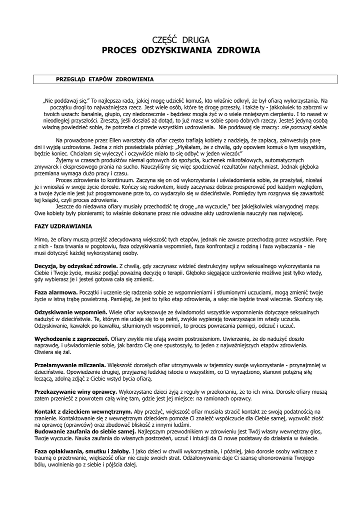 CZ DRUGA PROCES ODZYSKIWANIA ZDROWIA PRZEGL D ETAPÓW ZDROWIENIA „Nie poddawaj si .” To najlepsza rada, jakiej mog udzieli komu , kto wøa nie odkryø, e byø ofiar wykorzystania. Na pocz tku drogi to najwa niejsza rzecz. Jest wiele osób, które t drog przeszøy, i tak e ty - jakkolwiek to zabrzmi w twoich uszach: banalnie, gøupio, czy niedorzecznie - b dziesz mogøa y w o wiele mniejszym cierpieniu. I to nawet w nieodlegøej przyszøo ci. Zreszt , je li doszøa a dot d, to ju masz w sobie sporo dobrych rzeczy. Jeste jedyn osob wøadn powiedzie sobie, e potrzeba ci przede wszystkim uzdrowienia. Nie poddawaj si znaczy: nie porzucaj siebie. Na prowadzone przez Ellen warsztaty dla ofiar cz sto trafiaj kobiety z nadziej , e zapøac , zainwestuj par dni i wyjd uzdrowione. Jedna z nich powiedziaøa pó niej: „My laøam, e z chwil , gdy opowiem komu o tym wszystkim, b dzie koniec. Chciaøam si wyleczy i oczywi cie miaøo to si odby w jeden wieczór.” yjemy w czasach produktów niemal gotowych do spo ycia, kuchenek mikrofalowych, automatycznych zmywarek i ekspresowego prania na sucho. Nauczyli my si wi c spodziewa rezultatów natychmiast. Jednak gø boka przemiana wymaga du o pracy i czasu. Proces zdrowienia to kontinuum. Zaczyna si on od wykorzystania i u wiadomienia sobie, e prze yøa , niosøa je i wniosøa w swoje ycie dorosøe. Ko czy si rozkwitem, kiedy zaczynasz dobrze prosperowa pod ka dym wzgl dem, a twoje ycie nie jest ju programowane prze to, co wydarzyøo si w dzieci stwie. Pomi dzy tym rozgrywa si zawarto tej ksi ki, czyli proces zdrowienia. Jeszcze do niedawna ofiary musiaøy przechodzi t drog „na wyczucie,” bez jakiejkolwiek wiarygodnej mapy. Owe kobiety byøy pionierami; to wøa nie dokonane przez nie odwa ne akty uzdrowienia nauczyøy nas najwi cej. FAZY UZDRAWIANIA Mimo, e ofiary musz przej zdecydowan wi kszo tych etapów, jednak nie zawsze przechodz przez wszystkie. Par z nich - faza trwania w pogotowiu, faza odzyskiwania wspomnie , faza konfrontacji z rodzin i faza wybaczania - nie musi dotyczy ka dej wykorzystanej osoby. Decyzja, by odzyska zdrowie. Z chwil , gdy zaczynasz widzie destrukcyjny wpøyw seksualnego wykorzystania na Ciebie i Twoje ycie, musisz podj powa n decyzj o terapii. Gø boko si gaj ce uzdrowienie mo liwe jest tylko wtedy, gdy wybierasz je i jeste gotowa caøa si zmieni . Faza alarmowa. Pocz tki i uczenie si radzenia sobie ze wspomnieniami i støumionymi uczuciami, mog zmieni twoje ycie w istn tr b powietrzn . Pami taj, e jest to tylko etap zdrowienia, a wi c nie b dzie trwaø wiecznie. Sko czy si . Odzyskiwanie wspomnie . Wiele ofiar wykasowuje ze wiadomo ci wszystkie wspomnienia dotycz ce seksualnych nadu y w dzieci stwie. Te, którym nie udaje si to w peøni, zwykle wypieraj towarzysz ce im wtedy uczucia. Odzyskiwanie, kawaøek po kawaøku, støumionych wspomnie , to proces powracania pami ci, odczu i uczu . Wychodzenie z zaprzecze . Ofiary zwykle nie ufaj swoim postrze eniom. Uwierzenie, e do nadu y doszøo naprawd , i u wiadomienie sobie, jak bardzo Ci one spustoszyøy, to jeden z najwa niejszych etapów zdrowienia. Otwiera si al. Przeøamywanie milczenia. Wi kszo dorosøych ofiar utrzymywaøa w tajemnicy swoje wykorzystanie - przynajmniej w dzieci stwie. Opowiedzenie drugiej, przyjaznej ludzkiej istocie o wszystkim, co Ci wyrz dzono, stanowi pot n siø lecz c , zdoln zdj z Ciebie wstyd bycia ofiar . Przekazywanie winy oprawcy. Wykorzystane dzieci yj z reguøy w przekonaniu, e to ich wina. Dorosøe ofiary musz zatem przenie z powrotem caø win tam, gdzie jest jej miejsce: na ramionach oprawcy. Kontakt z dzieckiem wewn trznym. Aby prze y , wi kszo ofiar musiaøa straci kontakt ze swoj podatno ci na zranienie. Kontaktowanie si z wewn trznym dzieckiem pomo e Ci znale wspóøczucie dla Ciebie samej, wyzwoli zøo na oprawc (oprawców) oraz zbudowa blisko z innymi lud mi. Budowanie zaufania do siebie samej. Najlepszym przewodnikiem w zdrowieniu jest Twój wøasny wewn trzny gøos, Twoje wyczucie. Nauka zaufania do wøasnych postrze e , uczu i intuicji da Ci nowe podstawy do dziaøania w wiecie. Faza opøakiwania, smutku i aøoby. I jako dzieci w chwili wykorzystania, i pó niej, jako dorosøe osoby walcz ce z traum o przetrwanie, wi kszo ofiar nie czuje swoich strat. Od aøowywanie daje Ci szans uhonorowania Twojego bólu, uwolnienia go z siebie i pój cia dalej. Faza zøo ci - kr gosøup uzdrawiania. W ciekøo to pot na i wyzwalaj ca siøa. Niezale nie od tego, czy potrzebujesz dopiero skontaktowa ze swoj zøo ci , czy te masz jej w sobie wielki nadmiar, skierowanie jej prosto na oprawc (oprawców) oraz tych, którzy Ci nie chronili, jest zasadniczym zwrotem w zdrowieniu. Ujawnienie prawdy i konfrontacja. Bezpo rednia konfrontacja z oprawc (oprawcami) i/lub rodzin nie s wskazane dla ka dej ofiary, cho mog okaza si pot nym, oczyszczaj cym narz dziem w zdrowieniu. Przebaczenie? Przebaczenie oprawcy, cho niestety nadal jest powszechnie zalecanym aktem, NIE JEST istotn cz ci procesu zdrowienia. Mo e nast pi lub nie. Istotne jest, aby Ty wybaczyøa sobie. Piel gnowanie duchowo ci. Posiadanie poczucia, e jest przy Tobie Siøa Wy sza, która ci kocha i wspiera, to prawdziwy skarb w procesie zdrowienia. Duchowo jest niezwykøym i bardzo osobistym do wiadczeniem. Mo esz j odnale w twojej tradycji religijnej, w medytacji, w przyrodzie lub w twojej grupie wsparcia. Rozwi zanie i pój cie dalej. W miar jak wielokrotnego przechodzenia przez powy sze fazy, osi gasz coraz wi ksz integralno . Stabilizuj si twoje uczucia i spojrzenie na wiat. Dochodzisz do øadu ze swoim oprawc i czøonkami rodziny. Je li nie wyma esz swojej historii i nie przerwiesz tego procesu, dokonasz gø bokich i trwaøych, pozytywnych zmian w sobie i swoim yciu. Znalazøszy rozwi zanie, b dziesz mogøa i dalej i pracowa tak e nad ulepszaniem wiata. Podaøy my fazy zdrowienia w jakiej kolejno ci, ale zapewne twoja b dzie nieco inna. Rzadko przebiega to tak, e ko czysz faz pierwsz , a po 