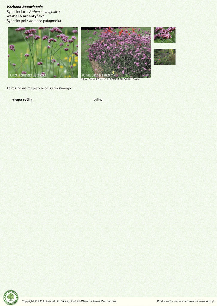 Verbena bonariensis Synonim lac.: Verbena patagonica werbena argentyńska Synonim pol.: werbena patagońska (c) fot. Gabriel Tomżyński TOMŻYŃSKI Szkółka Roślin Ta roślina nie ma jeszcze opisu tekstowego. grupa roślin byliny Copyright © 2013. Związek Szkółkarzy Polskich Wszelkie Prawa Zastrzeżone. Producentów roślin znajdziesz na www.zszp.pl