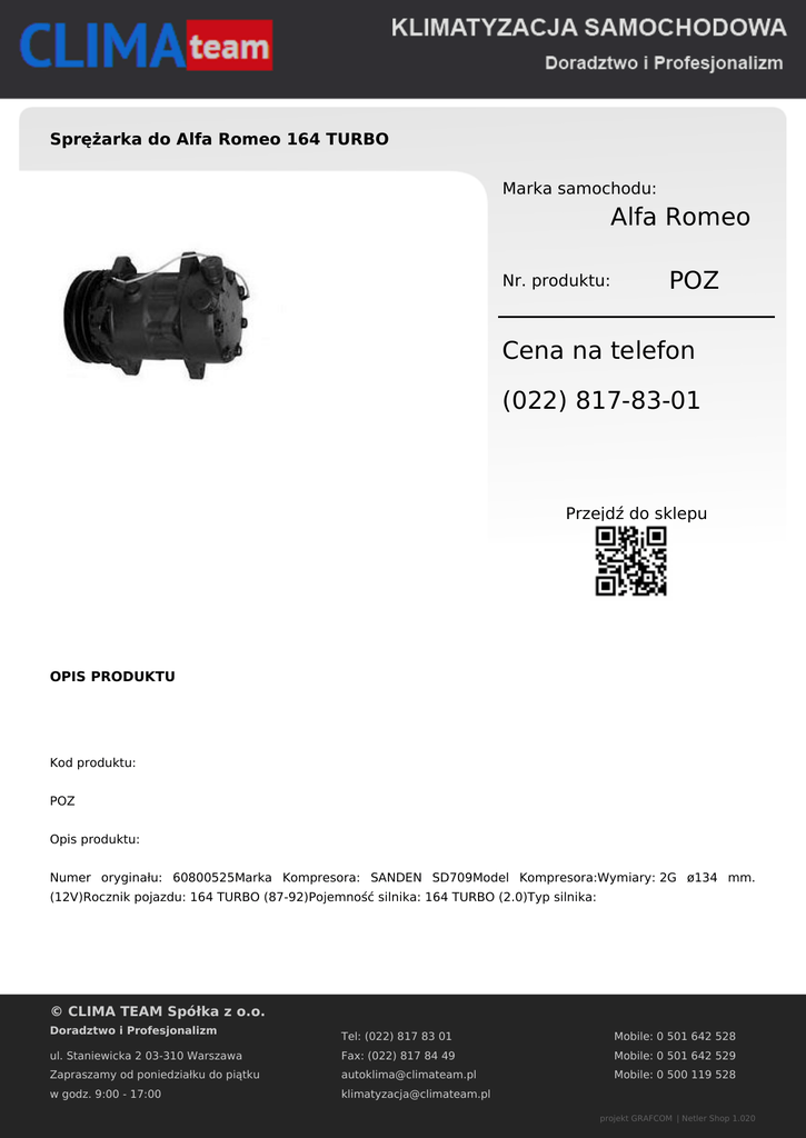 Sprężarka do Alfa Romeo 164 TURBO Marka samochodu: Alfa Romeo Nr. produktu: POZ Cena na telefon (022) 817-83-01 Przejdź do sklepu OPIS PRODUKTU Kod produktu: POZ Opis produktu: Numer oryginału: 60800525Marka Kompresora: SANDEN SD709Model Kompresora:Wymiary: 2G ø134 mm. (12V)Rocznik pojazdu: 164 TURBO (87-92)Pojemność silnika: 164 TURBO (2.0)Typ silnika: © CLIMA TEAM Spółka z o.o. Doradztwo i Profesjonalizm Tel: (022) 817 83 01 Mobile: 0 501 642 528 ul. Staniewicka 2 03-310 Warszawa Fax: (022) 817 84 49 Mobile: 0 501 642 529 Zapraszamy od poniedziałku do piątku [email protected] Mobile: 0 500 119 528 w godz. 9:00 - 17:00 [email protected] projekt GRAFCOM | Netler Shop 1.020
