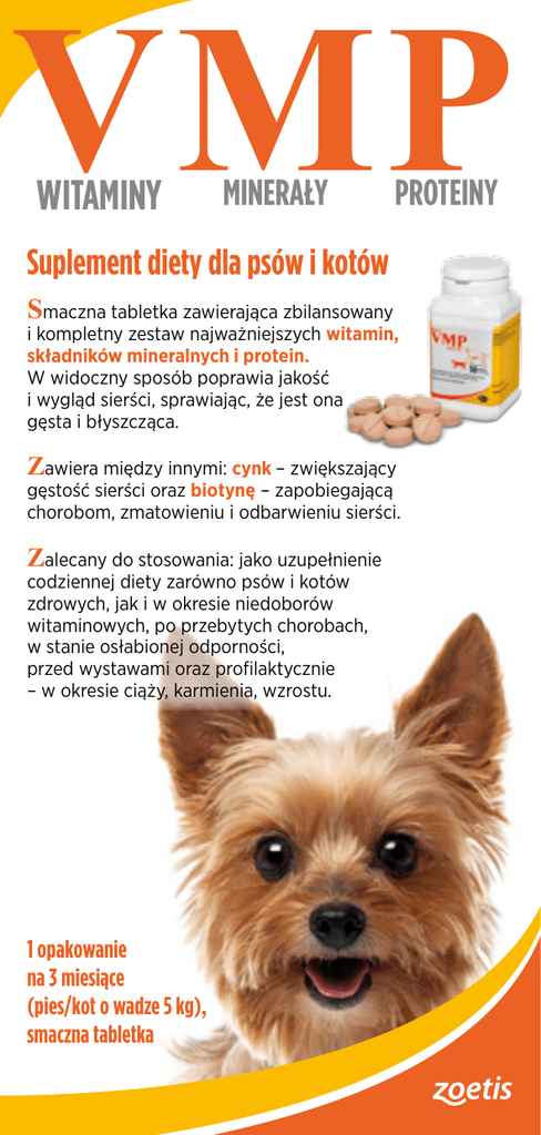 VMP WITAMINY MINERAŁY PROTEINY Suplement diety dla psów i kotów Smaczna tabletka zawierająca zbilansowany i kompletny zestaw najważniejszych witamin, składników mineralnych i protein. W widoczny sposób poprawia jakość i wygląd sierści, sprawiając, że jest ona gęsta i błyszcząca. Zawiera między innymi: cynk – zwiększający gęstość sierści oraz biotynę – zapobiegającą chorobom, zmatowieniu i odbarwieniu sierści. Zalecany do stosowania: jako uzupełnienie codziennej diety zarówno psów i kotów zdrowych, jak i w okresie niedoborów witaminowych, po przebytych chorobach, w stanie osłabionej odporności, przed wystawami oraz profilaktycznie – w okresie ciąży, karmienia, wzrostu. 1 opakowanie na 3 miesiące (pies/kot o wadze 5 kg), smaczna tabletka VMP Tabletki dla psów i kotów SKŁAD JAKOŚCIOWY I ILOŚCIOWY W 1 TABLETCE: Witamina A 1505 I.U. Witamina D3 21,5 I.U. Witamina E 4,95 mg Witamina B1 1,07 mg Witamina B2 1,07 mg Witamina B6 0,54 mg Witamina B12 1,07 μg Kwas nikotynowy 5,37 mg Kwas foliowy 0,05 mg Biotyna 25,8 μg Miedź 0,09 mg Żelazo 12,9 mg Mangan 0,21 mg Cynk 4,30 mg 30% protein, 5% tłuszczu, 28% składników mineralnych, 1% włókna, 5,4% wapnia, 4,2% fosforu oraz 1,8% magnezu WSKAZANIA DO STOSOWANIA VMP Tabletki dla psów i kotów zawierają zbilansowany zestaw witamin (V), związków mineralnych (M) i protein (P). Dlatego przeznaczone są do wzbogacania diety zwierząt w celu: • uzyskania codziennego komfortu dietetycznego • zapewnienia optymalnych warunków wzrostu i rozwoju • wzbogacenia diety podczas ciąży i laktacji • utrzymania dobrej kondycji zwierząt w podeszłym wieku • regeneracji po wzmożonym wysiłku, np. po polowaniu • zapobiegania niedoborom pokarmowym, szczególnie u młodych, rosnących zwierząt • usuwania skutków chorób niedoborowych: przywracanie normalnej postawy, pożądanego wyglądu okrywy włosowej, wigoru • usuwania skutków niedożywienia jakościowego i zaburzeń we wchłanianiu z przewodu pokarmowego • po leczeniu chorób zakaźnych, po przebytych innych chorobach DAWKOWANIE I SPOSÓB PODAWANIA Tabletki do podawania doustnego są chętnie przyjmowane przez psy i koty, ale można je mieszać z ulubioną karmą zwierzęcia. Dawkowanie – ogólnie: 1 tabletka na 10 kg wagi ciała na dzień. Dawkowanie – praktycznie: – szczeniaki, kocięta 0,5-1 tabletka/dzień – koty stosownie do wagi ciała 0,5-1 tabletka/dzień – psy mniejszych ras 1 tabletka/dzień – psy średnich ras 2-3 tabletki/dzień – psy dużych ras 4 tabletki/dzień Zoetis Polska Sp. z o.o. ul. Postępu 17 B 02-676 Warszawa +48 22 335 6109 www.zoetis.com