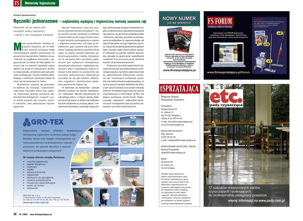 FS Materiały higieniczne Artykuł sponsorowany Ręczniki jednorazowe – najbardziej wydajną i higieniczną metodą suszenia rąk SPRZATAJACA FIRMA lozę, która pozwala na lepsze wchłanianie wilgoci co obniża zużycie, uprzyjemnia osuszanie rąk i sprawia, że cały proces przebiega szybko i skutecznie. Wymiary ręczników są dostosowane do podajników co zapewnia dostęp rąk tylko do aktualnie użytego fragmentu ręcznika. Dozownik umożliwia pobieranie po jednym listku ręcznika, dzięki czemu obniża zużycie. W zależności od potrzeb wielkość dozowników pozwala na ograniczenie częstotliwości uzupełnień a to przyczynia się do obniżenia kosztów utrzymania pomieszczeń. Producenci ręczników papierowych nieustannie pracują nad udoskonalaniem technologii produkcji ręczników papierowych tak by zoptymalizować efektywność osuszania rąk. Innowacyjne wytłaczanie ręczników lub nadmuchiwanie pulpy powoduje, że są one jeszcze bardziej delikatne dla skóry a tym samym bardziej wytrzymałe i bardziej chłonne. Przykładem tego może być ręcznik wyprodukowany w technologii „Airflex” lub klejony warstwowo „Punta Punta”. Podsumowując, najlepszym i najbardziej ekonomicznym rozwiązaniem jest oczywiście stosowanie ręczników jednorazowych. , M ycie usuwa bakterie i redukuje zagrożenie zakażenia, ale to efektywne suszenie zmniejsza liczbę mikroskopijnych bakterii pozostałych na powierzchni naszych dłoni. Niektóre wirusy i bakterie są wyjątkowo wytrzymałe i mogą przetrwać na skórze do kilku godzin. Po umyciu rąk na dłoniach pozostaje więcej bakterii niż przed ich zmoczeniem. Wynika to z tego powodu, że bakterie pod wpływem wody uwalniają się z warstw naskórka dłoni. Dlatego w niektórych sytuacjach lepiej nie umyć rąk niż pozostawić je mokre. Niewłaściwe suszenie rąk powoduje, że bakterie się rozwijają i rozprzestrzeniają toteż niezwykle ważne jest wybranie właściwego sposobu wycierania rąk. Istnieje kilka dostępnych i znanych z rynku metod suszenia rąk: suszarki, ręczniki tekstylne, oraz jednorazowe ręczniki papierowe. Ręcznik materiałowy może być przyczyną rozprzestrzeniania się bakterii i może roznosić zarazki. Dostępne w toaletach suszarki elektryczne mogą roznosić zarazki gdyż bakterie rozmnażają się w ciepłym i wilgotnym środowisku, a do tego są nieefektywne, gdyż suszenie rąk przez dmuchawy ciepłego powietrza pochłania dużo czasu. Co więcej, suszarki pobierają i wydmuchują powietrze z toalety. Dowiedziono, że osuszanie dłoni ręcznikami papierowymi jest najlepszym rozwiązaniem, najczęściej wybieranym i najbardziej skutecznym, gdyż w największym stopniu redukuje liczbę bakterii na powierzchni rąk. Używanie jednorazowych papierowych ręczników do rąk jest szybkim, efektywnym, wygodnym i ekonomicznym sposobem poprawienia higieny rąk. W zależności od standardów i potrzeb klientów wyróżnia się ręczniki makulaturowe i celulozowe. Ręczniki makulaturowe są naturalnego koloru o różnym stopniu białości lub też barwione na zielono lub niebiesko. Ręczniki celulozowe są wyższej jakości i mechanicznie mocniejsze, zawierają czystą celu- Magazyn Branży Utrzymania Czystości , Osuszenie rąk po umyciu jest niezwykle ważną czynnością i należy o tym szczególnie pamiętać. WYDAWCA: Wydawnictwo FS Ul. Zalesie 21 Gaj 32-031 Mogilany Tel/fax 0-12-397-54-45 e-mail: [email protected] www.firmasprzatajaca.pl REDAKTOR NACZELNY: Piotr Słomka 0-697-08-54-45 e-mail: [email protected] OPRACOWANIE GRAFICZNE I SKŁAD: Bartosz Postupalski [email protected] DRUK: Drukarnia ftf Ul. Ładna 14 31-444 Kraków Wszelkie prawa zastrzeżone. Dalsze rozpowszechnianie części lub całości materiałów bez zgody wydawcy jest prawnie wzbronione. Materiałów niezamówionych nie zwracamy. Zastrzegamy sobie prawo do redagowania listów. Redakcja nie odpowiada za treść reklam i ogłoszeń. Sprzedaż aktualnych i archiwalnych numerów czasopisma jest działaniem na szkodę wydawcy i skutkuje odpowiedzialnością sądową. 30 Nr 1/2007 www.firmasprzatajaca.pl