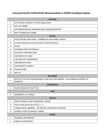 Lista partnerów Politechniki Warszawskiej w H2020 (według krajów) AUSTRIA 1 AIT Austrian Institute of Technology GmbH 2 AVL LIST GMBH 3 OESTERREICHISCHE AKADEMIE DER WISSENSCHAFTEN 4 RHP TECHNOLOGY GMBH BELGIA 1 ECOLE ROYALE MILITAIRE - KONINKLIJKE MILITAIRE SCHOOL 2 European Business and Innovation Centre Network 3 Geolys 4 ION BEAM APPLICATIONS SA 5 SPACETEC PARTNERS SPRL 6 UNIVERSITE DE LIEGE 7 UNIVERSITEIT ANTWERPEN 8 UNIVERSITEIT GENT 9 UNIVERSITEIT HASSELT 10 Voxdale BVBA 11 WSL SA BUŁGARIA 1 INSTITUTE OF NUCLEAR RESEARCH AND NUCLEAR ENERGY - BULGARIAN ACADEMY OF SCIENCES CHORWACJA 1 RUDER BOSKOVIC INSTITUTE CYPR 1 UNIVERSITY OF CYPRUS CZECHY 1 CESKE VYSOKE UCENI TECHNICKE V PRAZE 2 Ústav fyziky plazmatu AV ČR, v. v. i. 3 VYSOKA SKOLA BANSKA - TECHNICKA UNIVERZITA OSTRAVA 4 VYSOKE UCENI TECHNICKE V BRNE DANIA 1 AALBORG UNIVERSITET 2 AARHUS UNIVERSITET 3 DANMARKS TEKNISKE UNIVERSITET ESTONIA 1 TARTU ULIKOOL FINLANDIA 1 AALTO-KORKEAKOULUSAATIO 2 HELSINGIN YLIOPISTO 3 TEKNOLOGIAN TUTKIMUSKESKUS VTT OY 4 WARTSILA FINLAND OY FRANCJA 1 ACRI-ST SAS 2 AEROSPACE VALLEY 3 CENTRE NATIONAL DE LA RECHERCHE SCIENTIFIQUE (CNRS) 5 COMMISSARIAT A L ENERGIE ATOMIQUE ET AUX ENERGIES ALTERNATIVES 6 EUROPEAN PHOTONICS INDUSTRY CONSORTIUM 7 FONDATION NATIONALE DES SCIENCES POLITIQUES 8 IDGEO 9 Institut Mines-Telecom 10 INSTITUT NATIONAL DES SCIENCES APPLIQUEES DE LYON 11 Société Civile Synchrotron SOLEIL 12 TerraNIS SAS 13 THALES ALENIA SPACE FRANCE 14 UNIVERSITE LYON 1 CLAUDE BERNARD 15 UNIVERSITE PAUL SABATIER TOULOUSE III GRECJA 1 ATHENA RESEARCH AND INNOVATION CENTER IN INFORMATION COMMUNICATION & KNOWLEDGE TECHNOLOGIES 2 E3-MODELLING IKE 3 ETHNIKO KAI KAPODISTRIAKO PANEPISTIMIO ATHINON 4 IDRYMA EVGENIDOU 5 INSTITUTE OF COMMUNICATION AND COMPUTER SYSTEMS 6 NATIONAL CENTER FOR SCIENTIFIC RESEARCH "DEMOKRITOS" 7 RESEARCH PATHS ETAIREIA EREYNAS HISZPANIA 1 ABENGOA SOLAR NEW TECHNOLOGIES SA 2 CENTRO DE INVESTIGACIONES ENERGETICAS, MEDIOAMBIENTALES Y TECNOLOGICAS-CIEMAT 3 CONSORCIO PARA LA CONSTRUCCION EQUIPAMIENTO Y EXPLOTACION DEL LABORATORIO DE LUZ SINCROTRON 4 INGENIERIA DE TRAFICO SL 5 OPEN EVIDENCE 6 THALES ALENIA SPACE ESPANA, SA 7 UNIVERSIDAD AUTONOMA DE MADRID 8 UNIVERSIDAD CARLOS III DE MADRID 9 UNIVERSIDAD DE CANTABRIA 10 UNIVERSIDAD DE LLEIDA 11 UNIVERSITAT DE BARCELONA 12 UNIVERSITAT POLITECNICA DE CATALUNYA 13 UNIVERSITAT POLITECNICA DE VALENCIA 14 USER FEEDBACK PROGRAM S.L. HOLANDIA 1 Academisch Medisch Centrum bij de Universiteit van Amsterdam 2 BERENSCHOT GROEP BV 3 5 KIC INNOENERGY SE NEDERLANDSE ORGANISATIE VOOR TOEGEPAST NATUURWETENSCHAPPELIJK ONDERZOEK TNO STICHTING KATHOLIEKE UNIVERSITEIT BRABANT UNIVERSITEIT VAN TILBURG 6 STICHTING VOOR FUNDAMENTEEL ONDERZOEK DER MATERIE - FOM 7 TECHNISCHE UNIVERSITEIT EINDHOVEN 8 UNIVERSITEIT TWENTE 9 UNIVERSITEIT UTRECHT 10 VLAAMSE INSTELLING VOOR TECHNOLOGISCH ONDERZOEK N.V. 11 WAGENINGEN UNIVERSITY 4 IRLANDIA 1 DUBLIN CITY COUNCIL 2 DUBLIN CITY UNIVERSITY 3 IBM IRELAND LIMITED 4 INSTITIUID TEICNEOLAIOCHTA BHAILE ATHA CLIATH 5 ISME LIMITED 6 T.E. LABORATORIES LIMITED 7 TEAGASC - AGRICULTURE AND FOOD DEVELOPMENT AUTHORITY 8 THE PROVOST, FELLOWS, FOUNDATION SCHOLARS & THE OTHER MEMBERS OF BOARD OF THE COLLEGE OF THE HOLY & UNDIVIDED TRINITY OF QUEEN ELIZABETH NEAR DUBLIN 9 UNIVERSITY COLLEGE DUBLIN, NATIONAL UNIVERSITY OF IRELAND, DUBLIN ISLANDIA 1 JGK TECH EHF IZRAEL 3 BEN-GURION UNIVERSITY OF THE NEGEV 4 TECHNION ISRAEL INSTITUTE OF TECHNOLOGY KANADA 1 CORPORATION DE L ECOLE POLYTECHNIQUE DE MONTREAL ASSOCIATION LITWA LIETUVOS ENERGETIKOS INSTITUTAS ŁOTWA 1 LATVIJAS UNIVERSITATES CIETVIELU FIZIKAS INSTITUTS 2 RIGAS TEHNISKA UNIVERSITATE MALTA 1 UNIVERSITA TA MALTA NIEMCY 1 AGT GROUP (R&D) GMBH 2 ALLIANZ CLIMATE SOLUTIONS GmbH 3 BRUKER HTS GMBH 4 BUNDESANSTALT FUER STRASSENWESEN 5 BUNDESKRIMINALAMT 6 cesah GmbH Centrum für Satellitennavigation Hessen 7 DEUTSCHES ZENTRUM FUER LUFT - UND RAUMFAHRT EV 8 FORSCHUNGSZENTRUM JUELICH GMBH 9 FRAUNHOFER GESELLSCHAFT ZUR FOERDERUNG DER ANGEWANDTEN FORSCHUNG E.V. 11 FRIEDRICH-ALEXANDER-UNIVERSITAET ERLANGEN NUERNBERG 12 GSI HELMHOLTZZENTRUM FUER SCHWERIONENFORSCHUNG Gmbh 13 HEIDELBERGER IONENSTRAHL THERAPIE (HIT) BETRIEBS GESELLSCHAFT AM UNIVERSITATSKLINIKUM HEIDELBERG MIT BESCHRANKTER HAFTUNG 14 HELMHOLTZ-ZENTRUM BERLIN FUR MATERIALIEN UND ENERGIE GMBH 15 HELMHOLTZ-ZENTRUM FUER UMWELTFORSCHUNG GMBH 16 ICLEI EUROPEAN SECRETARIAT GMBH (ICLEI EUROPASEKRETARIAT GMBH) 17 IWW RHEINISCH-WESTFALISCHES INSTITUT FUER WASSER BERATUNGS-UND ENTWICKLUNGSGESELLSCHAFT MBH 18 JOHANN WOLFGANG GOETHE UNIVERSITAET FRANKFURT AM MAIN 19 JOHANNES GUTENBERG-UNIVERSITAT MAINZ 20 KARLSRUHER INSTITUT FUER TECHNOLOGIE 21 MAX PLANCK GESELLSCHAFT ZUR FOERDERUNG DER WISSENSCHAFTEN E.V. 22 MOTORTECH GmbH 23 OTTO-VON-GUERICKE-UNIVERSITAET MAGDEBURG 24 POTSDAM INSTITUT FUER KLIMAFOLGENFORSCHUNG 25 STIFTUNG DEUTSCHES ELEKTRONEN-SYNCHROTRON DESY 26 TECHNISCHE UNIVERSITAET BERLIN 27 TECHNISCHE UNIVERSITAET DARMSTADT 28 TECHNISCHE UNIVERSITAET DORTMUND 29 UNIVERSITAET DER BUNDESWEHR MUENCHEN 30 UNIVERSITAET SIEGEN POLSKA 1 BLUE TECHNOLOGIES SP ZOO 2 CENTRALNE LABORATORIUM KRYMINALISTYCZNE POLICJI 3 FUNDACJA KREATYWNE MAZOWSZE 4 INSTYTUT CHEMII I TECHNIKI JADROWEJ 5 INSTYTUT FIZYKI PLAZMY I LASEROWEJ MIKROSYNTEZY IM. SYLWESTRA KALISKIEGO 6 Miasto Stołeczne Warszawa 7 NARODOWE CENTRUM BADAŃ JĄDROWYCH 8 OPEGIEKA Sp. z o. o. 9 ORANGE POLSKA SA 10 POLITECHNIKA CZESTOCHOWSKA 11 POLITECHNIKA WROCLAWSKA 12 UNIWERSYTET WARSZAWSKI PORTUGALIA 1 ASSOCIACAO DO INSTITUTO SUPERIOR TECNICO PARA A INVESTIGACAO E DESENVOLVIMENTO 2 DEIMOS ENGENHARIA S.A. 3 INSTITUTO SUPERIOR TECNICO 4 UNIVERSIDADE DO MINHO 5 UNIVERSIDADE DO PORTO ROSJA 1 SKOLKOVO INSTITUTE OF SCIENCE AND TECHNOLOGY RUMUNIA 1 INSTITUTUL DE FIZICA ATOMICA 2 INSTITUTUL NATIONAL DE CERCETARE -DEZVOLTARE PENTRU FIZICA SI INGINERIE NUCLEARA "HORIA HULUBEI" (IFIN-HH) SINGAPUR 1 NANYANG TECHNOLOGICAL UNIVERSITY SŁOWACJA 1 Institute of Electrical Engineering, Slovak Academy of Sciences 2 UNI