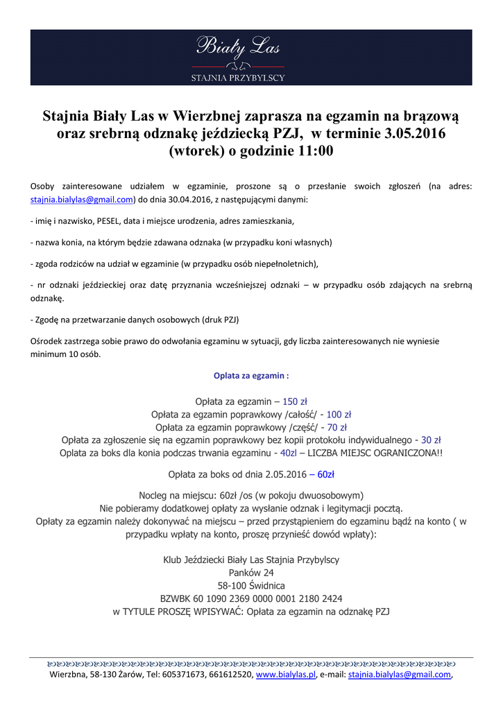 Stajnia Biały Las w Wierzbnej zaprasza na egzamin na brązową oraz srebrną odznakę jeździecką PZJ, w terminie 3.05.2016 (wtorek) o godzinie 11:00 Osoby zainteresowane udziałem w egzaminie, proszone są o przesłanie swoich zgłoszeń (na adres: [email protected]) do dnia 30.04.2016, z następującymi danymi: - imię i nazwisko, PESEL, data i miejsce urodzenia, adres zamieszkania, - nazwa konia, na którym będzie zdawana odznaka (w przypadku koni własnych) - zgoda rodziców na udział w egzaminie (w przypadku osób niepełnoletnich), - nr odznaki jeździeckiej oraz datę przyznania wcześniejszej odznaki – w przypadku osób zdających na srebrną odznakę. - Zgodę na przetwarzanie danych osobowych (druk PZJ) Ośrodek zastrzega sobie prawo do odwołania egzaminu w sytuacji, gdy liczba zainteresowanych nie wyniesie minimum 10 osób. Oplata za egzamin : Opłata za egzamin – 150 zł Opłata za egzamin poprawkowy /całość/ - 100 zł Opłata za egzamin poprawkowy /część/ - 70 zł Opłata za zgłoszenie się na egzamin poprawkowy bez kopii protokołu indywidualnego - 30 zł Oplata za boks dla konia podczas trwania egzaminu - 40zl – LICZBA MIEJSC OGRANICZONA!! Opłata za boks od dnia 2.05.2016 – 60zł Nocleg na miejscu: 60zł /os (w pokoju dwuosobowym) Nie pobieramy dodatkowej opłaty za wysłanie odznak i legitymacji pocztą. Opłaty za egzamin należy dokonywać na miejscu – przed przystąpieniem do egzaminu bądź na konto ( w przypadku wpłaty na konto, proszę przynieść dowód wpłaty): Klub Jeździecki Biały Las Stajnia Przybylscy Panków 24 58-100 Świdnica BZWBK 60 1090 2369 0000 0001 2180 2424 w TYTULE PROSZĘ WPISYWAĆ: Opłata za egzamin na odznakę PZJ Wierzbna, 58-130 Żarów, Tel: 605371673, 661612520, www.bialylas.pl, e-mail: [email protected], Uwagi techniczne: Egzamin rozpocznie się od opieki stajennej, części ujeżdżeniowej, następnie odbędzie się cześć skokowa oraz teoria. Istnieje możliwość przyjazdu jeden dzień przed egzaminem i skorzystania z ustawionego parkuru oraz czworoboku przygotowanego do egzaminów na odznaki.(opłata za boks 60zł) Egzamin odbędzie się na podłożu kwarcowym w systemie Ebbe und Flut ( www.equisystem.pl ) Obowiązuje strój galowy (tak jak na zawodach) bądź schludny strój jeździecki. Minimalny wiek egzaminowanego – 8 lat Osoby posiadające Odznakę Jeździecką – jeżdżę Konno – są zwolnione z części egzaminu z opieki stajennej. Dzieci poniżej 11 lat obowiązuje znajomość odpowiedzi tylko na pytania 1-83 Egzaminatorzy: Małgorzata Brodziak i Grzegorz Przybylski Egzamin prowadzony na warunkach i zasadach określonych przez Polski Związek Jeździecki, w przepisach Systemu odznak Jeździeckich Więcej informacji pod numerem telefonu: 661612520 Wierzbna, 58-130 Żarów, Tel: 605371673, 661612520, www.bialylas.pl, e-mail: [email protected],