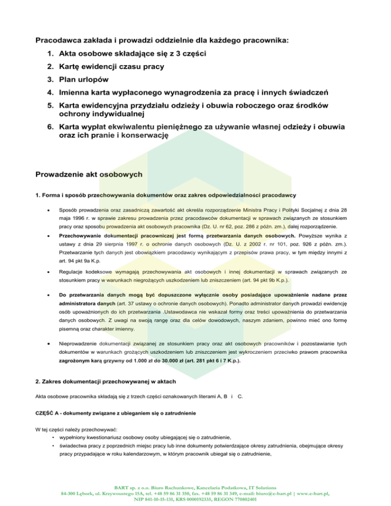 Pracodawca zakłada i prowadzi oddzielnie dla każdego pracownika: 1. Akta osobowe składające się z 3 części 2. Kartę ewidencji czasu pracy 3. Plan urlopów 4. Imienna karta wypłaconego wynagrodzenia za pracę i innych świadczeń 5. Karta ewidencyjna przydziału odzieży i obuwia roboczego oraz środków ochrony indywidualnej 6. Karta wypłat ekwiwalentu pieniężnego za używanie własnej odzieży i obuwia oraz ich pranie i konserwację Prowadzenie akt osobowych 1. Forma i sposób przechowywania dokumentów oraz zakres odpowiedzialności pracodawcy Sposób prowadzenia oraz zasadniczą zawartość akt określa rozporządzenie Ministra Pracy i Polityki Socjalnej z dnia 28 • maja 1996 r. w sprawie zakresu prowadzenia przez pracodawców dokumentacji w sprawach związanych ze stosunkiem pracy oraz sposobu prowadzenia akt osobowych pracownika (Dz. U. nr 62, poz. 286 z późn. zm.), dalej rozporządzenie. Przechowywanie dokumentacji pracowniczej jest formą przetwarzania danych osobowych. Powyższe wynika z • ustawy z dnia 29 sierpnia 1997 r. o ochronie danych osobowych (Dz. U. z 2002 r. nr 101, poz. 926 z późn. zm.). Przetwarzanie tych danych jest obowiązkiem pracodawcy wynikającym z przepisów prawa pracy, w tym między innymi z art. 94 pkt 9a K.p. Regulacje kodeksowe wymagają przechowywania akt osobowych i innej dokumentacji w sprawach związanych ze • stosunkiem pracy w warunkach niegrożących uszkodzeniem lub zniszczeniem (art. 94 pkt 9b K.p.). Do przetwarzania danych mogą być dopuszczone wyłącznie osoby posiadające upoważnienie nadane przez • administratora danych (art. 37 ustawy o ochronie danych osobowych). Ponadto administrator danych prowadzi ewidencję osób upoważnionych do ich przetwarzania .Ustawodawca nie wskazał formy oraz treści upoważnienia do przetwarzania danych osobowych. Z uwagi na swoją rangę oraz dla celów dowodowych, naszym zdaniem, powinno mieć ono formę pisemną oraz charakter imienny. • Nieprowadzenie dokumentacji związanej ze stosunkiem pracy oraz akt osobowych pracowników i pozostawianie tych dokumentów w warunkach grożących uszkodzeniem lub zniszczeniem jest wykroczeniem przeciwko prawom pracownika zagrożonym karą grzywny od 1.000 zł do 30.000 zł (art. 281 pkt 6 i 7 K.p.). 2. Zakres dokumentacji przechowywanej w aktach Akta osobowe pracownika składają się z trzech części oznakowanych literami A, B i C. CZĘŚĆ A - dokumenty związane z ubieganiem się o zatrudnienie W tej części należy przechowywać: • wypełniony kwestionariusz osobowy osoby ubiegającej się o zatrudnienie, • świadectwa pracy z poprzednich miejsc pracy lub inne dokumenty potwierdzające okresy zatrudnienia, obejmujące okresy pracy przypadające w roku kalendarzowym, w którym pracownik ubiegał się o zatrudnienie, BART sp. z o.o. Biuro Rachunkowe, Kancelaria Podatkowa, IT Solutions 84-300 Lębork, ul. Krzywoustego 15A, tel. +48 59 86 31 350, fax. +48 59 86 31 349, e-mail: [email protected] | www.e-bart.pl, NIP 841-10-15-131, KRS 0000192335, REGON 770802401 • dokumenty potwierdzające kwalifikacje zawodowe, wymagane do wykonywania oferowanej pracy, • świadectwo ukończenia gimnazjum w razie ubiegania się o zatrudnienie w celu przygotowania zawodowego, • orzeczenie lekarskie o braku przeciwwskazań do pracy na określonym stanowisku, • inne dokumenty, jeżeli obowiązek ich przedłożenia wynika z odrębnych przepisów prawa. W części tej przechowuje się również podanie o przyjęcie do pracy, ewentualnie ankietę pracodawcy opracowaną dla potrzeb rekrutacji, wyciąg z książeczki wojskowej oraz dokumenty będące podstawą do korzystania ze szczególnych uprawnień z zakresu stosunku pracy. Ponadto przedłożone dokumenty potwierdzające umiejętności i osiągnięcia zawodowe pracownika i wcześniejsze świadectwa pracy. CZĘŚĆ B - dokumenty dotyczące nawiązania stosunku pracy oraz przebiegu zatrudnienia W tej części należy gromadzić dokumenty dotyczące nawiązania stosunku pracy oraz przebiegu zatrudnienia pracownika, w tym: • umowę o pracę, a jeżeli umowa nie została zawarta na piśmie - potwierdzenie ustaleń co do rodzaju umowy oraz jej warunków, a także zakres czynności (zakres obowiązków), jeżeli pracodawca dodatkowo w tej formie określił zadania pracownika wynikające z umowy o pracę, • dokumenty dotyczące wykonywania pracy w formie telepracy, • pisemne potwierdzenie zapoznania się przez pracownika z treścią regulaminu pracy, informacją o warunkach zatrudnienia oraz z przepisami i zasadami dotyczącymi bezpieczeństwa i higieny pracy, z zakresem informacji objętych tajemnicą określoną w obowiązujących ustawach dla umówionego z pracownikiem rodzaju pracy, a także z obwieszczeniem o czasie pracy oraz zaświadczenia o ukończeniu wymaganego szkolenia w zakresie bezpieczeństwa i higieny pracy, • oświadczenie pracownika będącego rodzicem lub opiekunem dziecka o zamiarze lub o braku zamiaru korzystania z • dokumenty dotyczące powierzenia pracownikowi mienia z obowiązkiem zwrotu albo do wyliczenia się, • dokumenty związane z podnoszeniem przez pracownika kwalifikacji zawodowych (świadectwa, dyplomy, zaświadczenia, uprawnień związanych z rodzicielstwem, umowy), • oświadczenia dotyczące wypowiedzenia pracownikowi warunków umowy o pracę lub zmiany tych warunków w innym trybie, • dokumenty związane z przyznaniem pracownikowi nagrody lub wyróżnienia oraz wymierzeniem kary porządkowej, • pisma dotyczące udzielenia pracownikowi dodatkowego urlopu macierzyńskiego, dodatkowego urlopu na warunkach urlopu macierzyńskiego, urlopu ojcowskiego, urlopu wychowawczego oraz urlopu bezpłatnego, • dokumenty związane z obniżeniem wymiaru czasu pracy w związku z uprawnieniami rodzicielskimi, • orzeczenia lekarskie wydane w związku z przeprowadzonymi badaniami okresowymi i kontrolnymi, • umowę o zakazie konkurencji, jeżeli strony zawarły taką umow
