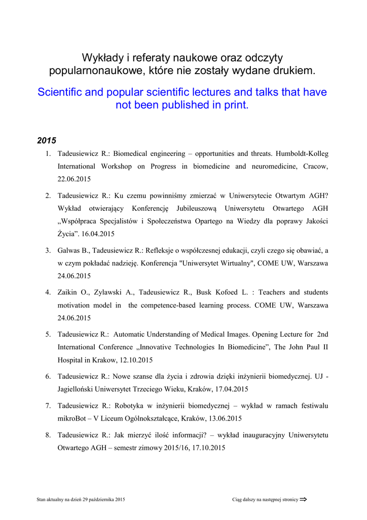 6. Tadeusiewicz R.: Nowe szanse dla życia i zdrowia dzięki inżynierii biomedycznej. UJ Jagielloński Uniwersytet Trzeciego Wieku, Kraków, 17.04.2015