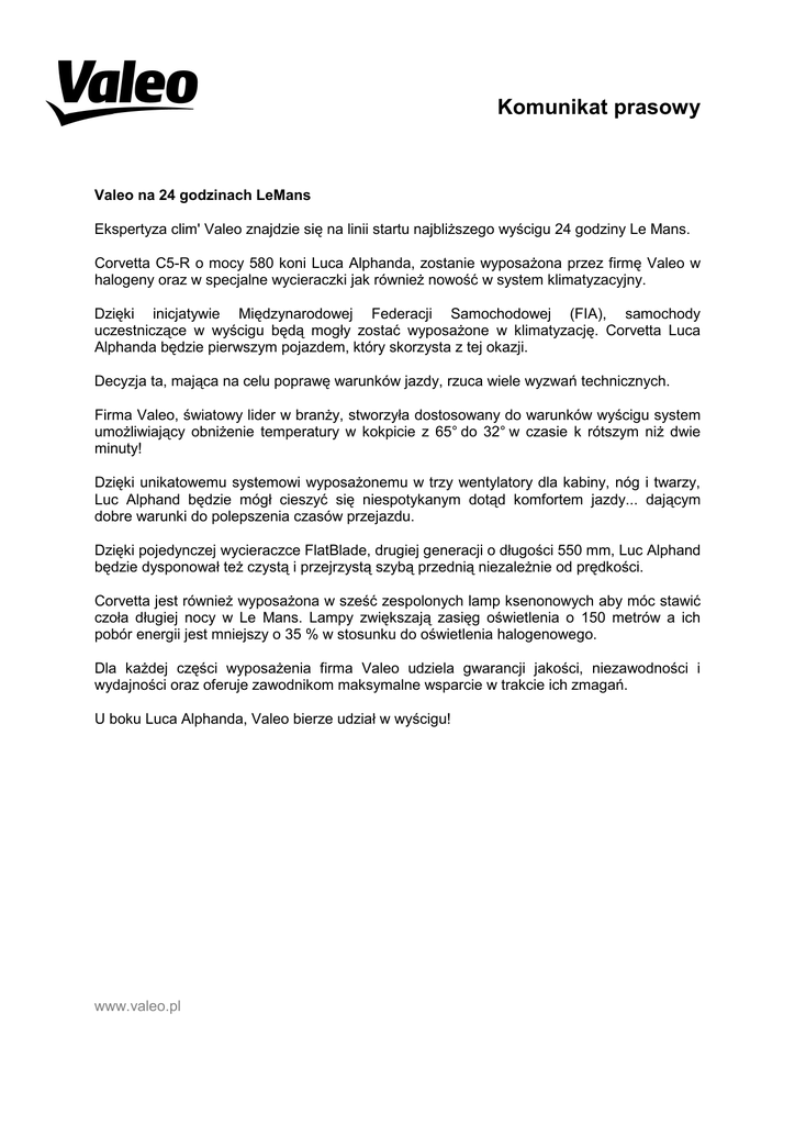 Komunikat prasowy Valeo na 24 godzinach LeMans Ekspertyza clim' Valeo znajdzie się na linii startu najbliŜszego wyścigu 24 godziny Le Mans. Corvetta C5-R o mocy 580 koni Luca Alphanda, zostanie wyposaŜona przez firmę Valeo w halogeny oraz w specjalne wycieraczki jak równieŜ nowość w system klimatyzacyjny. Dzięki inicjatywie Międzynarodowej Federacji Samochodowej (FIA), samochody uczestniczące w wyścigu będą mogły zostać wyposaŜone w klimatyzację. Corvetta Luca Alphanda będzie pierwszym pojazdem, który skorzysta z tej okazji. Decyzja ta, mająca na celu poprawę warunków jazdy, rzuca wiele wyzwań technicznych. Firma Valeo, światowy lider w branŜy, stworzyła dostosowany do warunków wyścigu system umoŜliwiający obniŜenie temperatury w kokpicie z 65° do 32° w czasie k rótszym niŜ dwie minuty! Dzięki unikatowemu systemowi wyposaŜonemu w trzy wentylatory dla kabiny, nóg i twarzy, Luc Alphand będzie mógł cieszyć się niespotykanym dotąd komfortem jazdy... dającym dobre warunki do polepszenia czasów przejazdu. Dzięki pojedynczej wycieraczce FlatBlade, drugiej generacji o długości 550 mm, Luc Alphand będzie dysponował teŜ czystą i przejrzystą szybą przednią niezaleŜnie od prędkości. Corvetta jest równieŜ wyposaŜona w sześć zespolonych lamp ksenonowych aby móc stawić czoła długiej nocy w Le Mans. Lampy zwiększają zasięg oświetlenia o 150 metrów a ich pobór energii jest mniejszy o 35 % w stosunku do oświetlenia halogenowego. Dla kaŜdej części wyposaŜenia firma Valeo udziela gwarancji jakości, niezawodności i wydajności oraz oferuje zawodnikom maksymalne wsparcie w trakcie ich zmagań. U boku Luca Alphanda, Valeo bierze udział w wyścigu! www.valeo.pl