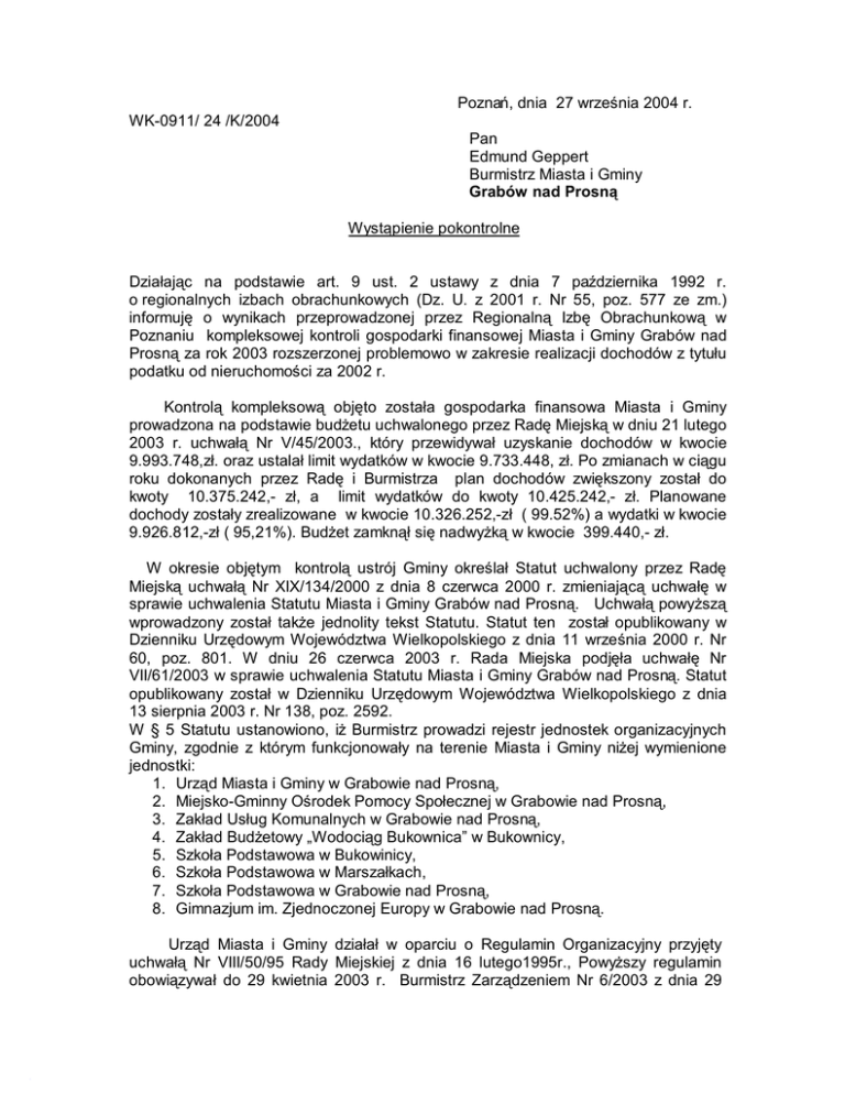 Poznań, dnia 27 września 2004 r. WK-0911/ 24 /K/2004 Pan Edmund Geppert Burmistrz Miasta i Gminy Grabów nad Prosną Wystąpienie pokontrolne Działając na podstawie art. 9 ust. 2 ustawy z dnia 7 października 1992 r. o regionalnych izbach obrachunkowych (Dz. U. z 2001 r. Nr 55, poz. 577 ze zm.) informuję o wynikach przeprowadzonej przez Regionalną Izbę Obrachunkową w Poznaniu kompleksowej kontroli gospodarki finansowej Miasta i Gminy Grabów nad Prosną za rok 2003 rozszerzonej problemowo w zakresie realizacji dochodów z tytułu podatku od nieruchomości za 2002 r. Kontrolą kompleksową objęto została gospodarka finansowa Miasta i Gminy prowadzona na podstawie budżetu uchwalonego przez Radę Miejską w dniu 21 lutego 2003 r. uchwałą Nr V/45/2003., który przewidywał uzyskanie dochodów w kwocie 9.993.748,zł. oraz ustalał limit wydatków w kwocie 9.733.448, zł. Po zmianach w ciągu roku dokonanych przez Radę i Burmistrza plan dochodów zwiększony został do kwoty 10.375.242,- zł, a limit wydatków do kwoty 10.425.242,- zł. Planowane dochody zostały zrealizowane w kwocie 10.326.252,-zł ( 99.52%) a wydatki w kwocie 9.926.812,-zł ( 95,21%). Budżet zamknął się nadwyżką w kwocie 399.440,- zł. W okresie objętym kontrolą ustrój Gminy określał Statut uchwalony przez Radę Miejską uchwałą Nr XIX/134/2000 z dnia 8 czerwca 2000 r. zmieniającą uchwałę w sprawie uchwalenia Statutu Miasta i Gminy Grabów nad Prosną. Uchwałą powyższą wprowadzony został także jednolity tekst Statutu. Statut ten został opublikowany w Dzienniku Urzędowym Województwa Wielkopolskiego z dnia 11 września 2000 r. Nr 60, poz. 801. W dniu 26 czerwca 2003 r. Rada Miejska podjęła uchwałę Nr VII/61/2003 w sprawie uchwalenia Statutu Miasta i Gminy Grabów nad Prosną. Statut opublikowany został w Dzienniku Urzędowym Województwa Wielkopolskiego z dnia 13 sierpnia 2003 r. Nr 138, poz. 2592. W § 5 Statutu ustanowiono, iż Burmistrz prowadzi rejestr jednostek organizacyjnych Gminy, zgodnie z którym funkcjonowały na terenie Miasta i Gminy niżej wymienione jednostki: 1. Urząd Miasta i Gminy w Grabowie nad Prosną, 2. Miejsko-Gminny Ośrodek Pomocy Społecznej w Grabowie nad Prosną, 3. Zakład Usług Komunalnych w Grabowie nad Prosną, 4. Zakład Budżetowy „Wodociąg Bukownica” w Bukownicy, 5. Szkoła Podstawowa w Bukowinicy, 6. Szkoła Podstawowa w Marszałkach, 7. Szkoła Podstawowa w Grabowie nad Prosną, 8. Gimnazjum im. Zjednoczonej Europy w Grabowie nad Prosną. Urząd Miasta i Gminy działał w oparciu o Regulamin Organizacyjny przyjęty uchwałą Nr VIII/50/95 Rady Miejskiej z dnia 16 lutego1995r., Powyższy regulamin obowiązywał do 29 kwietnia 2003 r. Burmistrz Zarządzeniem Nr 6/2003 z dnia 29 stycznia 2003 r. wprowadził nowy Regulamin Organizacyjny Urzędu Miasta i Gminy. Z § 4 Regulaminu wynika, że zarządzenie to weszło w życie z dniem 30 kwietnia 2003 r. W toku kontroli sprawdzono wykonanie wniosków pokontrolnych sformułowanych na podstawie wyników poprzedniej kontroli kompleksowej gospodarki finansowej przeprowadzonej w 2000r. i ustalono, że na 4 wnioski pokontrolne skierowane do Burmistrza nieprawidłowości powtórzyły się w odniesieniu do jednego wniosku dotyczącego wykazywania w sprawozdaniach o dochodach budżetowych skutków obniżenia górnych stawek podatków oraz skutków ulg, zwolnień, umorzeń, odroczeń, rozłożenia na raty. W trakcie obecnej kontroli ustalono, że: W 2003 r. przeprowadzone były kontrole finansowe w: • Zakładzie Budżetowym „Wodociąg Bukownica”, • Zakładzie Usług Komunalnych w Grabowie nad Prosną. W zakładach budżetowych kontrola finansowa przeprowadzona została przez Panią K.J. zam. w Grabowie nad Prosną, nie będącą pracownikiem Urzędu. Podstawą do przeprowadzenia tej kontroli była umowa zlecenia zawarta z w/w przez Burmistrza w dniu 25 czerwca 2003 r.. Przedmiotem umowy było przeprowadzenie na podstawie art. 127 ustawy z dnia 26 listopada 1998 r. o finansach publicznych kontroli kompleksowej w Zakładzie Usług Komunalnych w Grabowie nad Prosną i w Zakładzie Budżetowym „Wodociąg Bukownica” za okres od 01.01.2002 r. do 30.06.2003 r. oraz co najmniej 5 % wydatków w każdym kontrolowanym roku. W 2004 r. w wymienionych niżej jednostkach organizacyjnych przeprowadzone były przez Firmę Doradczo-Szkoleniową „ASPEKT” P.W. kontrole finansowe obejmujące procedury kontroli finansowej oraz co najmniej 5% wydatków za 2003r. • Szkole Podstawowej w Bukownicy, • Centrum Kultury w Grabowie nad Prosną, • Miejsko-Gminnym Ośrodku Pomocy Społecznej w Grabowie nad Prosną, • Szkole Podstawowej w Marszałkach, • Gimnazjum im. Zjednoczonej Europy w Grabowie nad Prosną, • Szkole Podstawowej w Grabowie nad Prosną. Kontrolujący stwierdzili że : - nie została przeprowadzona w 2003r. kontrola finansowa w Urzędzie Miasta i i Gminy, - przeprowadzona w 2003r. w zakładach budżetowych kontrola nie objęła co najmniej 5 % wydatków zakładów, - w 2004r. przeprowadzone w jednostkach organizacyjnych kontrole finansowe obejmowały 2003 r. Powyższe naruszyło postanowienia zawarte w art. 127 ust. 2 i 3 ustawy z dnia 26 listopada 1998 r. o finansach publicznych (Dz. U. z 2003 r. Nr 15, poz. 148 ze zm.), zgodnie z którymi Burmistrz kontroluje przestrzeganie, przez podległe i nadzorowane przez siebie jednostki sektora finansów publicznych, realizacji procedur kontroli, która winna w każdym roku obejmować co najmniej 5% wydatków. /Str. 10-12 protokołu kontroli oraz załączniki nr 2(1-34), 3(1-12) i 4 do protokołu kontroli. Ponadto w toku kontroli ustalono, że w dniu 4.03.2004 r. zawarta została pomiędzy Miastem i Gminą Grabów nad Prosną, reprezentowanym przez Burmistrza a Firmą Doradczo–Szkoleniową „ASPEKT” P.W. umowa Nr 4/K/2004. Przedmiotem umowy była kontrola „procedur kontroli finansowej oraz 5 % wydatków za okres 2003 r. dokonywanych z budżetu gm