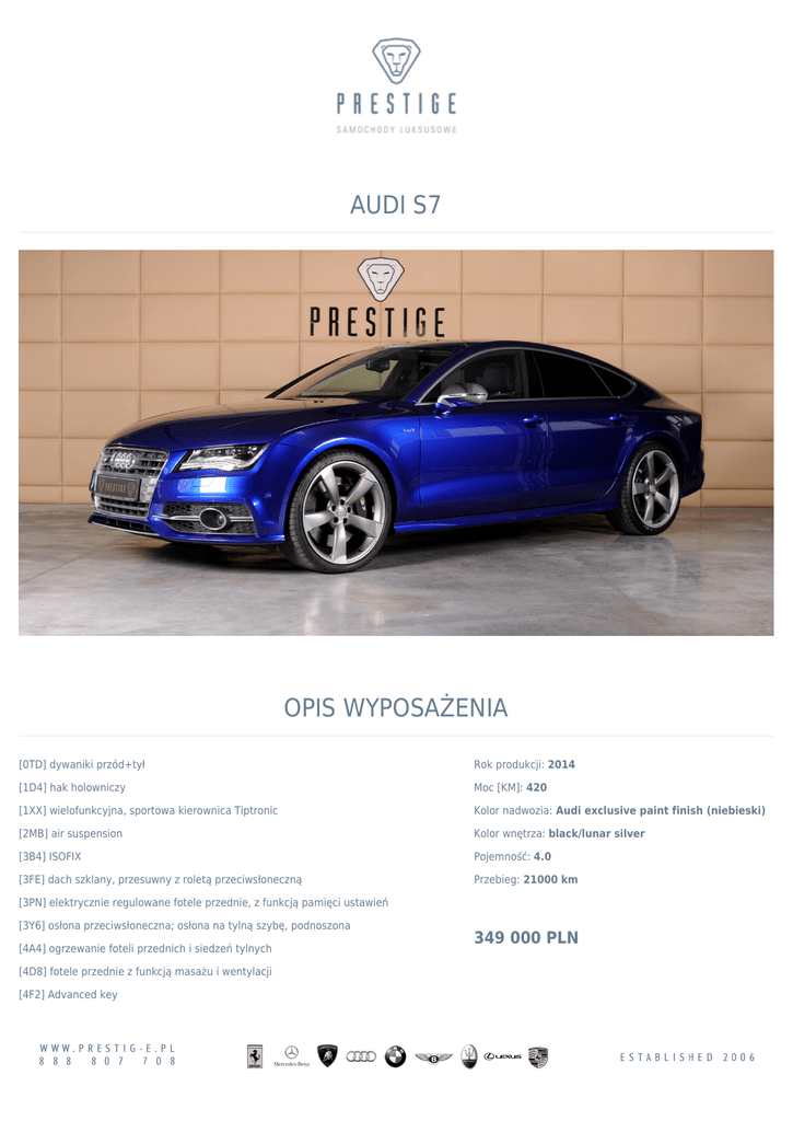 AUDI S7 OPIS WYPOSAŻENIA [0TD] dywaniki przód+tył Rok produkcji: 2014 [1D4] hak holowniczy Moc [KM]: 420 [1XX] wielofunkcyjna, sportowa kierownica Tiptronic Kolor nadwozia: Audi exclusive paint finish (niebieski) [2MB] air suspension Kolor wnętrza: black/lunar silver [3B4] ISOFIX Pojemność: 4.0 [3FE] dach szklany, przesuwny z roletą przeciwsłoneczną Przebieg: 21000 km [3PN] elektrycznie regulowane fotele przednie, z funkcją pamięci ustawień [3Y6] osłona przeciwsłoneczna; osłona na tylną szybę, podnoszona [4A4] ogrzewanie foteli przednich i siedzeń tylnych [4D8] fotele przednie z funkcją masażu i wentylacji [4F2] Advanced key 349 000 PLN [4KF] szyby tylne, przyciemnione (szyby privacy) cena (brutto) [4L6] lusterko wewnętrzne z automatyczną funkcją przeciwoślepieniową [4UF] dezaktywacja poduszek powietrznych kierowcy i pasażera T: +48 888 807 708 lub +48 665 400 500 [4X4] poduszki powietrzne, boczne dla 2. rzędu siedzeń E: [email protected] [5MK] aplikacje dekoracyjne wnętrza - Carbon Atlas [6G0] DVD zmieniarka [6XL] lusterka zewnętrzne z funkcją pamięci, składane z automatyczną funkcją przeciwoślepieniową [7AL] Alarm [7HC] Pakiet skórzany (zakres 2); dolna część konsoli środkowej obszyta skórą; podparcia w drzwiach obszyte skórą; obszycie skórą w kolorze czarnym poduszki powietrznej w kierownicy [7P1] elektryczna regulacja podparcia odcinka lędźwiowego kręgosłupa [7X5] asystent parkowania [8N7] czujnik zmierzchowy świateł i czujnik deszczu z asystentem świateł drogowych [8RF] system nagłaśniający High End Sound [8T4] Adaptive Cruise Control [9JC] pakiet dla palących [9M9] ogrzewanie postojowe [9ZW] Audi connect z opcją telefonu - komfortowe podłączenie z samochodu do internetu przez Audi connect [EA8] Audi Extensive - program serwisowy 5 lata / 100 000 km; efektywna ochrona przed kosztami nieprzewidzianych napraw przez rok po upływie fabrycznej gwarancji [GZ2] wspomaganie domykania drzwi, elektryczne [KA4] system kamer: przednie i tylna, z funkcją Corner View [KS1] Head up Display [N5D] tapicerka skórzana Valcona [PCB] Audi active lane assist - system wspomagający kierowcę, gdy ten w niezamierzony sposób zjeżdża z obranego toru jazdy (funkcjonalność w zakresie prędkości 60-250 km/h) [PCG] adaptive cruise control z funkcją Stop&Go z Audi pre sense front [PGD] kluczyk komfortowy z funkcją odblokowania bagażnika za pomocą gestów [PIH] isofix - mocowanie fotelika dziecięcego na fotelu pasażera z przodu i skrajnych siedzeniach z tyłu; deaktywacja poduszki powietrznej pasażera z przodu [PK6] ogrzewanie postojowe sterowane pilotem [PNP] MMI system nawigacji plus z MMI touch [PQ3] 21" obręcze ze stopu metali lekkich, 5-ramienne "Rotor" [PS8] fotele komfortowe z funkcją pamięci ustawień - elektryczna regulacja foteli komfortowych przednich, z pneumatyczną regulacją odcinka lędźwiowego oraz boków oparcia i siedzisk, z elektryczną regulacją wysokości, wzdłużną, kąta pochylenia oparcia i siedzisk, regulacja odcinka podparcia podudzia oraz manualna regulacja wysokości zagłówków i pasów bezpieczeństwa z przodu [PX2] reflektory w technologii LED [PYR] Pakiet stylistyczny Valcona 2 [QK1] driver assistance system [QQ2] Pakiet oświetlenia zewnętrznego i wnętrza Ambiente [QR9] wskaźnik ograniczenia prędkości rozpoznawanie za pomocą kamery ograniczeń prędkości na drodze [QV3] tuner cyfrowy stacji radiowych (DAB) [UF7] Audi music interface [VC1] pilot otwierania bramy garażu (Home Link)