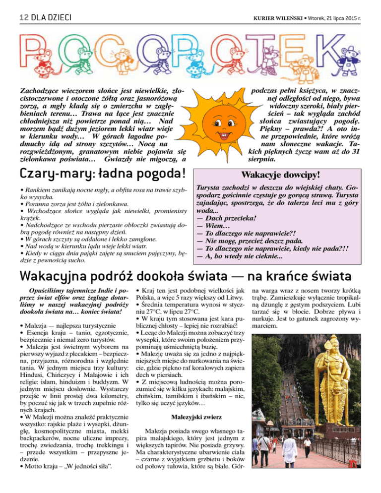 12 DLA DZIECI KURIER WILEŃSKI • Wtorek, 21 lipca 2015 r. podczas pełni księżyca, w znacznej odległości od niego, bywa widoczny szeroki, biały pierścień – tak wygląda zachód słońca zwiastujący pogodę. Piękny – prawda?! A oto inne przepowiednie, które wróżą nam słoneczne wakacje. Takich pięknych życzę wam aż do 31 sierpnia. Zachodzące wieczorem słońce jest niewielkie, złocistoczerwone i otoczone żółtą oraz jasnoróżową zorzą, a mgły kładą się o zmierzchu w zagłębieniach terenu… Trawa na łące jest znacznie chłodniejsza niż powietrze ponad nią… Nad morzem bądź dużym jeziorem lekki wiatr wieje w kierunku wody… W górach łagodne podmuchy idą od strony szczytów… Nocą na rozgwieżdżonym, granatowym niebie pojawia się zielonkawa poświata… Gwiazdy nie migoczą, a Czary-mary: ładna pogoda! • Rankiem zanikają nocne mgły, a obfita rosa na trawie szybko wysycha. • Poranna zorza jest żółta i zielonkawa. • Wschodzące słońce wygląda jak niewielki, promienisty krążek. • Nadchodzące ze wschodu pierzaste obłoczki zwiastują dobrą pogodę również na następny dzień. • W górach szczyty są oddalone i lekko zamglone. • Nad wodą w kierunku lądu wieje lekki wiatr. • Kiedy w ciągu dnia pająki zajęte są snuciem pajęczyny, będzie z pewnością sucho. Wakacyje dowcipy! Turysta zachodzi w deszczu do wiejskiej chaty. Gospodarz gościnnie częstuje go gorącą strawą. Turysta zajadając, spostrzega, że do talerza leci mu z góry woda... — Dach przecieka! — Wiem… — To dlaczego nie naprawicie?! — Nie mogę, przecież deszcz pada. — To dlaczego nie naprawicie, kiedy nie pada?!! — A, bo wtedy nie cieknie... Wakacyjna podróż dookoła świata — na krańce świata Opuściliśmy tajemnicze Indie i poprzez świat elfów oraz żeglugę dotarliśmy w naszej wakacyjnej podróży dookoła świata na… koniec świata! • Malezja — najlepsza turystycznie • Esencja kraju – tanio, egzotycznie, bezpiecznie i niemal zero turystów. • Malezja jest świetnym wyborem na pierwszy wyjazd z plecakiem – bezpieczna, przyjazna, różnorodna i względnie tania. W jednym miejscu trzy kultury: Hindusi, Chińczycy i Malajowie i ich religie: islam, hinduizm i buddyzm. W jednym miejscu dosłownie. Wystarczy przejść w linii prostej dwa kilometry, by poczuć się jak w trzech zupełnie różnych krajach. • W Malezji można znaleźć praktycznie wszystko: rajskie plaże i wysepki, dżunglę, kosmopolityczne miasta, mekki backpackerów, nocne uliczne imprezy, trochę zwiedzania, trochę trekkingu i – przede wszystkim – przepyszne jedzenie. • Motto kraju – „W jedności siła”. • Kraj ten jest podobnej wielkości jak Polska, a więc 5 razy większy od Litwy. • Średnia temperatura wynosi w styczniu 27°C, w lipcu 27°C. • W kraju tym stosowana jest kara publicznej chłosty – lepiej nie rozrabiać! • Lecąc do Malezji można zobaczyć trzy wysepki, które swoim położeniem przypominają uśmiechniętą buzię. • Malezję uważa się za jedno z najpiękniejszych miejsc do nurkowania na świecie, gdzie piękno raf koralowych zapiera dech w piersiach. • Z miejscową ludnością można porozumieć się w kilku językach: malajskim, chińskim, tamilskim i ibańskim – nic, tylko się uczyć języków… Malezyjski zwierz Malezja posiada swego własnego tapira malajskiego, który jest jednym z większych tapirów. Nie posiada grzywy. Ma charakterystyczne ubarwienie ciała – czarne z wyjątkiem grzbietu i boków od połowy tułowia, które są białe. Gór- na warga wraz z nosem tworzy krótką trąbę. Zamieszkuje wyłącznie tropikalną dżunglę z gęstym podszyciem. Lubi tarzać się w błocie. Dobrze pływa i nurkuje. Jest to gatunek zagrożony wymarciem. DLA DZIECI 13 KURIER WILEŃSKI • Wtorek, 21 lipca 2015 r. Gry i zabawy — ogon smoka Wszyscy uczestnicy zabawy ustawiają się jedno za drugim i rękami łapią za pas osobę będącą przed nimi. Tworzą tzw. „Smoka”. Zadaniem bawiących się jest pokręcenie „Smokiem”, tak aby „paszcza Smoka”, czyli ten, kto jest na początku, złapał „ogon Smoka”, czyli tę osobę, która jest na końcu. Jeśli się to uda, osoba, która została złapana, idzie na początek „Smoka” i teraz ona łapie jego ogon. Skoro zabawimy się w „Smoka”, to możemy go również sobie zrobić! Smok Będzie to układanka z wielu elementów. Warto się uważnie przyjrzeć smokowi i zastanowić, z jakich kół są wykonane jego poszczególne elementy. Chodzi głównie o zielone koła, bo to ich jest najwięcej. Duże koła przeznaczamy na brzuch i głowę smoka. Z małych kółek jest wykonany grzbiet i uszy. Przyjrzyjcie się ogonowi. W górnej części są małe kółka, takie jak na grzbiecie, w dolnej części kółka są większe. Z uformowaniem oczu i języka na pewno nie będziecie mieć problemów. Naklejcie elementy smoka na karton i lekko odchylcie górne części kółek. Przygotowujemy 21 kółek: • 3 żółte (2 o średnicy 30 mm i 1 o średnicy 100 mm), • 1 czerwone (o średnicy 30 mm), • 15 zielonych (2 o średnicy 100 mm, 5 o średnicy 57 mm, 1 o średnicy 47 mm i 7 o średnicy 30 mm), • 2 czarne kółeczka wycięte dziurkaczem. Pokolorujcie smoka KROK I – choć smok wydaje się trudną składanką, wykonujemy tylko jedno zgięcie na kole – wzdłuż średnicy. Zginamy na pół wszystkie kółka z wyjątkiem dwóch małych czarnych kółeczek, które pozostają niezgięte. KROK II – przyglądamy się uważnie smokowi z obrazka i próbujemy ułożyć takiego z naszych kół. W trakcie modelowania zwróćcie uwagę na kilka elementów układanki: 1. Brzuch smoka formujemy ze zgiętych kółek, wsuwając żółte kółko w zielone, tak by na zewnątrz pozostała żółta obwódka. 2. Ucho smoka formujemy, wsuwając zgięte kółko pod większe zgięte kółko, które będzie głową. 3. Łapy smoka formujemy w