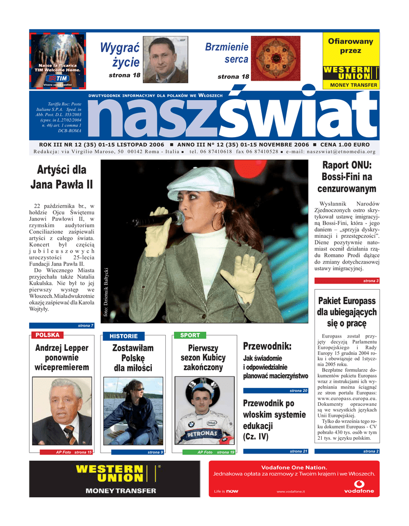 Wygrać życie Brzmienie serca strona 18 strona 18 naszświat DWUTYGODNIK INFORMACYJNY DLA POLAKÓW WE Tariffa Roc: Poste Italiane S.P.A. Sped. in Abb. Post. D.L. 353/2003 (cpnv. in L.27/02/2004 n. 46) art. 1 comma 1 DCB-ROMA Ofiarowany przez WŁOSZECH ROK III NR 12 (35) 01-15 LISTOPAD 2006 ANNO III N° 12 (35) 01-15 NOVEMBRE 2006 CENA 1.00 EURO R e d a k c j a : v i a V i r g i l i o M a r o s o , 5 0 0 0142 R o m a - It a l i a t e l . 0 6 8 7410 618 f a x 0 6 8 7410 52 8 e - m a i l : n a s z s w i a t @ e t n o m e d i a .o r g Raport ONU: Bossi-Fini na cenzurowanym Artyści dla Jana Pawła II Wysłannik Narodów Zjednoczonych ostro skrytykował ustawę imigracyjną Bossi-Fini, która - jego daniem – „sprzyja dyskryminacji i przestępczości”. Diene pozytywnie natomiast ocenił działania rządu Romano Prodi dążące do zmiany dotychczasowej ustawy imigracyjnej. foto: Dziennik Bałtycki 22 października br., w hołdzie Ojcu Świętemu Janowi Pawłowi II, w rzymskim audytorium Conciliazione zaśpiewali artyści z całego świata. Koncert był częścią jubileuszowych uroczystości 25-lecia Fundacji Jana Pawła II. Do Wiecznego Miasta przyjechała także Natalia Kukulska. Nie był to jej pierwszy występ we Włoszech. Miała dwukrotnie okazję zaśpiewać dla Karola Wojtyły. strona 3 Pakiet Europass dla ubiegających się o pracę strona 7 POLSKA Andrzej Lepper ponownie wicepremierem SPORT HISTORIE Zostawiłam Polskę dla miłości Pierwszy sezon Kubicy zakończony Przewodnik: Jak świadomie i odpowiedzialnie planować macierzyństwo strona 20 Przewodnik po włoskim systemie edukacji (Cz. IV) AP Foto strona 15 strona 9 AP Foto strona 19 strona 21 Europass został przyjęty decyzją Parlamentu Europejskiego i Rady Europy 15 grudnia 2004 roku i obowiązuje od 1stycznia 2005 roku. Bezpłatne formularze dokumentów pakietu Europass wraz z instrukcjami ich wypełniania można ściągnąć ze stron portalu Europass: www.europass.europa.eu. Dokumenty opracowane są we wszystkich językach Unii Europejskiej. Tylko do września tego roku dokument Europass - CV pobrało 430 tys. osób w tym 21 tys. w języku polskim. strona 2 Vodafone One Nation. Jednakowa opĄata za rozmowy z Twoim krajem i we WĄoszech. Life is www.vodafone.it 2 naszświat AKTUALNOŚCI Jeśli ubiegasz się o pracę (tak w kraju jak i za granicą), przygotuj dokumenty aplikacyjne zgodne z oczekiwaniami pracodawców. Kwestię tą reguluje Europass Europass został przyjęty decyzją Parlamentu Europejskiego i Rady Europy 15 grudnia 2004 roku i obowiązuje od 1stycznia 2005 roku. Pakiet Europass zawiera: Europass CV, Europass - Paszport, Europass Paszport Językowy, Europass - suplement do Dyplomu, Europass - suplement do Dyplomu Potwierdzającego Kwalifikacje Zawodowe, oraz Europass - Mobilność. Bezpłatne formularze dokumentów pakietu Europass wraz z instrukcjami ich wypełniania można ściągnąć ze stron portalu Europass: www.europass.europa.eu. Dokumenty opracowane są we wszystkich językach Unii Europejskiej. Tylko do września tego roku dokument Europass - CV pobrało 430 tys. osób w tym 21 tys. w języku polskim. Europass - CV składa się z kilku części. W pierwszej podaje się standardowe dane osobowe i kontaktowe (imię i nazwisko, datę urodzenia, adres, nr telefonu itp.). Nr 12 01-15 listopad 2006 Pakiet Europass dla ubiegających się o pracę Rubryka “preferowane miejsce pracy” daje możliwość nie tylko określenia stanowiska podanego w numerze referencyjnym, ale również stanowisk pokrewnych. Pozwala to na prezentację przez ubiegającego się o pracę swoich wszechstronnych umiejętności i elastyczności pod względem zajmowanego stanowiska pracy. W rubryce “doświadczenie zawodowe” wpisuje się najważniejsze miejsca pracy, zdobyte w nich doświadczenia oraz zakres wykonywanych obowiązków. Tu określa się jak kandydat wykorzystywał swoje umiejętności w praktyce, jakie funkcje i zadania były mu powierzane i jak duże doświadczenie posiada w ich wykonywaniu. W rubryce “Wykształcenie i odbyte szkolenia” prezentuje się zdobytą wiedzę, ukończonymi szkołami i kursami. Jednak największą uwagę przywiązują pracodawcy do treści zawartych w rubryce “Umiejętności i kompetencje”. Na początku tej rubryki kandydat do pracy określa swoją umiejętność porozumiewania się w językach obcych. W tym celu Rada Europy opracował jednolity 6-cio stopniowy system, odzwierciedlający poziom zaawansowania znajomości języka obcego, by w maksymalnym stopniu ujednolicić i uprościć sposób jej oceny. System zawarty jest w instrukcji do CV. Tu opisuje się umiejętności i kompetencje społeczne (np. umiejętność pracy w zespole), organizacyjne (np. koordynowanie pracy grupy osób), techniczne (np. znajomość procedur kontroli jakości), obsługi komputera, artystyczne. Dobrze przygotowane CV jest warunkiem wykonania kolejnych kroków na drodze do zatrudnienia. Irena Wachowska O NAS U.N.A.R., Ufficio nazionale Antidiscriminazioni Razziali, czyli Krajowy Urząd do Spraw Walki z Dyskryminacją Rasową, gwarantuje ochronę i pomoc tym, którzy stali się ofiarami dyskryminacji lub nierównego traktowania ze względu na pochodzenie etniczne będź przynależność do innej rasy. Zadaniem nowego urzędu jest udzielenie pomocy wszystkim, których prawo do równości złamane zostało przez jakąkolwiek formę dyskryminacji rasowej. BEZPŁATNA INFOLINIA DO SPRAW WALKI Z DYSKRYMINACJĄ RASOWĄ: 800.90.10.10 Kontakt z Urzędem możliwy jest poprzez bezpłatną infolinię 800.90.10.10, czynną codziennie w godz. od 10.00 do 20.00. Obslugiwana jest ona w wielu językach, w tym po włosku, angielsku, francusku, hiszpańsku, arabsku, rosyjsku, rumuńsku oraz chińsku. Zadaniem operatorów pracujących w contact center U.N.A.R. jest udzielanie informacji, porad oraz wsparcie osobom, które stały się ofiarami dyskryminacji rasowej. Dzwoniąc pod wskazany powyżej numer można sygnali