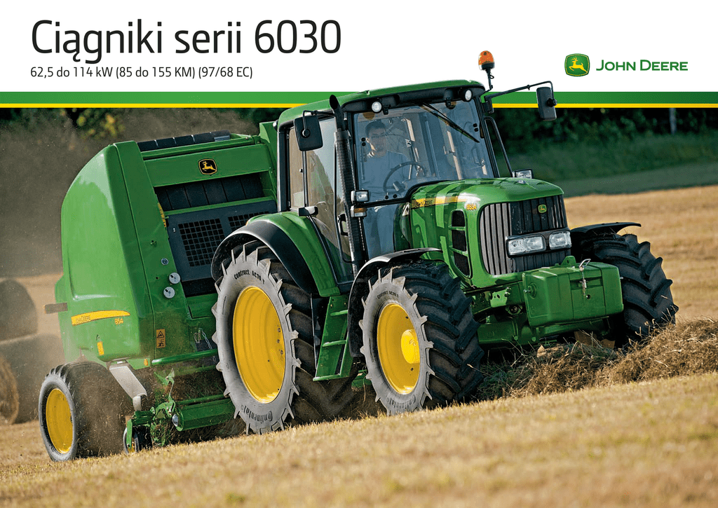 Ciągniki serii 6030 62,5 do 114 kW (85 do 155 KM) (97/68 EC) 2 Ciągniki serii 6030 Spis treści Wstęp����������������������������������������������������������������������������� 2 – 3 Kabina/komfort��������������������������������������������������������������� 4 – 5 Silnik������������������������������������������������������������������������������� 6 – 7 Przekładnie���������������������������������������������������������������������� 8 – 9 Prace związane z hodowlą zwierząt������������������������������ 10 – 11 Prace uprawowe������������������������������������������������������������������ 12 Serwis/wsparcie������������������������������������������������������������������ 14 Charakterystyka techniczna������������������������������������������������� 15 Zaangażowanie Dealera������������������������������������������������������� 16 Zalety – • Większy wybór • Dwa modele szczególnie do prac uprawowych • Przestronna i wygodna kabina • Wydajny silnik Modele* 6130 – 62,5 kW (85 KM) 6230 – 70 kW (95 KM) 6330 – 77 kW (105 KM) 6430 – 88 kW (120 KM) 6534 – 92 kW (125 KM) 6630 – 99 kW (135 KM) 6830 – 107 kW (145 KM) 6930 – 114 kW (155 KM) * Wg normy 97/68 EC Seria 6030 – 62,5 do 114 kW (85 do 155 KM) (97/68 EC) Poszerz swoje horyzonty Szukasz potężnej siły uciągu, która rozszerzy zakres Twoich prac? Wszechstronne i mocne ciągniki serii 6030 są gotowe Ci pomóc. Ciągniki serii 6030 oferują wysoką moc i sprawdzoną niezawodność John Deere. Modele 6830 – 107 kW (145 KM) i 6930 – 114 kW (155 KM) dostarczą siły, dzięki której skuteczniej poradzisz sobie z ciężkimi pracami uprawowymi. Potrzebujesz jeszcze większej efektywności? Wybierz model 6534. Zamontowaliśmy nasz lżejszy, ale mocniejszy 4-cylindrowy silnik do ramy o wyjątkowej stabilności stosowanej w silnikach 6-cylindrowych, dzięki czemu możliwe jest przenoszenie cięższych ładunków, zwiększenie siły uciągu na wzniesieniach i na drodze przy wciąż oszczędnym zużyciu paliwa. Wielki zbiornik paliwa umożliwia pracę przez cały dzień, a szerokie opony równomiernie rozkładające obciążenie ułatwiają pracę zarówno w polu, jak i na drodze. Lepsza widoczność Dzięki dużej przedniej szybie i opcjonalnej szklanej klapie dachowej wykonywane czynności są jeszcze lepiej widoczne. Niezakłócony widok na zaczep rolniczy ułatwia sprzęganie narzędzi. Wyższy komfort Kabina w serii 6030 zapewnia duży komfort, nawet podczas najciężyszych zadań. Dodatkowo, elektryczny lewostronny rewerser sprawia, że praca ładowaczem jest płynna i sprawna. Większy wybór modeli Duża moc i sprawdzona niezawodność modeli 6830 i 6930 czynią je idealnymi do prac przy hodowli i do prac uprawowych. Wyższa wydajność Amortyzacja TLS John Deere to wyższy komfort pracy i mniejsze zmęczenie operatora, a co za tym idzie – wyższa wydajność na polu i na drodze. 3 4 Kabina/Komfort w ciągnikach serii 6030 Niezrównana widoczność Opcjonalna klapa dachowa z szybą poprawia widoczność w ciasnych, niskich budynkach, ułatwiając obserwację ładunków normalnie znajdujących się poza zasięgiem wzroku. Wejdź do nowej, przestronnej kabiny z dowolnej strony i doświadcz otaczającego Cię komfortu i wygody. Spójrz do przodu, na boki i do tyłu – nieograniczona widoczność w każdym kierunku i łatwe w użytkowaniu, logicznie rozmieszczone elementy sterownicze tuż pod ręką tworzą komfortowe otoczenie, które uprzyjemni każdą pracę, czyniąc ją bardziej wydajną. Ale to jeszcze nie koniec... lewe i prawe drzwi, wydajna wentylacja i przestronne wnętrze zapewnią Ci najwyższy poziom wygody i funkcjonalności w tej klasie ciągników. Opcjonalna, uchylna przednia szyba poprawia cyrkulację powietrza w kabinie. Opcjonalne siedzisko pasażera można złożyć, aby nie przeszkadzało wtedy, gdy nie jest używane. Zalety – • Znakomita widoczność • Łatwe w użytkowaniu elementy sterownicze • Przestronna, komfortowa kabina Seria 6030 – 62,5 do 114 kW (85 do 155 KM) (97/68 EC) 3 1 4 2 1 W jednej chwili zmienisz kierunek jazdy za pomocą elektrycznego rewersera lewostronnego, gdy prawa ręka spoczywa na elementach sterowniczych. Praca z ładowaczem i wykonywanie nawrotów przebiega płynnie i łatwo. 2 Przechylną kolumnę kierowniczą z teleskopową regulacją wysokości można perfekcyjnie dopasować do każdego operatora. 3 Czytelny zespół przyrządów i wskaźników przesuwa się wraz z kolumną kierowniczą. 4 Umieszczony na prawej konsoli układ ogrzewania i wentylacji jest łatwo dostępny, zapewniając nieograniczony widok przez przednią szybę. Opcjonalne Biuro Polowe to wyjmowany schowek na długopisy, notatki, instrukcje i inne ważne dokumenty. 5 6 Osiągi silnika ciągników serii 6030 Niezawodna moc Gdy będziesz gotowy do rozpoczęcia pracy, nasz
