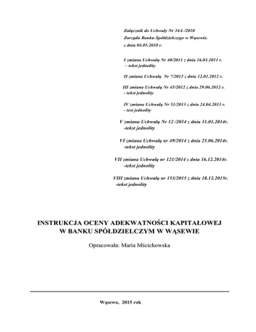 Załącznik do Uchwały Nr 34A /2010 Zarządu Banku Spółdzielczego w Wąsewie. z dnia 04.05.2010 r. I zmiana Uchwałą Nr 40/2011 z dnia 16.03.2011 r. – tekst jednolity II zmiana Uchwałą Nr 7/2012 z dnia 12.01.2012 r. III zmiana Uchwałą Nr 45/2012 z dnia 29.06.2012 r. - tekst jednolity IV zmiana Uchwałą Nr 51/2013 z dnia 24.04.2013 r. - test jednolity V zmiana Uchwałą Nr 12 /2014 z dnia 31.01.2014r. -tekst jednolity VI zmiana Uchwałą nr 49/2014 z dnia 25.06.2014r. -tekst jednolity VII zmiana Uchwałą nr 121/2014 z dnia 16.12.2014r. -tekst jednolity VIII zmiana Uchwałą nr 153/2015 z dnia 18.12.2015r. -tekst jednolity INSTRUKCJA OCENY ADEKWATNOŚCI KAPITAŁOWEJ W BANKU SPÓŁDZIELCZYM W WĄSEWIE Opracowała: Maria Mścichowska Wąsewo, 2015 rok Spis treści 1. Postanowienia ogólne 3 2. Minimalne wymogi kapitałowe z tytułu poszczególnych rodzajów ryzyka 10 3. Szacowanie wymogów wewnętrznych 14 4. Procedura przeglądu procesu szacowania wymogów wewnętrznych w Banku 16 5. Testowanie warunków skrajnych 17 6. Wskaźnik dźwigni finansowej 7. Podział zadań w zakresie wyznaczania wymogów kapitałowych oraz dźwigni finansowej 19 8. Kapitałowe plany awaryjne 21 9. Postanowienia końcowe 24 Załączniki: 1. Załącznik nr 1: Zestawienie wag ryzyka aktywów, wyliczanie wewnętrznego i minimalnego współczynnika wypłacalności 2 20 1. Postanowienia ogólne §1 Instrukcja oceny adekwatności kapitałowej, zwana dalej Instrukcją wprowadza w Banku Spółdzielczym w Wąsewie, zwanym w dalszej części Bankiem, zasady: 1. Ustalania pisemnych kryteriów uznawania poszczególnych rodzajów ryzyka za istotne. 2. Klasyfikacji ekspozycji kredytowych do poszczególnych klas ekspozycji na potrzeby obliczania wymogu kapitałowego z tytułu ryzyka kredytowego. 3. Przypisywania ekspozycjom kredytowym wag ryzyka. 4. Przeprowadzania rachunku adekwatności kapitałowej z tytułu poszczególnych rodzajów ryzyka, uznanych na postawie przeglądu za istotne. 5. Przeglądu procesu oceny adekwatności kapitałowej. 6. Raportowania w zakresie minimalnych i wewnętrznych wymogów kapitałowych. 7. Podziału zadań i kontroli w procesie ustalania i przeglądu zasad ustalania wymogu kapitałowego. §2 Stosowane w dalszej części Instrukcji określenia oznaczają: 1. Ustawa Prawo bankowe - Ustawa z dnia 29.08.1997r. Prawo bankowe (Dz. U. 1 997r., nr 140, poz. 939 z późn. zm. 2. KNF – Komisja Nadzoru Finansowego 3. Uchwały KNF - uchwały Komisji Nadzoru Finansowego z dnia 04 października 2011r. 4. Rozporządzenie UE – Rozporządzenie 575/2013 Unii Europejskiej z dnia 26.06.2013r. 5. Dyrektywa UE – Dyrektywa 2013/36 Unii Europejskiej z dnia 26.06.2013r. 6. Metoda standardowa wyznaczania wymogu kapitałowego z tytułu ryzyka kredytowego – metoda przyjęta przez Bank, określona w Rozporządzeniu UE w art. 111 - 235 . 7. Ekspozycja oznacza pozycję aktywów lub pozycję pozabilansową. 8. Wartość ekspozycji kredytowej - wartość ekspozycji w przypadku aktywów równa wartości bilansowej a w przypadku udzielonych zobowiązań pozabilansowych równa ekwiwalentowi bilansowemu ekspozycji (klasyfikacja stosowana w metodzie standardowej). 9. Klasa ekspozycji kredytowej – jedna z klas, do której Bank kwalifikuje wszystkie swoje ekspozycje kredytowe, zgodnie z Rozporządzeniem UE. 10. Ekspozycje lub ekspozycje warunkowe wobec przedsiębiorców – ekspozycje wobec przedsiębiorców oraz przedsiębiorców zagranicznych w rozumieniu ustawy z dnia 2 lipca 2004r. o swobodzie działalności gospodarczej ( Dz. U. Nr 173, poz. 1807 z późn. zm.) oraz osób fizycznych, nie spełniających wymogów kwalifikowania do detalicznych ekspozycji kredytowych. Ekspozycjom lub ekspozycjom warunkowym wobec przedsiębiorców nadaje się wagę ryzyka 100% w rachunku adekwatności kapitałowej. Wobec przedsiębiorców stosuje się ujednolicone metodyki oceny zdolności kredytowej z możliwością zastosowania indywidualnego podejścia, w tym stosowania przez Zarząd w uzasadnionych przypadkach odstępstw od obowiązujących regulacji. 11. Ekspozycja detaliczna lub warunkowa ekspozycja detaliczna – ekspozycja spełniająca następujące warunki: 1) ekspozycja jest ekspozycją wobec osoby lub osób fizycznych, lub wobec małego 3 lub średniego przedsiębiorcy, przy czym za małego lub średniego przedsiębiorcę należy uznać podmiot spełniający, co najmniej jedno z następujących kryteriów: a. roczny obrót netto nie przekroczył w co najmniej jednym z dwóch ostatnich lat obrotowych równowartości w złotych kwoty 50 000 000 euro, przeliczonej według kursu średniego ogłaszanego przez Narodowy Bank Polski, obowiązującego w dniu sporządzenia bilansu przedsiębiorcy, b. suma aktywów bilansu na koniec co najmniej jednego z dwóch ostatnich lat nie przekroczyła równowartości w złotych kwoty 43 000 000 euro, przeliczonej według kursu średniego ogłaszanego przez Narodowy Bank Polski, obowiązującego w dniu sporządzenia bilansu przedsiębiorcy; 2) ekspozycja jest jedną ze znacznej liczby ekspozycji cechujących się podobnymi właściwościami, dzięki którym ryzyka związane z tego rodzaju kredytami są znacznie zmniejszone; 3) całkowita kwota, którą dłużnik lub grupa powiązanych dłużników jest winna bankowi łącznie z wszelkimi przeterminowanymi ekspozycjami, jednak z wyłączeniem ekspozycji lub ekspozycji warunkowych efektywnie zabezpieczonych na nieruchomościach mieszkalnych, nie może według zebranych przez bank z należytą starannością informacji przekraczać równowartości w złotych kwoty 1.000.000 euro, przeliczonej według kursu średniego ogłaszanego przez Narodowy Bank Polski, obowiązującego w dniu sprawozdawczym. Za ekspozycje wymienione w ust.11 pkt 2) w Banku uznaje się ekspozycje, cechujące się podobną charakterystyką ryzyka kredytowego, które podlegają ocenie zdolności kredytowej przed i po udzieleniu kredytu (monitoring) w sposób określony d
