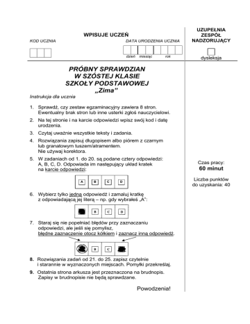 WPISUJE UCZEŃ KOD UCZNIA DATA URODZENIA UCZNIA dzień miesiąc rok UZUPEŁNIA ZESPÓŁ NADZORUJĄCY dysleksja PRÓBNY SPRAWDZIAN W SZÓSTEJ KLASIE SZKOŁY PODSTAWOWEJ „Zima” Instrukcja dla ucznia 1. Sprawdź, czy zestaw egzaminacyjny zawiera 8 stron. Ewentualny brak stron lub inne usterki zgłoś nauczycielowi. 2. Na tej stronie i na karcie odpowiedzi wpisz swój kod i datę urodzenia. 3. Czytaj uważnie wszystkie teksty i zadania. 4. Rozwiązania zapisuj długopisem albo piórem z czarnym lub granatowym tuszem/atramentem. Nie używaj korektora. 5. W zadaniach od 1. do 20. są podane cztery odpowiedzi: A, B, C, D. Odpowiada im następujący układ kratek na karcie odpowiedzi: A B C Czas pracy: 60 minut Liczba punktów do uzyskania: 40 D 6. Wybierz tylko jedną odpowiedź i zamaluj kratkę z odpowiadającą jej literą – np. gdy wybrałeś „A”: 7. Staraj się nie popełniać błędów przy zaznaczaniu odpowiedzi, ale jeśli się pomylisz, błędne zaznaczenie otocz kółkiem i zaznacz inną odpowiedź. 8. Rozwiązania zadań od 21. do 25. zapisz czytelnie i starannie w wyznaczonych miejscach. Pomyłki przekreślaj. 9. Ostatnia strona arkusza jest przeznaczona na brudnopis. Zapisy w brudnopisie nie będą sprawdzane. Powodzenia! Przeczytaj uważnie tekst. (...) Na placu najśmielsi chłopcy przywiązywali często swoje saneczki do chłopskiego wozu i jechali w ten sposób spory kawał drogi. Było to bardzo wesołe. Kiedy się w najlepsze bawili, nadjechały jakieś wielkie sanie; były pomalowane całe na biało, a w środku siedział ktoś otulony w białe futro i w białej futrzanej czapce; sanie objechały plac dwa razy dookoła. Kay przywiązał do nich szybko swoje saneczki i jechał za dużymi saniami; jechali coraz prędzej i prędzej, prosto przed siebie w najbliższą ulicę; osoba, która siedziała w saniach, odwróciła się, kiwnęła przyjaźnie do Kaya głową, zupełnie tak, jakby się znali od dawna; za każdym razem, kiedy Kay chciał odwiązać swoje saneczki, osoba znowu do niego kiwała Kay zostawał; wyjechali za bramę miasta, wtedy śnieg zaczął tak sypać, że chłopiec, jadąc dalej, nie widział nawet ręki, którą trzymał przed oczami; puścił prędko sznur od saneczek, by uwolnić się od wielkich sań, ale to nie pomogło, jego małe saneczki przywiązane były mocno i jak wiatr pędziły naprzód.(...) Płatki śniegu stawały się coraz większe i większe i w końcu wyglądały jak duże, białe kury; nagle odskoczyły na bok, wielkie sanie zatrzymały się i osoba, która w nich jechała, wyprostowała się, jej futro i czapka były całe ze śniegu; a ona sama była damą smukłą i wysoką, jaśniejącą bielą – Królową Śniegu.(...) Ściany pałacu zrobione były ze śnieżnej zawiei, a okna i drzwi z ostrych wiatrów; było tam przeszło sto sal, zależnie od tego, jak zawiał śnieg; największa sala rozciągała się wiele mil, wszystkie oświetlało silne światło zorzy polarnej; były wielkie, puste, lodowato zimne i błyszczące! Nie panowała tu nigdy radość (...). Pośrodku pustej, nieskończonej, śnieżnej sali leżało zamarznięte jezioro, które popękało na tysiąc kawałków, ale jeden kawałek był podobny do drugiego, było to prawdziwe dzieło sztuki.(...) Mały Kay był zupełnie siny z mrozu, prawie czarny, ale nie spostrzegał tego wcale, gdyż Królowa Śniegu odjęła mu swym pocałunkiem wrażliwość na zimno, a jego serce stało się kawałkiem lodu. (...) Fragment baśni H. Ch. Andersena pt. Królowa Śniegu, Warszawa 1956. Zadania od 1. do 5. odnoszą się do przedstawionego tekstu. 1. Powyższy tekst jest fragmentem baśni. W baśni A. miejsce akcji jest dokładnie określone. B. czas akcji jest dokładnie określony. C. występują postacie fantastyczne. D. występują postacie historyczne. 2. Ubiór Królowej Śniegu wykonany był A. z lodu. B. ze szronu. C. ze śniegu. D. z futra. 3. Kay A. znał Królową Śniegu i dlatego przywiązał do jej sań swoje saneczki. B. nie znał Królowej Śniegu, ale przywiązał do jej sań swoje saneczki. C. znał Królową Śniegu i dlatego zaprosił ją do wspólnej, zimowej zabawy. D. nie znał Królowej Śniegu, ale zaprosił ją do wspólnej, zimowej zabawy. 2 0 4. Które ze zdań nie jest prawdziwe? A. Kay był śmiałym chłopcem. B. Kay był otulony w białe futro. C. Kay był zupełnie siny z mrozu. D. Kay był zachwycony zabawą na placu. 5. Podkreślony w tekście na stronie 2. fragment jest A. opisem pałacu. B. opisem Królowej Śniegu. C. sprawozdaniem z wizyty w pałacu. D. opowiadaniem o mieszkańcach pałacu. 6. Gdy temperatura powietrza spada poniżej 0°C, rano na trawie zamiast rosy osadza się A. śnieg. B. grad. C. mżawka. D. szron. 7. W styczniu na półkuli południowej jest A. wiosna. B. lato. C. jesień. D. zima. Przeczytaj uważnie nuty i fragment tekstu piosenki. Sanna Soprano 1. Zima, zima, zima, pada, pada śnieg! Jadę, jadę w świat sankami, sanki dzwonią dzwoneczkami: dzyń, dzyń, dzyń, dzyń, dzyń, dzyń, dzyń, dzyń, dzyń. 2. Jaka pyszna sanna, parska raźno koń. Śnieg rozbija kopytami, sanki dzwonią dzwoneczkami: dzyń, dzyń, dzyń, dzyń, dzyń, dzyń, dzyń, dzyń, dzyń. Zadania: 8. i 9. odnoszą się do przedstawionych nut i tekstu piosenki. 8. W refrenie piosenki występują A. epitety. B. przenośnie. C. porównania. D. wyrazy dźwiękonaśladowcze. 3 9. W zapisie nutowym piosenki Sanna przeważają A. ósemki. B. ćwierćnuty. C. półnuty. D. całe nuty. 10. Który z instrumentów nie pasuje do pozostałych? A. Tamburyn. B. Dzwonki. C. Trójkąt. D. Flet. Przeczytaj ofertę księgarni. Oferta księgarni Baśnie Autor: H.Ch. Andersen Baśnie nad baśniami Autor: H. Ch. Andersen Baśnie Autor: H. Ch. Andersen Baśnie Autor: H. Ch. Andersen Wydawnictwo: Elipsa Rok wydania: 1997 Format: 215 mm x 300 mm Ilość stron: 320 Cena: 41,00 zł Wydawnictwo: Zielona Sowa Rok wydania: 2003 Format: 1,40 dm x 2 dm Ilość 