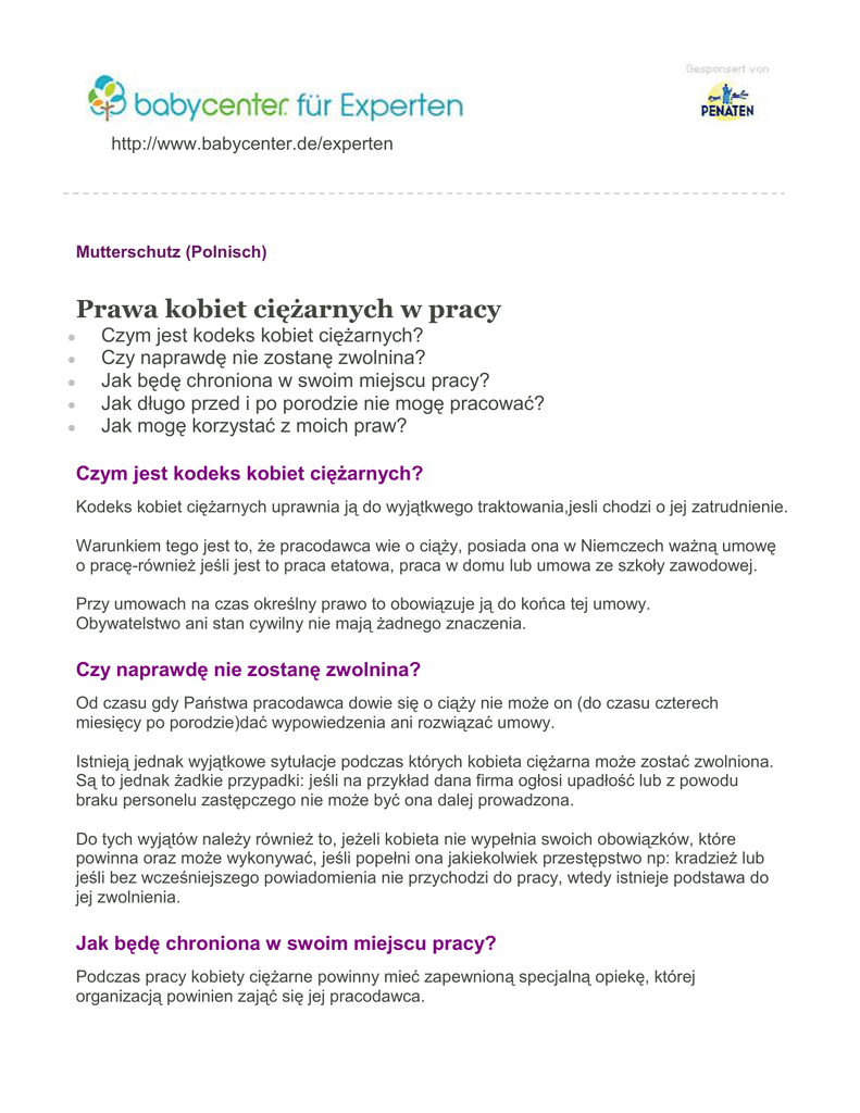 http://www.babycenter.de/experten Mutterschutz (Polnisch) Prawa kobiet ciężarnych w pracy Czym jest kodeks kobiet ciężarnych? Czy naprawdę nie zostanę zwolnina? Jak będę chroniona w swoim miejscu pracy? Jak długo przed i po porodzie nie mogę pracować? Jak mogę korzystać z moich praw? Czym jest kodeks kobiet ciężarnych? Kodeks kobiet ciężarnych uprawnia ją do wyjątkwego traktowania,jesli chodzi o jej zatrudnienie. Warunkiem tego jest to, że pracodawca wie o ciąży, posiada ona w Niemczech ważną umowę o pracę-również jeśli jest to praca etatowa, praca w domu lub umowa ze szkoły zawodowej. Przy umowach na czas określny prawo to obowiązuje ją do końca tej umowy. Obywatelstwo ani stan cywilny nie mają żadnego znaczenia. Czy naprawdę nie zostanę zwolnina? Od czasu gdy Państwa pracodawca dowie się o ciąży nie może on (do czasu czterech miesięcy po porodzie)dać wypowiedzenia ani rozwiązać umowy. Istnieją jednak wyjątkowe sytułacje podczas których kobieta ciężarna może zostać zwolniona. Są to jednak żadkie przypadki: jeśli na przykład dana firma ogłosi upadłość lub z powodu braku personelu zastępczego nie może być ona dalej prowadzona. Do tych wyjątów należy również to, jeżeli kobieta nie wypełnia swoich obowiązków, które powinna oraz może wykonywać, jeśli popełni ona jakiekolwiek przestępstwo np: kradzież lub jeśli bez wcześniejszego powiadomienia nie przychodzi do pracy, wtedy istnieje podstawa do jej zwolnienia. Jak będę chroniona w swoim miejscu pracy? Podczas pracy kobiety ciężarne powinny mieć zapewnioną specjalną opiekę, której organizacją powinien zająć się jej pracodawca. 2 von 3 Do takiej opieki należą: • możliwość odpoczynku- przyszłe matki oraz matki karmiące piersią muszą mieć możliwość odpoczynku w czasie pracy, w odpowiednim dla nich miejscu • odpowiednie miejsce pracy- praca kobiety ciężarnej musi zostać tak zorganizowana,żeby miała ona możliwość do robienia przerw, możliwość do częstych zmian pozycji, jak również nie powinna ona za długo pracowć przed komputerem • rzeczy szkodzące zdrowiu- kobiety ciężarne nie powinny podnosić ciężkich przedmiotów podczas swojej pracy (jednorazowo nie więcej niż 5 kilogramów, częściej nie więcej niż 10 kg) jak również nie wykonywać innych zbyt męczących czynności Powinny one również być chronione od szkodzących materiałów, promieni, gazów, oparów, wysokich oraz niskich temperatór, wilgocią oraz hałasem. Istnieją również główne oraz indywidualne zajęcia które nie mogą być wykonywane przez kobiety w ciąży. Jeśli miejsce pracy nie spełnia odpowiednich wymogów, lekarz Państwa może wtedy wystawić zaświadczenie na czasowe lub całkowite niewykonywanie pracy. Główne zajęcia które nie mogą być wykonywane podczas ciąży: • praca przy taśmie- której obsługa wymaga odpowiedniego tempa • praca nocna (między 20 a 6 godziną), godziny nadliczbwe, niedziele oraz święta • jeśli kobieta ciężarna - od piątego miesiąca ciąży ,musi wykonywać swoją pracę w pozycji stojącej więcej niż cztery godziny dziennie • praca przy ktorej musi ona często kucać lub nadmiernie sie wyginać • przy obsłudze maszyn za pomocą nogi • zawody które zwiększają ryzyko zachorowania dla matki lub dziecka • zawody z większym ryzykiem wypadku • prace polegające na obrabianiu drewna W poszczególnych branżach takich jak na przykład hotele i restauracje kobiety ciężarne mają dodatkowe przywileje. Indywidualny zakaz kontynuawania pracy, lekarz może wystawić Paniom wtedy gdy: - są Panie chore - jeśli ciąża jest mnoga - lub jeśli po porodzie dalsza praca nie może być w pełni wykonywana Jak długo przed i po porodzie nie mogę pracować? Przed jak również po porodzie mają Panie określony czas, w którym zabronione jest wykonywanie określonych czynności.W przypadku normalnej ciąży jest to okres sześciu tygodni przed terminem porodu i ośmiu tygodni po terminie porodu. Podczas ciąży mnogiej lub wcześniejszym terminie, czas zakazu trwa do dwunastu tygdoni po porodzie. Jeśli dziecko urodzi się po planowanym terminie, zakaz ten nie zmienia się. http://www.babycenter.de/experten 3 von 3 Również kobiety karmiące piersią obwiązują szczególne prawa.Jeśli wraca ona do pracy, to przysługują jej wtedy przerwy na karmienie- przynajmniej dwa razy dziennie po pół godziny. Ten czas nie musi i nie powinien zostać odpracowany, oraz nie powinien być wliczany w pozostałe przerwy. Jak mogę korzystać z moich praw? Jeśli Państwa pracodawca nie przestrzega danych zasad, mogą Panie zgołsić się do odpowiedniej placówki, która zajmuje się takimi przypadkami.W niektórych wojewódstwach są to Urzędy Ochrony Pracy. Adresy znajdą Panie w Urzędzie Wojewódskim do Spraw Rodziny. Zlekceważenie danych przepisów przez pracodawce może prowadzić do poważnych problemów jakimi są kary pieniężne w wysokości do 15.000 Euro, jak również kary pozbawienia wolności do jedneg roku. Eigene Notizen: http://www.babycenter.de/experten