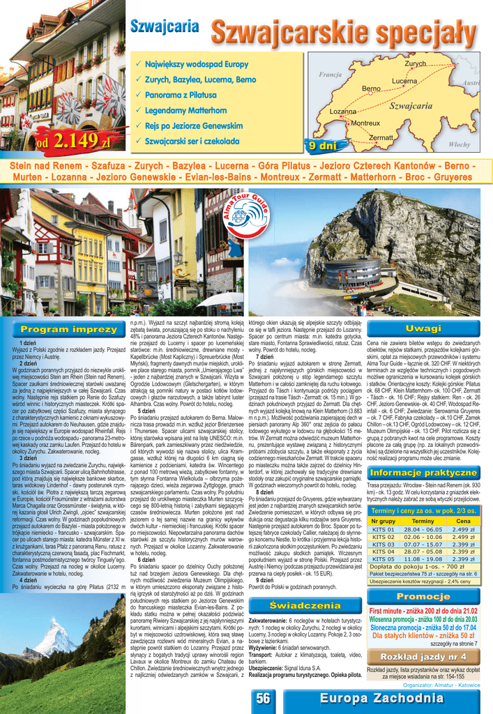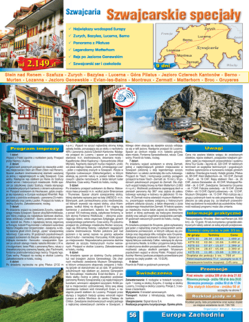 Szwajcarskie specjały Największy wodospad Europy Zurych Francja Zurych, Bazylea, Lucerna, Berno Berno Panorama z Pilatusa Legendarny Matterhorn 2.149 zł Austri Szwajcaria Lozanna Montreux Rejs po Jeziorze Genewskim od Lucerna Zermatt Szwajcarski ser i czekolada Włochy 9 dni Stein nad Renem - Szafuza - Zurych - Bazylea - Lucerna - Góra Pilatus - Jezioro Czterech Kantonów - Berno Murten - Lozanna - Jezioro Genewskie - Evian-les-Bains - Montreux - Zermatt - Matterhorn - Broc - Gruyeres Program imprezy 1 dzień Wyjazd z Polski zgodnie z rozkładem jazdy. Przejazd przez Niemcy i Austrię. 2 dzień W godzinach porannych przyjazd do niezwykle urokliwej miejscowości Stein am Rhein (Stein nad Renem). Spacer zaułkami średniowiecznej starówki uważanej za jedną z najpiękniejszych w całej Szwajcarii. Czas wolny. Następnie rejs statkiem po Renie do Szafuzy wśród winnic i historycznych miasteczek. Krótki spacer po zabytkowej części Szafuzy, miasta słynącego z charakterystycznych kamienic z oknami wykuszowymi. Przejazd autokarem do Neuhausen, gdzie znajduje się największy w Europie wodospad Rheinfall. Rejs po rzece u podnóża wodospadu - panorama 23-metrowej kaskady oraz zamku Laufen. Przejazd do hotelu w okolicy Zurychu. Zakwaterowanie, nocleg. 3 dzień Po śniadaniu wyjazd na zwiedzanie Zurychu, największego miasta Szwajcarii. Spacer ulicą Bahnhofstrasse, pod którą znajdują się największe bankowe skarbce, taras widokowy Lindenhof - dawny posterunek rzymski, kościół św. Piotra z największą tarczą zegarową w Europie, kościół Fraumünster z witrażami autorstwa Marca Chagalla oraz Grossmünster - świątynia, w której kazania głosił Ulrich Zwingli, „ojciec” szwajcarskiej reformacji. Czas wolny. W godzinach popołudniowych przejazd autokarem do Bazylei - miasta położonego w trójkącie niemiecko - francusko - szwajcarskim. Spacer po ulicach starego miasta: katedra Münster z XI w. z krużgankami, taras Pfalz z panoramą Renu, ratusz z charakterystyczną czerwoną fasadą, plac Fischmarkt, fontanna postmodernistycznego twórcy Tinguely”ego. Czas wolny. Przejazd na nocleg w okolice Lucerny. Zakwaterowanie w hotelu, nocleg. 4 dzień Po śniadaniu wycieczka na górę Pilatus (2132 m n.p.m.). Wyjazd na szczyt najbardziej stromą koleją zębatą świata, poruszającą się po stoku o nachyleniu 48% i panorama Jeziora Czterech Kantonów. Następnie przejazd do Lucerny i spacer po lucerneńskiej starówce: m.in. średniowieczne, drewniane mosty Kapellbrücke (Most Kapliczny) i Spreuerbrücke (Most Młyński), fragmenty dawnych murów miejskich, urokliwe place starego miasta, pomnik „Umierającego Lwa” - jeden z najbardziej znanych w Szwajcarii. Wizyta w Ogrodzie Lodowcowym (Gletschergarten), w którym atrakcją są pomniki natury w postaci kotłów lodowcowych i głazów narzutowych, a także labirynt luster Alhambra. Czas wolny. Powrót do hotelu, nocleg. 5 dzień Po śniadaniu przejazd autokarem do Berna. Malownicza trasa prowadzi m.in. wzdłuż jezior Brienzersee i Thunersee. Spacer ulicami szwajcarskiej stolicy, której starówka wpisana jest na listę UNESCO: m.in. Bärenpark, park zamieszkiwany przez niedźwiedzie, od których wywodzi się nazwa stolicy, ulica Kramgasse, wzdłuż której na długości 6 km ciągną się kamienice z podcieniami, katedra św. Wincentego z ponad 100 metrową wieżą, zabytkowe fontanny, w tym słynna Fontanna Wielkoluda – olbrzyma pożerającego dzieci, wieża zegarowa Zyttglogge, gmach szwajcarskiego parlamentu. Czas wolny. Po południu przejazd do urokliwego miasteczka Murten szczycącego się 800-letnią historią i zabytkami sięgającymi czasów średniowiecza. Murten położone jest nad jeziorem o tej samej nazwie na granicy wpływów dwóch kultur - niemieckiej i francuskiej. Krótki spacer po miejscowości. Niepowtarzalna panorama dachów starówki ze szczytu historycznych murów warownych. Przejazd w okolice Lozanny. Zakwaterowanie w hotelu, nocleg. 6 dzień Po śniadaniu spacer po dzielnicy Ouchy położonej tuż nad brzegiem Jeziora Genewskiego. Dla chętnych możliwość zwiedzenia Muzeum Olimpijskiego, w którym umieszczono eksponaty związane z historią igrzysk od starożytności aż po dziś. W godzinach południowych rejs statkiem po Jeziorze Genewskim do francuskiego miasteczka Evian-les-Bains. Z pokładu statku można w pełnej okazałości podziwiać panoramę Riwiery Szwajcarskiej z jej najsłynniejszymi kurortami, winnicami i alpejskimi szczytami. Krótki pobyt w miejscowości uzdrowiskowej, która swą sławę zawdzięcza rozlewni wód mineralnych Evian, a następnie powrót statkiem do Lozanny. Przejazd przez słynący z bogatych tradycji uprawy winorośli region Lavaux w okolice Montreux do zamku Chateau de Chillon. Zwiedzanie średniowiecznych wnętrz jednego z najliczniej odwiedzanych zamków w Szwajcarii, z którego okien ukazują się alpejskie szczyty odbijające się w tafli jeziora. Następnie przejazd do Lozanny. Spacer po centrum miasta: m.in. katedra gotycka, stare miasto, Fontanna Sprawiedliwości, ratusz. Czas wolny. Powrót do hotelu, nocleg. 7 dzień Po śniadaniu wyjazd autokarem w stronę Zermatt, jednej z najsłynniejszych górskich miejscowości w Szwajcarii położonej u stóp legendarnego szczytu Matterhorn i w całości zamkniętej dla ruchu kołowego. Przyjazd do Täsch i kontynuacja podróży pociągiem (przejazd na trasie Täsch - Zermatt: ok. 15 min.). W godzinach południowych przyjazd do Zermatt. Dla chętnych wyjazd kolejką linową na Klein Matterhorn (3.883 m n.p.m.). Możliwość podziwiania zapierającej dech w piersiach panoramy Alp 360° oraz zejścia do pałacu lodowego wykutego w lodowcu na głębokości 15 metrów. W Zermatt można odwiedzić muzeum Matterhornu, prezentujące wystawę związaną z historycznymi próbami zdobycia szczytu, a także eksponaty z życia codziennego mieszkańców Zermatt. W trakcie spaceru po miasteczku można także zajrzeć do
