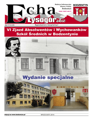 Biuletyn Informacyjny Miasta i Gminy Bodzentyn Rok VI Nr 6(30) więcej na www.bodzentyn.pl Egzemplarz bezpłatny! w r z e s i e ń 2014 E C H A ŁY S O G Ó R s k i e Szanowni Państwo, drodzy goście Oddajemy w Państwa ręce specjalne wydanie naszego biuletynu. Zawsze staraliśmy się uczestniczyć w ważnych i podniosłych wydarzeniach związanych z regionem Bodzentyna i jego okolic, dlatego też nie mogło nas zabraknąć w tak ważnym wydarzeniu, jakim jest Zjazd Absolwentów i Wychowanków Szkół Średnich w Bodzentynie. Drodzy Absolwenci, Wychowankowie, Koleżanki i Koledzy! Fakt, że trzymacie Państwo w ręku to wydawnictwo dowodzi, że szaleńczy pęd czasu można jednak zatrzymać. Magia bodzentyńskich szkół średnich ponownie zadziałała. Wystarczy usiąść w ławce, spojrzeć na tablicę, aby po raz kolejny odbyć podróż w czasie, przywołać wspomnienia z przeszłości, dokonać swoistego rodzaju retrospekcji. Spotkanie po latach1 Żyjemy Więcej zysków czy strat? Dano nam mało czasu Na szczęście na miłość na zdrowie Wyleczono z marzeń odarto ze złudzeń Ze zdziwieniem pytaliśmy czy świat tylko taki? Pięćdziesiąt lat temu Na skrzydłach marzeń Młodzi i piękni Opuściliśmy Bodzentyńskie liceum Pełni energii chcieliśmy podbijać świat I znaleźć w nim swoje miejsce Dobrze że chcieliśmy się spotykać Niektórzy nie przyszli Bo odeszli Niektórzy nie chcieli przyjść Z im tylko wiadomych względów Dobrze że nie baliśmy się skonfrontować Siebie dawnych z dzisiejszym sobą Dobrze że choć na chwilę Mogliśmy się przenieść do początku Kiedy wszystko zaczynało się I ze strzępów zapamiętanych zdarzeń Odtworzyć świat utracony Czas ruszył biegł przyspieszał gonił Robiliśmy dyplomy Żyliśmy pełnią życia Budowaliśmy nasze gniazda Wychowywaliśmy dzieci Przybywało lat Ubywało sił Ubywało bliskich przyjaciół znajomych Przybywało siwych włosów i zmarszczek I rzadziej pojawiał się uśmiech na twarzy Doświadczeni w szkole życia Nieźle poobijani 1 Dziś, po raz kolejny, dane jest nam uczestniczyć w Zjeździe Absolwentów i Wychowanków Szkół Średnich w Bodzentynie, które to szkoły na przestrzeni tylu już lat przygotowały do życia wiele pokoleń, wpisując się na stałe w życiorysy absolwentów. Z perspektywy wielu lat, bogatsi o doświadczenia życiowe, spoglądamy na lata spędzone w murach tej szkoły. Dla wielu z nas był to najpiękniejszy i najszczęśliwszy okres w naszym życiu. Dziś do tamtych lat możemy wrócić już tylko wspomnieniami. Wracamy, jako dorosłe osoby, do - bardziej lub mniej - odległej przeszłości, do szkoły, która kształtowała nasze osobowości, która była świadkiem naszej młodości i dorastania. Wracamy aby wspomnieniami i naszą obecnością tu spłacić dług zaciągnięty przed laty wobec tej szkoły i osób, które swój czas i swoje życie poświęciły na przekazywaniu uczniom swojej wiedzy i swoich doświadczeń. Wszystkim Państwu życzę, aby ten zjazd koleżeński na zawsze pozostał w Państwa pamięci, abyście, z tej niezwykłej podróży, wrócili z poczuciem dobrze wypełnionego obowiązku wobec samego siebie i wobec tej szkoły. Stanisław Marek Krak Burmistrz Miasta i Gminy Bodzentyn Alicja Krawczyk (z d. Gulba) – matura 1964 Spotkanie absolwentów, rocznik 1963/63. Bodzentyn 14 czerwca 2014 r. 2 w r z e s i e ń 2014 więcej na www.bodzentyn.pl E C H A ŁY S O G Ó R s k i e „Dzieci” Bodzentyna (Absolwenci liceum z 2-giej połowy 20 wieku – 1964) Wyszliśmy stąd Z bodzentyńskiego liceum I każdy poszedł swoją drogą Halina1 moja szkolna przyjaciółka Z która przemierzałyśmy codziennie Kilka kilometrów do szkoły Został nauczycielką muzyki W wojewódzkim mieście Dziś jest ławnikiem w sądzie Krysia2 sliczna drobniutka o pięknych oczach Ma swoją aptekę I Lucyna3 jest farmaceutką Ziutka4 pracuje w Urzędzie Wojewódzkim Krystyna5 z ,,c” klasy uczy matematyki W średniej szkole i jest wicedyrektorem Ewa6 jest nauczycielką matematyki w liceum Marysia7 uczy matematyki w medyku Danusia8 jest polonistką Belfruje w szkole średniej Marysia9 podobna do Szymborskiej Tez jest polonistką Wanda10 uczy polskiego w szkole sredniej I Alka11 ukończyła polonistykę Zajmuje się m.in. pracą redakcyjną Lodzia12 jest cenionym pracownikiem banku Jest szczęśliwą mamą czwórki dorosłych dzieci Basia13 jest ekonomistką Władek14 z ,,c” klasy jest księdzem Pełni wazne funkcje w hierarchii kościelnej Bolek15 ukończył WAT Jest pułkownikiem Wojska Polskiego Kaziu16 pracuje jako inspektor w skarbówce Staszek17 trochę starszy kolega Halina Pawlik z d. Jaros z kl. ,,a” Krysia Piskulak z d. Jamroży z kl. ,,a” 3 Lucyna Sędzielewska z d. Mazurek, kl. ,,b” 4 Józefa Mróz z d. Micigolska, kl. ,,c” 5 Krystyna Dobrucka z d. Obara z kl. ,,c” 6 Ewa Cheda z d. Libuda z kl. ,,a” 7 Marysia Ksel z kl. ,,b” 8 Danuta Zakrzewska z d. Góźdź z kl. ,,b” 9 Maria Nazary z d. Michalczyk z kl. ,,a” 10 Wanda Gołofit z d. Sarnecka z kl. ,,b” 11 Alicja Krawczyk z d. Gulba z kl. ,,a” 12 Leokadia Puchała z d. Dziuba z kl. ,,a” 13 Barbara Soczyńska z d. Tarłowska z kl. ,,b” 14 Władysław Sowa z kl. ,,c” 15 Bolesław Waciński z kl. ,,c” 16 Kazimierz Kaczor z kl. ,,c” 17 Stanisław Dobrucki, matura 1960/61 1 2 więcej na www.bodzentyn.pl Jest znanym ortopedą mężem Krystyny Stworzyli szczęśliwą rodzinę Mają czworo dorosłych dzieci Lutek18 z naszej klasy osiadł na Śląsku I tam robi karierę w kopalni Jaś19 z ,,c” klasy pasjonuje się historią Uczył tego przedmiotu gdzieś na Dolnym Śląsku Nie żyje To tylko kilka przykładów życiowych wyborów ,,Dzieci” Bodzentyna Wszyscy są kimś Lub kimś byli Nawet jeżeli już ich nie ma Nasze pokolenie Zaistniało w potoku dziejów Na krótkim odcinku czasu Może nawet jednym zdaniem Nie wspomni o nim żaden dziejopis Pod tym samym niebem Na tej samej ziemi 
