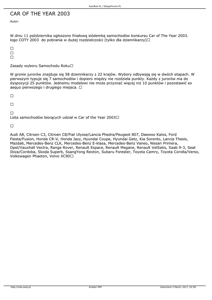 AutoRok.PL / DesignForum.PL CAR OF THE YEAR 2003 Autor: W dniu 11 października ogłoszono finałową siódemkę samochodów konkursu Car of The Year 2003. logo COTY 2003 do pobrania w dużej rozdzielczości (tylko dla dziennikarzy) Zasady wyboru Samochodu Roku W gronie jurorów znajduje się 58 dziennikarzy z 22 krajów. Wybory odbywają się w dwóch etapach. W pierwszym typuje się 7 samochodów i dopiero między nie rozdziela punkty. Każdy z jurorów ma do dyspozycji 25 punktów. Jednemu modelowi nie może przyznać więcej niż 10 punktów i pozostawić ex aequo pierwszego i drugiego miejsca. Lista samochodów biorących udział w Car of the Year 2003 Audi A8, Citroen C3, Citroen C8/Fiat Ulysse/Lancia Phedra/Peugeot 807, Daewoo Kalos, Ford Fiesta/Fusion, Honda CR-V, Honda Jazz, Hyundai Coupe, Hyundai Getz, Kia Sorento, Lancia Thesis, Mazda6, Mercedes-Benz CLK, Mercedes-Benz E-klasa, Mercedes-Benz Vaneo, Nissan Primera, Opel/Vauxhall Vectra, Range Rover, Renault Espace, Renault Megane, Renault VelSatis, Saab 9-3, Seat Ibiza/Cordoba, Skoda Superb, SsangYong Rexton, Subaru Forester, Toyota Camry, Toyota Corolla/Verso, Volkswagen Phaeton, Volvo XC90 http://mas.auto.pl Kreator PDF Utworzono 2 March, 2017, 02:58