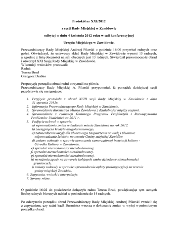 Protokół nr XXI/2012 z sesji Rady Miejskiej w Zawidowie odbytej w dniu 4 kwietnia 2012 roku w sali konferencyjnej Urzędu Miejskiego w Zawidowie. Przewodniczący Rady Miejskiej Andrzej Pilarski o godzinie 16.00 przywitał radnych oraz gości. Oświadczył, że ustawowy skład Rady Miejskiej w Zawidowie wynosi 15 radnych, a zgodnie z listą obecności na sali obecnych jest 13 radnych. Stwierdził prawomocność obrad i otworzył XXI Sesję Rady Miejskiej w Zawidowie. W komisji wniosków pracowali: Radni: Teresa Brud Grzegorz Drabko Propozycję porządku obrad radni otrzymali na piśmie. Przewodniczący Rady Miejskiej A. Pilarski przypomniał, iż porządek dzisiejszej sesji przedstawia się następująco: 1. Przyjęcie protokołu z obrad XVIII sesji Rady Miejskiej w Zawidowie z dnia 31 stycznia 2012r. 2. Informacja Przewodniczącego Rady Miejskiej w Zawidowie. 3. Sprawozdanie Burmistrza Miasta Zawidowa z działalności między sesjami. 4. Sprawozdanie z realizacji Gminnego Programu Profilaktyki i Rozwiązywania Problemów Uzależnień za 2011 r. 5. Podjęcie uchwał w sprawie: a) wprowadzenia zmian w budżecie miasta Zawidowa na rok 2012, b) zaciągnięcia kredytu długoterminowego, c) zatwierdzenia taryfy dla zbiorowego zaopatrzenia w wodę i zbiorowe odprowadzanie ścieków na terenie Gminy miejskiej Zawidów, d) zmiany uchwały w sprawie utworzenia samorządowej instytucji kultury Ośrodka Kultury w Zawidowie, e) sprzedaż nieruchomości niezabudowanej, f) sprzedaż nieruchomości niezabudowanej, g) sprzedaż nieruchomości niezabudowanej, h) wyrażenia zgody na zawarcie kolejnych umów dzierżawy nieruchomości gruntowych, i) zmiany uchwały w sprawie wprowadzenia opłaty prolongacyjnej na terenie gminy miejskiej Zawidów, 6. Zapytania, wnioski i interpelacje. 7. Sprawy różne. O godzinie 16.02 do posiedzenie dołączyła radna Teresa Brud, powiększając tym samych liczbę radnych biorących udział w posiedzeniu do 14 radnych. Po odczytaniu porządku obrad Przewodniczący Rady Miejskiej Andrzej Pilarski zwrócił się z zapytaniem, czy radni bądź Burmistrz wnoszą o dokonanie zmian w wyżej wymienionym porządku obrad. Zastępca Burmistrza Pan Robert Łężny wniósł o usuniecie z porządku obrad punktu „3. Sprawozdanie Burmistrza Miasta Zawidowa z działalności między sesjami” w związku z nieobecnością Burmistrza na sesji. Radna Bożena Szczygielska zauważyła, że jeśli Burmistrz Józef Sontowski jest nieobecny, to sprawozdanie powinien przedstawić Zastępca Burmistrza. Zastępca Burmistrza Pan Robert Łężny odpowiedział, że nie pełni obowiązków Burmistrza Miasta. Przewodniczący A. Pilarski poddał zgłoszony wniosek pod głosowanie. Rada Miejska w obecności 14 radnych, wstrzymujących się- 1, przyjęła ww. wniosek. w głosowaniu:/ za-11, przeciw-2, Przewodniczący A. Pilarski poinformował, iż po zmianie porządek obrad przedstawia się następująco: 1. Przyjęcie protokołu z obrad XVIII sesji Rady Miejskiej w Zawidowie z dnia 31 stycznia 2012r. 2. Informacja Przewodniczącego Rady Miejskiej w Zawidowie. 3. Sprawozdanie z realizacji Gminnego Programu Profilaktyki i Rozwiązywania Problemów Uzależnień za 2011 r. 4. Podjęcie uchwał w sprawie: a) wprowadzenia zmian w budżecie miasta Zawidowa na rok 2012, b) zaciągnięcia kredytu długoterminowego, c) zatwierdzenia taryfy dla zbiorowego zaopatrzenia w wodę i zbiorowe odprowadzanie ścieków na terenie Gminy miejskiej Zawidów, d) zmiany uchwały w sprawie utworzenia samorządowej instytucji kultury Ośrodka Kultury w Zawidowie, e) sprzedaż nieruchomości niezabudowanej, f) sprzedaż nieruchomości niezabudowanej, g) sprzedaż nieruchomości niezabudowanej, h) wyrażenia zgody na zawarcie kolejnych umów dzierżawy nieruchomości gruntowych, i) zmiany uchwały w sprawie wprowadzenia opłaty prolongacyjnej na terenie gminy miejskiej Zawidów, 5. Zapytania, wnioski i interpelacje. 6. Sprawy różne. 1. Przyjęcie protokołu z obrad XVIII sesji Rady Miejskiej w Zawidowie z dnia 31 stycznia 2012r. Przewodniczący A. Pilarski poprosił o wnoszenie uwag do protokołu nr XVIII z sesji Rady Miejskiej z dnia 31 stycznia 2012r. Wobec braku uwag do protokołu Przewodniczący A. Pilarski poddał pod głosowanie projekt protokołu nr XVIII z sesji Rady Miejskiej z dnia 31 stycznia 2012r. Rada Miejska w obecności 14 radnych, wstrzymujących się- 0, przyjęła ww. protokół. w głosowaniu:/ za-14, przeciw-0, 1. Informacja Przewodniczącego Rady Miejskiej w Zawidowie. Przewodniczący Rady A. Pilarski poinformował, iż od dnia 10 do 31 marca br. przebywał na leczeniu uzdrowiskowym i tym samym przekazał na piśmie pełnienie obowiązków Przewodniczącego Wiceprzewodniczącej Rady Miejskiej Pani Gabrieli Micińskiej. Przewodniczący Rady A. Pilarski poinformował o pismach wpływających do Biura Rady Miejskiej: - pismo Przewodniczącego Rady Rodziców Przedszkola Publicznego w Zawidowie Pana Mariusz Drożdża w sprawie zaproszenia na spotkanie w Zespole Szkół dotyczące klas zerowych, które mają być zorganizowane w szkole. Przewodniczący A. Pilarski oznajmił, iż spotkanie odbyło się 16 marca br. w którym brali udział niektórzy radni, Zastępca Burmistrza Robert Łężny, Sekretarz Miasta Marcin Rogacki oraz Kierownik Stanu Cywilnego Pani Barbara Męrdek – Rutowicz. Radna Gabriela Micińska oznajmiła, iż doszły ja słuchy odnośnie zamknięcia poradni „K” w zawidowskiej przychodni i tą sprawą zajęła się Komisja Oświaty, Kultury, Zdrowia i Sportu. Informacja zwrotna jest taka, że poradnia „K” będzie czynna raz w tygodniu. Radna G. Micińska zadała pytanie, co było powodem zamknięcia poradni „K”. Sekretarz Miasta Marcin Rogacki wyjaśnił, iż nie był podpisany kontrakt z NFZ-em z uwagi na fakt, że w przychodni brakowało bidetów. Dyrektor SPZOZ Pani Zofia Barczyk przygotowała program naprawczy, dzięki któremu uzyskała zgodę na funkcjonowanie poradni „K”. 