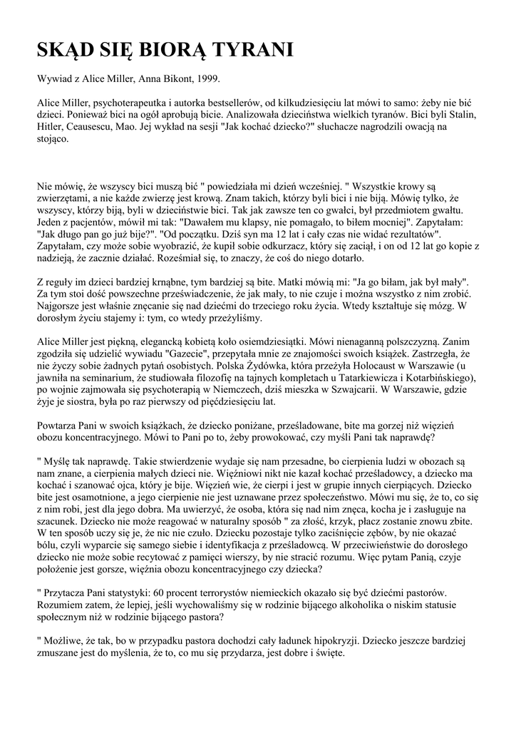SK D SI BIOR TYRANI Wywiad z Alice Miller, Anna Bikont, 1999. Alice Miller, psychoterapeutka i autorka bestsellerów, od kilkudziesi ciu lat mówi to samo: eby nie bi dzieci. Poniewa bici na ogóø aprobuj bicie. Analizowaøa dzieci stwa wielkich tyranów. Bici byli Stalin, Hitler, Ceausescu, Mao. Jej wykøad na sesji "Jak kocha dziecko?" søuchacze nagrodzili owacj na stoj co. Nie mówi , e wszyscy bici musz bi " powiedziaøa mi dzie wcze niej. " Wszystkie krowy s zwierz tami, a nie ka de zwierz jest krow . Znam takich, którzy byli bici i nie bij . Mówi tylko, e wszyscy, którzy bij , byli w dzieci stwie bici. Tak jak zawsze ten co gwaøci, byø przedmiotem gwaøtu. Jeden z pacjentów, mówiø mi tak: "Dawaøem mu klapsy, nie pomagaøo, to biøem mocniej". Zapytaøam: "Jak døugo pan go ju bije?". "Od pocz tku. Dzi syn ma 12 lat i caøy czas nie wida rezultatów". Zapytaøam, czy mo e sobie wyobrazi , e kupiø sobie odkurzacz, który si zaci ø, i on od 12 lat go kopie z nadziej , e zacznie dziaøa . Roze miaø si , to znaczy, e co do niego dotarøo. Z reguøy im dzieci bardziej krn bne, tym bardziej s bite. Matki mówi mi: "Ja go biøam, jak byø maøy". Za tym stoi do powszechne prze wiadczenie, e jak maøy, to nie czuje i mo na wszystko z nim zrobi . Najgorsze jest wøa nie zn canie si nad dzie mi do trzeciego roku ycia. Wtedy ksztaøtuje si mózg. W dorosøym yciu stajemy i: tym, co wtedy prze yli my. Alice Miller jest pi kn , eleganck kobiet koøo osiemdziesi tki. Mówi nienagann polszczyzn . Zanim zgodziøa si udzieli wywiadu "Gazecie", przepytaøa mnie ze znajomo ci swoich ksi ek. Zastrzegøa, e nie yczy sobie adnych pyta osobistych. Polska ydówka, która prze yøa Holocaust w Warszawie (u jawniøa na seminarium, e studiowaøa filozofi na tajnych kompletach u Tatarkiewicza i Kotarbi skiego), po wojnie zajmowaøa si psychoterapi w Niemczech, dzi mieszka w Szwajcarii. W Warszawie, gdzie yje je siostra, byøa po raz pierwszy od pi dziesi ciu lat. Powtarza Pani w swoich ksi kach, e dziecko poni ane, prze ladowane, bite ma gorzej ni wi zie obozu koncentracyjnego. Mówi to Pani po to, eby prowokowa , czy my li Pani tak naprawd ? " My l tak naprawd . Takie stwierdzenie wydaje si nam przesadne, bo cierpienia ludzi w obozach s nam znane, a cierpienia maøych dzieci nie. Wi niowi nikt nie kazaø kocha prze ladowcy, a dziecko ma kocha i szanowa ojca, który je bije. Wi zie wie, e cierpi i jest w grupie innych cierpi cych. Dziecko bite jest osamotnione, a jego cierpienie nie jest uznawane przez spoøecze stwo. Mówi mu si , e to, co si z nim robi, jest dla jego dobra. Ma uwierzy , e osoba, która si nad nim zn ca, kocha je i zasøuguje na szacunek. Dziecko nie mo e reagowa w naturalny sposób " za zøo , krzyk, pøacz zostanie znowu zbite. W ten sposób uczy si je, e nic nie czuøo. Dziecku pozostaje tylko zaci ni cie z bów, by nie okaza bólu, czyli wyparcie si samego siebie i identyfikacja z prze ladowc . W przeciwie stwie do dorosøego dziecko nie mo e sobie recytowa z pami ci wierszy, by nie straci rozumu. Wi c pytam Pani , czyje poøo enie jest gorsze, wi nia obozu koncentracyjnego czy dziecka? " Przytacza Pani statystyki: 60 procent terrorystów niemieckich okazaøo si by dzie mi pastorów. Rozumiem zatem, e lepiej, je li wychowali my si w rodzinie bij cego alkoholika o niskim statusie spoøecznym ni w rodzinie bij cego pastora? " Mo liwe, e tak, bo w przypadku pastora dochodzi caøy øadunek hipokryzji. Dziecko jeszcze bardziej zmuszane jest do my lenia, e to, co mu si przydarza, jest dobre i wi te. To to maøy Adolfek, syn pa stwa Hitlerów W ksi ce "Zniewolone dzieci stwo. Ukryte ródøa tyranii", która w tych dniach wyszøa w Polsce, Alice Miller opisuje, jak postanowiøa zaj si biografi Hitlera: "Empatia, to znaczy wczucie si w prze ycia dziecka, oceniane i rozumienie jego losu, odrzucenie perspektywy dorosøych, jest moim narz dziem podejrzenia, czy potrafi si zdoby na empati wobec dziecka, które wyrosøo na najwi kszego ze znanych mi zbrodniarzy". Cytuj Alice Miller wiersz Wisøawy Szymborskiej "Pierwsza fotografia Hitlera": "A któ to jest ten dzidziu w kaftaniku?/ To to maøy Adolfek, syn pa stwa Hitlerów!/ Mo e wyro nie na doktora praw?/ Albo b dzie tenorem w Operze Wiede skiej?(...)/ Dok d te mieszne nó ki zaw druj , dok d?" " Pani zdaniem ju wtedy, kiedy Adolfek byø bobasem, byøo przes dzone, dok d te nó ki zaw druj ? Nie mówi oczywi cie o skali poczyna , ale o kierunku rozwoju. " Tak, jego droga byøa ju wtedy przes dzona. Ojciec go niemiøosiernie biø, codziennie, od urodzenia. Ojciec, póø- yd... " Domniemany póø- yd. " Tak, ale to nie miaøo znaczenia. Przeciwnie, te niedopowiedzenia, podejrzenia tylko zag szczaøy atmosfer . Babka Adolfka ze strony ojca byøa przez 14 lat utrzymywana przez swojego byøego pracodawc . yda z Grazu, w czasie pobytu u niego zaszøa w ci . Jej syn Alois zostaø dobrym urz dnikiem celny, ale domniemanie, e mo e by ydem, w jego oczach niweczyøo caø pozycj , na któr tak ci ko zapracowaø. St d przecie wzi øo si maniakalne przekonanie Hitlera, e trzeba oczy ci Niemcy z ydowskiej krwi, tropi c j do trzeciego pokolenia wstecz. ydzi reprezentowali upokarzan , dr czon biciem cz jego ja, te, któr chciaø wszelkimi sposobami usun z tego wiata. Hitler wychowywaø si z ciotk Johann , siostr matki, garbat i cierpi c na schizofreni . jej zachowanie musiaøo w nim wzbudza paniczny l k. St d wyrok eutanazji, który jako führer wydaø na ludzi chorych umysøowo. Gdy miaø jedena cie lat jego ojciec zakatowaø go niemal na mier . Dziecko kocha rodziców, bo ta miøo jest mu niezb dna do ycia. Wypiera gniew, który zamienia si w nienawi do søabych. Niemcy staøy si dla Hitlera symbolem niewinnego dziecka, które chciaø obroni . Przed ojcem, przed ciotk . " A kochaj ca matka " o jakiej pisz biografowie Hitlera " nic tu nie mo e pomóc? " Cho go kochaøa, nie stanowiøa dla niego adnej podpory, poniewa nie reagowaøa, kiedy ojciec go bi