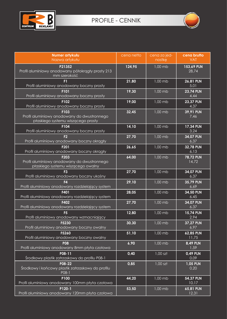 PROFILE - CENNIK Numer artykułu Nazwa artykułu cena netto cena za jednostkę cena brutto VAT P21352 Profil aluminiowy anodowany półokrągły prosty 213 mm szerokość 124,95 1,00 mb 153,69 PLN 28,74 F1 Profil aluminiowy anodowany boczny prosty 21,80 1,00 mb 26,81 PLN 5,01 F101 Profil aluminiowy anodowany boczny prosty 19,30 1,00 mb 23,74 PLN 4,44 F102 Profil aluminiowy anodowany boczny prosty 19,00 1,00 mb 23,37 PLN 4,37 F103 Profil aluminiowy anodowany do dwustronnego płaskiego systemu wiszącego prosty 32,45 1,00 mb 39,91 PLN 7,46 F104 Profil aluminiowy anodowany boczny prosty 14,10 1,00 mb 17,34 PLN 3,24 F2 Profil aluminiowy anodowany boczny okrągły 27,70 1,00 mb 34,07 PLN 6,37 F201 Profil aluminiowy anodowany boczny okrągły 26,65 1,00 mb 32,78 PLN 6,13 F203 Profil aluminiowy anodowany do dwustronnego płaskiego systemu wiszącego owalny 64,00 1,00 mb 78,72 PLN 14,72 F3 Profil aluminiowy anodowany boczny ukośny 27,70 1,00 mb 34,07 PLN 6,37 F4 Profil aluminiowy anodowany rozdzielający system 29,10 1,00 mb 35,79 PLN 6,69 F401 Profil aluminiowy anodowany rozdzielający system 28,05 1,00 mb 34,50 PLN 6,45 F402 Profil aluminiowy anodowany rozdzielający system 27,70 1,00 mb 34,07 PLN 6,37 F5 Profil aluminiowy anodowany wzmacniający 12,80 1,00 mb 15,74 PLN 2,94 F5230 Profil aluminiowy anodowany boczny owalny 30,30 1,00 mb 37,27 PLN 6,97 F5260 Profil aluminiowy anodowany boczny owalny 51,10 1,00 mb 62,85 PLN 11,75 P08 Profil aluminiowy anodowany 8mm płyta czołowa 6,90 1,00 mb 8,49 PLN 1,59 P08-11 Środkowy plastik zatrzaskowy do profilu P08-1 0,40 1,00 szt 0,49 PLN 0,09 P08-22 Środkowy i końcowy plastik zatrzaskowy do profilu P08-1 0,85 1,00 szt 1,05 PLN 0,20 P100 Profil aluminiowy anodowany 100mm płyta czołowa 44,20 1,00 mb 54,37 PLN 10,17 P120-1 Profil aluminiowy anodowany 120mm płyta czołowa 53,50 1,00 mb 65,81 PLN 12,31 PROFILE - CENNIK Numer artykułu Nazwa artykułu cena netto cena za jednostkę cena brutto VAT P12012 Profil aluminiowy anodowany 120mm płyta czołowa do wymiennej informacji wsuwane 44,30 1,00 mb 54,49 PLN 10,19 P12252 Profil aluminiowy anodowany półokrągły prosty 122 mm szerokość 70,40 1,00 mb 86,59 PLN 16,19 P122-52 Zaślepka do profilu P12252 szra 6,90 1,00 szt 8,49 PLN 1,59 P122-52B Plastikowa, czarna zaślepka do profilu P12252 7,30 1,00 szt 8,98 PLN 1,68 P15 Profil aluminiowy anodowany 15mm płyta czołowa 9,20 1,00 mb 11,32 PLN 2,12 P150-1 Profil aluminiowy anodowany 150mm płyta czołowa 72,40 1,00mb 89,05 PLN 16,65 P15-11 Środkowy plastik zatrzaskowy do profilu P15-1 0,60 1,00 szt 0,74 PLN 0,14 P15-22 Środkowy i końcowy plastik zatrzaskowy do profilu P15-1 0,85 1,00 szt 1,05 PLN 0,20 P15252 Profil aluminiowy anodowany półokrągły prosty 152 mm szerokość 86,38 1,00 mb 106,25 PLN 19,87 P152-52 Zaślepka do profilu P15252 szara 8,40 1,00 szt 10,33 PLN 1,93 P15-252B Plastikowa czarna zaślepka do profilu P15252 9,10 1,00 szt 11,19 PLN 2,09 P180-1 Profil aluminiowy anodowany 180mm płyta czołowa 94,95 1,00 mb 116,79 PLN 21,84 P210-1 Profil aluminiowy anodowany 210mm płyta czołowa 140,70 1,00 mb 173,06 PLN 32,36 P213-52 Zaślepka do profilu P21352 szara 9,80 1,00 szt 12,05 PLN 2,25 P213-52B Plastikowa, czarna zaślepka do profilu P21352 10,40 1,00 szt 12,79 PLN 2,39 P240-1 Profil aluminiowy anodowany 240mm płyta czołowa 199,95 1,00 mb 245,94 PLN 45,99 P25 Profil aluminiowy anodowany 25mm płyta czołowa 12,20 1,00 mb 15,01 PLN 2,81 P25-11 Środkowy plastik zatrzaskowy do profilu P25, P50, P75, P100 0,60 1,00 szt 0,74 PLN 0,14 P25-22 Środkowy i końcowy plastik zatrzaskowy do profilu P25, P50, P75, P100 0,85 1,00 szt 1,05 PLN 0,20 P270-1 Profil aluminiowy anodowany 270mm płyta czołowa 238,50 1,00 mb 293,36 PLN 54,86 P30-1 Profil aluminiowy anodowany 30mm płyta czołowa 13,80 1,00 mb 16,97 PLN 3,17 P30-11 Środkowy plastik zatrzaskowy do profilu P30-1, P60-1, P90-1 .. do P270-1 wielok 0,60 1,00 szt 0,74 PLN 0,14 PROFILE - CENNIK Numer artykułu Nazwa artykułu cena netto cena za jednostkę cena brutto VAT P3012 Profil aluminiowy anodowany 30mm płyta czołowa do wymiennej informacji wsuwanej 16,45 1,00 mb 20,23 PL N 3,78 P30-22 Środkowy i końcowy plastik zatrzaskowy do profilu P30-1, P60-1, P90-1 .. do P27 0,85 1,00 szt 1,05 PLN 0,20 P30-31 Środkowy plastik zatrzaskowy do profilu P3012, P601, P602, P9013 0,65 1,00 szt 0,80 PLN 0,15 P4153 Profil aluminiowy anodowany do wypukłego systemu wsuwanego ze skośnym brzegiem 219,10 1,00 mb 269,49 PLN 50,39 P41-53 Aluminiowa zaślepka do profilu P4153, 2 szt w komplecie 28,51 1,00 kpl 35,07 PLN 6,56 P45 Profil aluminiowy anodowany 45mm płyta czołowa 19,85 1,00 mb 24,42 PLN 4,57 P45-11 Środkowy plastik zatrzaskowy do profilu P45 1,25 1,00 szt 1,54 PLN 0,29 P4512 Profil aluminiowy anodowany 45mm płyta czołowa do wymiennej informacji wsuwanej 23,20 1,00mb 28,54 PLN 5,34 P45-22 Środkowy i końcowy plastik zatrzaskowy do profilu P45 1,30 1,00 szt 1,60 PLN 0,30 P50 Profil aluminiowy anodowany 50mm płyta czołowa 19,95 1,00 mb 24,54 PLN 4,59 P5153 Profil anodowany srebrny półokrągły A5 124,35 1,00 mb 152,95 PLN 28,60 P51-53 Aluminiowa zaślepka do profilu P5153, 2 szt w komplecie 22,97 1,00 kpl 28,25 PLN 5,28 P60-1 Profil aluminiowy anodowany 60mm płyta czołowa 25,00 1,00 mb 30,75 PLN 5,75 P6012 Profil aluminiowy anodowany 60mm płyta czołowa do wymiennej informacji wsuwanej 26,65 1,00 mb 32,78 PLN 6,13 P6042 Profil aluminiowy anodowany półokrągły 60 mm szrokość 28,70 1,00 mb 35,30 PLN 6,60 P60-42 Zaślepka do profilu P6042 szara 1,60 1,00 szt 1,97 PLN 0,37 P60-42B Plastikowa czarna zaślepka do profilu P6042 1,58 1,00 szt 1,94 PLN 0,36 P6153 Profil aluminiowy anodowany matowy wypukły A6 82,75 1,00 mb 101,78 PLN 19,03 P61-53 Aluminiowa zaślepka do profilu P61-53, 2 szt w komplecie 12,58 1,00 kpl 15,47 PLN 2,89 P6252 Profil aluminiowy anodowany półokrągły prosty 62 mm szrokość 33,70 1,00 mb 41,45 PLN 7,75 P62-52 Zaślepka do profilu P6252 szara 3,00 1,00 szt 3,69