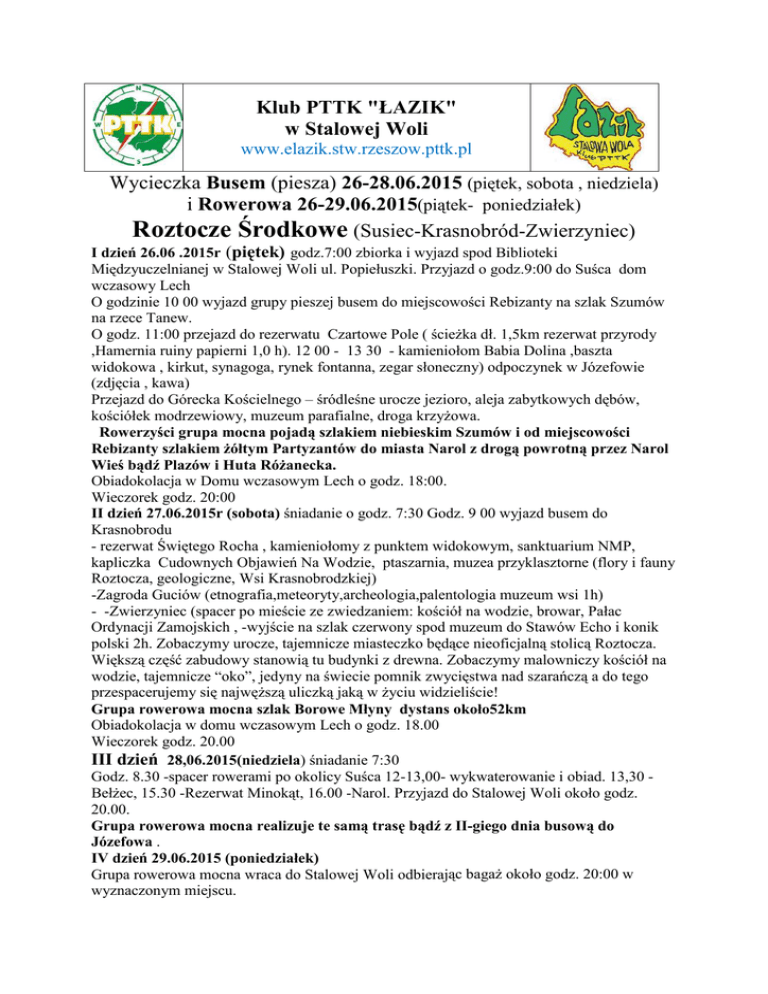 Klub PTTK "ŁAZIK" w Stalowej Woli www.elazik.stw.rzeszow.pttk.pl Wycieczka Busem (piesza) 26-28.06.2015 (piętek, sobota , niedziela) i Rowerowa 26-29.06.2015(piątek- poniedziałek) Roztocze Środkowe (Susiec-Krasnobród-Zwierzyniec) I dzień 26.06 .2015r (piętek) godz.7:00 zbiorka i wyjazd spod Biblioteki Międzyuczelnianej w Stalowej Woli ul. Popiełuszki. Przyjazd o godz.9:00 do Suśca dom wczasowy Lech O godzinie 10 00 wyjazd grupy pieszej busem do miejscowości Rebizanty na szlak Szumów na rzece Tanew. O godz. 11:00 przejazd do rezerwatu Czartowe Pole ( ścieżka dł. 1,5km rezerwat przyrody ,Hamernia ruiny papierni 1,0 h). 12 00 - 13 30 - kamieniołom Babia Dolina ,baszta widokowa , kirkut, synagoga, rynek fontanna, zegar słoneczny) odpoczynek w Józefowie (zdjęcia , kawa) Przejazd do Górecka Kościelnego – śródleśne urocze jezioro, aleja zabytkowych dębów, kościółek modrzewiowy, muzeum parafialne, droga krzyżowa. Rowerzyści grupa mocna pojadą szlakiem niebieskim Szumów i od miejscowości Rebizanty szlakiem żółtym Partyzantów do miasta Narol z drogą powrotną przez Narol Wieś bądź Plazów i Huta Różanecka. Obiadokolacja w Domu wczasowym Lech o godz. 18:00. Wieczorek godz. 20:00 II dzień 27.06.2015r (sobota) śniadanie o godz. 7:30 Godz. 9 00 wyjazd busem do Krasnobrodu - rezerwat Świętego Rocha , kamieniołomy z punktem widokowym, sanktuarium NMP, kapliczka Cudownych Objawień Na Wodzie, ptaszarnia, muzea przyklasztorne (flory i fauny Roztocza, geologiczne, Wsi Krasnobrodzkiej) -Zagroda Guciów (etnografia,meteoryty,archeologia,palentologia muzeum wsi 1h) - -Zwierzyniec (spacer po mieście ze zwiedzaniem: kościół na wodzie, browar, Pałac Ordynacji Zamojskich , -wyjście na szlak czerwony spod muzeum do Stawów Echo i konik polski 2h. Zobaczymy urocze, tajemnicze miasteczko będące nieoficjalną stolicą Roztocza. Większą część zabudowy stanowią tu budynki z drewna. Zobaczymy malowniczy kościół na wodzie, tajemnicze “oko”, jedyny na świecie pomnik zwycięstwa nad szarańczą a do tego przespacerujemy się najwęższą uliczką jaką w życiu widzieliście! Grupa rowerowa mocna szlak Borowe Młyny dystans około52km Obiadokolacja w domu wczasowym Lech o godz. 18.00 Wieczorek godz. 20.00 III dzień 28,06.2015(niedziela) śniadanie 7:30 Godz. 8.30 -spacer rowerami po okolicy Suśca 12-13,00- wykwaterowanie i obiad. 13,30 Bełżec, 15.30 -Rezerwat Minokąt, 16.00 -Narol. Przyjazd do Stalowej Woli około godz. 20.00. Grupa rowerowa mocna realizuje te samą trasę bądź z II-giego dnia busową do Józefowa . IV dzień 29.06.2015 (poniedziałek) Grupa rowerowa mocna wraca do Stalowej Woli odbierając bagaż około godz. 20:00 w wyznaczonym miejscu. Wycieczka odbędzie się niezależnie od warunków pogodowych przy zmianie planu zwiedzania. Koszt wycieczki dla członków klubu PTTK „Łazik” 230- zł. Dla członków PTTK – 235zł. Dla pozostałych 245 zł. Zadatek na wycieczkę w wys. 100 zł. płatny do 03.czerwiec 2015 roku. Pozostałą kwotę do zapłaty 20 dni przed wyjazdem. Koszt grupy rowerowej 205 zł W ramach wpisowego zapewniamy: - Bus, pilotaż i przewodnictwo, - 2 noclegi i 3 obiadokolacje/ .. - opłaty i bilety w zwiedzanych obiektach, - dla grupy rowerowej 3-noclegi i 3 obiadokolacje oraz transport bagaży - ubezpieczenie NNW dla członków PTTK, osoby nie będące członkami - ubezpieczają się we własnym zakresie. Organizatorami wycieczki z ramienia klubu PTTK „Łazik” są : Henryk Chojnacki tel. 692 661 875 ; Leszek Danaj-668 851 166 Proszę o wpłaty na zebraniu 10 czerwca