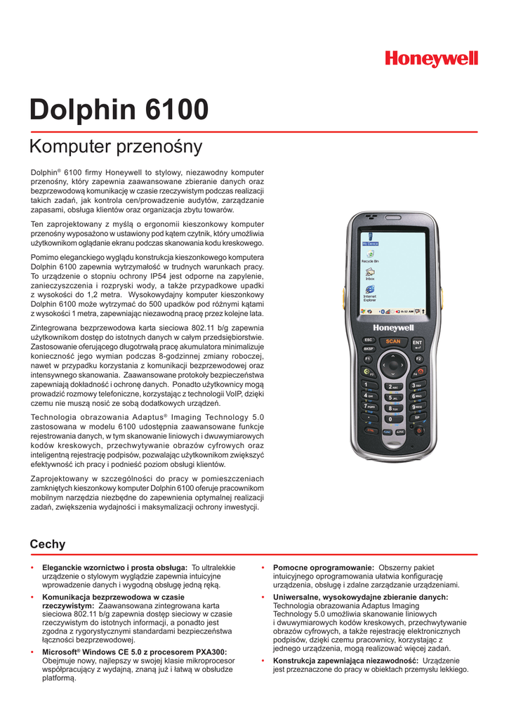 Dolphin 6100 Komputer przenośny Dolphin® 6100 firmy Honeywell to stylowy, niezawodny komputer przenośny, który zapewnia zaawansowane zbieranie danych oraz bezprzewodową komunikację w czasie rzeczywistym podczas realizacji takich zadań, jak kontrola cen/prowadzenie audytów, zarządzanie zapasami, obsługa klientów oraz organizacja zbytu towarów. Ten zaprojektowany z myślą o ergonomii kieszonkowy komputer przenośny wyposażono w ustawiony pod kątem czytnik, który umożliwia użytkownikom oglądanie ekranu podczas skanowania kodu kreskowego. Pomimo eleganckiego wyglądu konstrukcja kieszonkowego komputera Dolphin 6100 zapewnia wytrzymałość w trudnych warunkach pracy. To urządzenie o stopniu ochrony IP54 jest odporne na zapylenie, zanieczyszczenia i rozpryski wody, a także przypadkowe upadki z wysokości do 1,2 metra. Wysokowydajny komputer kieszonkowy Dolphin 6100 może wytrzymać do 500 upadków pod różnymi kątami z wysokości 1 metra, zapewniając niezawodną pracę przez kolejne lata. Zintegrowana bezprzewodowa karta sieciowa 802.11 b/g zapewnia użytkownikom dostęp do istotnych danych w całym przedsiębiorstwie. Zastosowanie oferującego długotrwałą pracę akumulatora minimalizuje konieczność jego wymian podczas 8-godzinnej zmiany roboczej, nawet w przypadku korzystania z komunikacji bezprzewodowej oraz intensywnego skanowania. Zaawansowane protokoły bezpieczeństwa zapewniają dokładność i ochronę danych. Ponadto użytkownicy mogą prowadzić rozmowy telefoniczne, korzystając z technologii VoIP, dzięki czemu nie muszą nosić ze sobą dodatkowych urządzeń. Technologia obrazowania Adaptus ® Imaging Technology 5.0 zastosowana w modelu 6100 udostępnia zaawansowane funkcje rejestrowania danych, w tym skanowanie liniowych i dwuwymiarowych kodów kreskowych, przechwytywanie obrazów cyfrowych oraz inteligentną rejestrację podpisów, pozwalając użytkownikom zwiększyć efektywność ich pracy i podnieść poziom obsługi klientów. Zaprojektowany w szczególności do pracy w pomieszczeniach zamkniętych kieszonkowy komputer Dolphin 6100 oferuje pracownikom mobilnym narzędzia niezbędne do zapewnienia optymalnej realizacji zadań, zwiększenia wydajności i maksymalizacji ochrony inwestycji. Cechy • Eleganckie wzornictwo i prosta obsługa: To ultralekkie urządzenie o stylowym wyglądzie zapewnia intuicyjne wprowadzenie danych i wygodną obsługę jedną ręką. • Pomocne oprogramowanie: Obszerny pakiet intuicyjnego oprogramowania ułatwia konfigurację urządzenia, obsługę i zdalne zarządzanie urządzeniami. • Komunikacja bezprzewodowa w czasie rzeczywistym: Zaawansowana zintegrowana karta sieciowa 802.11 b/g zapewnia dostęp sieciowy w czasie rzeczywistym do istotnych informacji, a ponadto jest zgodna z rygorystycznymi standardami bezpieczeństwa łączności bezprzewodowej. • Uniwersalne, wysokowydajne zbieranie danych: Technologia obrazowania Adaptus Imaging Technology 5.0 umożliwia skanowanie liniowych i dwuwymiarowych kodów kreskowych, przechwytywanie obrazów cyfrowych, a także rejestrację elektronicznych podpisów, dzięki czemu pracownicy, korzystając z jednego urządzenia, mogą realizować więcej zadań. • Microsoft® Windows CE 5.0 z procesorem PXA300: Obejmuje nowy, najlepszy w swojej klasie mikroprocesor współpracujący z wydajną, znaną już i łatwą w obsłudze platformą. • Konstrukcja zapewniająca niezawodność: Urządzenie jest przeznaczone do pracy w obiektach przemysłu lekkiego. Dolphin 6100 — dane techniczne Parametry operacyjne Procesor Marvell XScale PXA300 624 MHz System operacyjny Microsoft® Windows CE 5.0 Pamięć 128 MB pamięci RAM x 128 MB pamięci flash Wyświetlacz Kolorowy wyświetlacz LCD wyposażony w 2,8-calową matrycę aktywną typu transmissive wyświetlającą 65 tys. kolorów, z podświetleniem, QVGA (240 x 320 pikseli) Klawiatura Numeryczna 28-klawiszowa z wywoływanymi (klawiszem Shift) klawiszami alfanumerycznymi oraz podświetleniem WLAN Dwupasmowa karta sieciowa 802.11 b/g (11 Mb/s lub 54 Mb/s) wyposażona w antenę wewnętrzną Zabezpieczenia sieci WLAN WEP, 802.1x, LEAP, TKIP, MD5, EAP-TLS, EAP-TTLS, WPA-PSK, WPA v2.0, PEAP, CCx4 (w toku) WPAN Bluetooth®, Klasa II (10 m), v2.0 z funkcją Enhanced Data Rate (EDR) oraz anteną. Zgodność z wymaganiami BQB Gniazdo rozszerzenia Dostępne dla użytkownika gniazdo kart microSD obsługujące karty o pojemności do 4 GB oraz urządzenia w standardzie SDIO Komunikacja głosowa Obsługa VoIP (Voice-over-IP) i komunikacji Push-to-Talk Dźwięk Wbudowany mikrofon i głośnik, gniazdo słuchawkowe stereo (jack) Interfejs komunikacyjny Port USB 1.1 o pełnej szybkości ze stacji bazowej (lub przewód we/wy); RS232 (115 Kb/s) ze stacji bazowej Oprogramowanie użytkowe Honeywell Powertools® i programy demonstracyjne Środowisko programistyczne Honeywell SDK for Windows® CE 5.0 Oprogramowanie firm zewnętrznych SOTI MobiControl (zdalne zarządzanie urządzeniami), Naurtech CETerm™ Terminal Emulation (TNVT, 3270, 5250) oraz ITScriptNet™ Parametry mechaniczne/elektryczne Wymiary 175 mm x 66 mm x 26,8 mm Masa 250 g ze standardowym zestawem baterii Akumulator Akumulator Standardowy: litowo-jonowy 3,7 V, 2200 mAh; o wydłużonym czasie działania: litowo-jonowy 3,7 V, 3300 mAh (wyposażony w wejście akumulatora o wydłużonym czasie działania) Oczekiwana liczba godzin pracy Ponad 8 godzin (podczas skanowania i ciągłego przesyłania danych)* Oczekiwany czas ładowania Poniżej 4 godzin Dane środowiskowe Temperatura pracy Od -10°C do 50°C Temperatura magazynowania Od -20°C do 70°C Wilgotność 95% wilgotności, bez kondensacji Upadek Urządzenie wytrzymuje wielokrotne upadki z wysokości 1,2 m na powierzchnię betonową, we wszystkich osiach oraz w pełnym zakresie temperatur roboczych Upadek (pod różnymi kątami) 500 upadków pod różnymi kątami z wysokości 1 m (1000 upuszczeń) Stopień ochrony IP54 Wyładowanie elektros