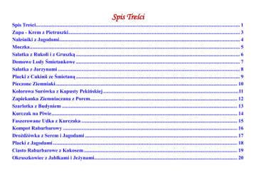 Spis Treści Spis Treści .............................................................................................................................................................. 1 Zupa - Krem z Pietruszki..................................................................................................................................... 3 Naleśniki z Jagodami ............................................................................................................................................ 4 Moczka................................................................................................................................................................... 5 Sałatka z Rukoli i z Gruszką ............................................................................................................................... 6 Domowe Lody Śmietankowe ............................................................................................................................... 7 Sałatka z Jarzynami ............................................................................................................................................. 8 Placki z Cukinii ze Śmietaną ............................................................................................................................... 9 Pieczone Ziemniaki ............................................................................................................................................. 10 Kolorowa Surówka z Kapusty Pekińskiej .........................................................................................................11 Zapiekanka Ziemniaczana z Porem.................................................................................................................. 12 Szarlotka z Budyniem ........................................................................................................................................ 13 Kurczak na Piwie ................................................................................................................................................ 14 Faszerowane Udka z Kurczaka ......................................................................................................................... 15 Kompot Rabarbarowy ....................................................................................................................................... 16 Drożdżówka z Serem i Jagodami ...................................................................................................................... 17 Placki z Jagodami ............................................................................................................................................... 18 Ciasto Rabarbarowe z Kokosem ....................................................................................................................... 19 Okruszkowiec z Jabłkami i Jeżynami............................................................................................................... 20 Makaron z Cukinią i Bakłażanem .................................................................................................................... 21 Szczawiowa z Botwinką ..................................................................................................................................... 22 Kurczak z Sosem z Rzodkiewki......................................................................................................................... 23 Tarta Cytrynowa................................................................................................................................................. 24 Sałatka z Ogórka i Brzoskwini .......................................................................................................................... 25 Mapoleonka z Poziomkami ................................................................................................................................ 26 Rogaliki Drożdżowe............................................................................................................................................ 27 Sezamowe Sznycle z Indyka .............................................................................................................................. 28 Ryba w Sosie Brokułowym z Pomidorami ....................................................................................................... 29 Babka na Oleju ................................................................................................................................................... 30 Przekładaniec z Malinami ................................................................................................................................. 31 Zapiekanka z Warzywami i Schabem ............................................................................................................... 32 01-06-2015 Zupa - Krem z Pietruszki Składniki: 30 dag pietruszki, 3 ziemniaki, 1/2 szklanki śmietany, 7 łyżka mąki, 1 łyżka masła, sól czosnkowa, pieprz, do podania: grzanki, natka pietruszki. Korzeń pietruszki zetrzeć na tarce o dużych oczkach. Następnie uprażyć na maśle. Pietruszkę przełożyć do garnka, zalać wodą. Dodać pokrojone w kostkę ziemniaki i gotować do miękkości. Następnie zmiksować na krem i zaprawić śmietaną, wymieszaną z mąką. Doprawić do smaku solą czosnkową i pieprzem. Podawać z grzankami i natką pietruszki. Bardziej wytworna wersja to podanie z płatem wędzonego łososia. Spis treści 02-06-2015 Naleśniki z Jagodami Składniki: ciasto: 2 i 1/2 szklanki mąki, 2 szklanki mleka, 1 szklanka wody, 3 jajka, łyżeczka cukru, szczypta soli, odrobina oleju, sos jagodowy: 2 szklanki borówek amerykańskich, % szklanki cukru, 1 łyżka soku z limonki, dodatkowo: bita śmietana, jagody do dekoracji. Składniki ciasta zmiksować, odstawić na 20 min. Po tym czasie smażyć cienkie naleśniki. Borówki zmiks