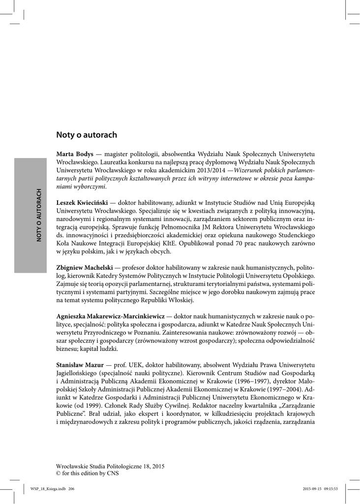 NOTY O AUTORACH Noty o autorach Marta Bodys — magister politologii, absolwentka Wydziału Nauk Społecznych Uniwersytetu Wrocławskiego. Laureatka konkursu na najlepszą pracę dyplomową Wydziału Nauk Społecznych Uniwersytetu Wrocławskiego w roku akademickim 2013/2014 —Wizerunek polskich parlamentarnych partii politycznych kształtowanych przez ich witryny internetowe w okresie poza kampaniami wyborczymi. Leszek Kwieciński — doktor habilitowany, adiunkt w Instytucie Studiów nad Unią Europejską Uniwersytetu Wrocławskiego. Specjalizuje się w kwestiach związanych z polityką innowacyjną, narodowymi i regionalnym systemami innowacji, zarządzaniem sektorem publicznym oraz integracją europejską. Sprawuje funkcję Pełnomocnika JM Rektora Uniwersytetu Wrocławskiego ds. innowacyjności i przedsiębiorczości akademickiej oraz opiekuna naukowego Studenckiego Koła Naukowe Integracji Europejskiej KItE. Opublikował ponad 70 prac naukowych zarówno w języku polskim, jak i w językach obcych. Zbigniew Machelski — profesor doktor habilitowany w zakresie nauk humanistycznych, politolog, kierownik Katedry Systemów Politycznych w Instytucie Politologii Uniwersytetu Opolskiego. Zajmuje się teorią opozycji parlamentarnej, strukturami terytorialnymi państwa, systemami politycznymi i systemami partyjnymi. Szczególne miejsce w jego dorobku naukowym zajmują prace na temat systemu politycznego Republiki Włoskiej. Agnieszka Makarewicz-Marcinkiewicz — doktor nauk humanistycznych w zakresie nauk o polityce, specjalność: polityka społeczna i gospodarcza, adiunkt w Katedrze Nauk Społecznych Uniwersytetu Przyrodniczego w Poznaniu. Zainteresowania naukowe: zrównoważony rozwój — obszar społeczny i gospodarczy (zrównoważony wzrost gospodarczy); społeczna odpowiedzialność biznesu; kapitał ludzki. Stanisław Mazur — prof. UEK, doktor habilitowany, absolwent Wydziału Prawa Uniwersytetu Jagiellońskiego (specjalność nauki polityczne). Kierownik Centrum Studiów nad Gospodarką i Administracją Publiczną Akademii Ekonomicznej w Krakowie (1996−1997), dyrektor Małopolskiej Szkoły Administracji Publicznej Akademii Ekonomicznej w Krakowie (1997−2004). Adiunkt w Katedrze Gospodarki i Administracji Publicznej Uniwersytetu Ekonomicznego w Krakowie (od 1999). Członek Rady Służby Cywilnej. Redaktor naczelny kwartalnika „Zarządzanie Publiczne”. Brał udział, jako ekspert i koordynator, w kilkudziesięciu projektach krajowych i międzynarodowych z zakresu polityk i programów publicznych, jakości rządzenia, zarządzania Wrocławskie Studia Politologiczne 18, 2015 © for this edition by CNS WSP_18_Ksiega.indb 206 2015-09-15 09:15:53 207 strategicznego, organizacyjnego uczenia się. Autor kilkudziesięciu publikacji naukowych. Autor i współautor ponad 120 ekspertyz. Małgorzata Michalewska-Pawlak — doktor, adiunkt w Katedrze Studiów Europejskich Uniwersytetu Wrocławskiego, Zakład Europejskiej Integracji Gospodarczo-Społecznej i Rozwoju Regionalnego. Prowadzi badania naukowe i zajęcia dydaktyczne, których tematyka koncentruje się wokół polityk publicznych służących rozwojowi regionalnemu, w tym głównie obszarów wiejskich. Jest autorką monografii i artykułów naukowych w obszarze Wspólnej Polityki Rolnej i Wiejskiej Unii Europejskiej oraz polityki regionalnej UE. Rafał Riedel — doktor habilitowany, absolwent Uniwersytetu Śląskiego i Akademii Ekonomicznej w Katowicach; adiunkt w Katedrze Integracji Europejskiej Instytutu Politologii Uniwersytetu Opolskiego. Uczestnik i organizator licznych projektów badawczych i edukacyjnych w Europie i USA. Autor ponad stu publikacji o tematyce społeczno-polityczno-ekonomicznej (monografie, prace zbiorowe, artykuły naukowe i publicystyczne). Kaori Yamashita — magister, doktorantka na Wydziale Nauk Społecznych Uniwersytetu Wrocławskiego (obszar specjalności: nauki o polityce, polityki publiczne, polityka społeczna). Praca magisterska, realizowana w ramach międzynarodowych studiów magisterskich Erasmus Mundus, została obroniona na Uniwersytetach w Lipsku i we Wrocławiu. Pracę licencjacką dotyczącą historii Europy broniła na California State University, San Bernardino (USA). Wcześniej 10 lat pracowała zawodowo w Japonii. NOTY O AUTORACH Olga Svystun — magister, obecnie uczestniczka programu dla młodych naukowców na Wydziale Nauk Społecznych Uniwersytetu Wrocławskiego. Zainteresowania badawcze obejmują polityczne, prawne, historyczne uwarunkowania rozwoju organizacji pozarządowych na Ukrainie (w szczególności we Lwowie) w czasach komunistycznych oraz po odzyskaniu niepodległości. Mateusz Zieliński — magister, ukończył z wyróżnieniem anglojęzyczne studia w Instytucie Politologii Uniwersytetu Wrocławskiego. Obecnie jest uczestnikiem Studiów Doktoranckich Nauk o Polityce, Filozofii i Socjologii Uniwersytetu Wrocławskiego. W swojej pracy zajmuje się zastosowaniem analizy sieciowej w politologii oraz wykorzystaniem potencjału nowoczesnych technologii informacyjno-komunikacyjnych w polityce. Andrzej Zybała — doktor habilitowany, profesor w Collegium Civitas, kierownik Instytutu Polityk Publicznych Collegium Civitas. Specjalizuje się w problematyce polityk publicznych i zarządzania publicznego. Opublikował książkę Państwo i społeczeństwo w działaniu. Polityki publiczne wobec potrzeb modernizacji państwa i społeczeństwa (Warszawa 2013). Wrocławskie Studia Politologiczne 18, 2015 © for this edition by CNS WSP_18_Ksiega.indb 207 2015-09-15 09:15:53