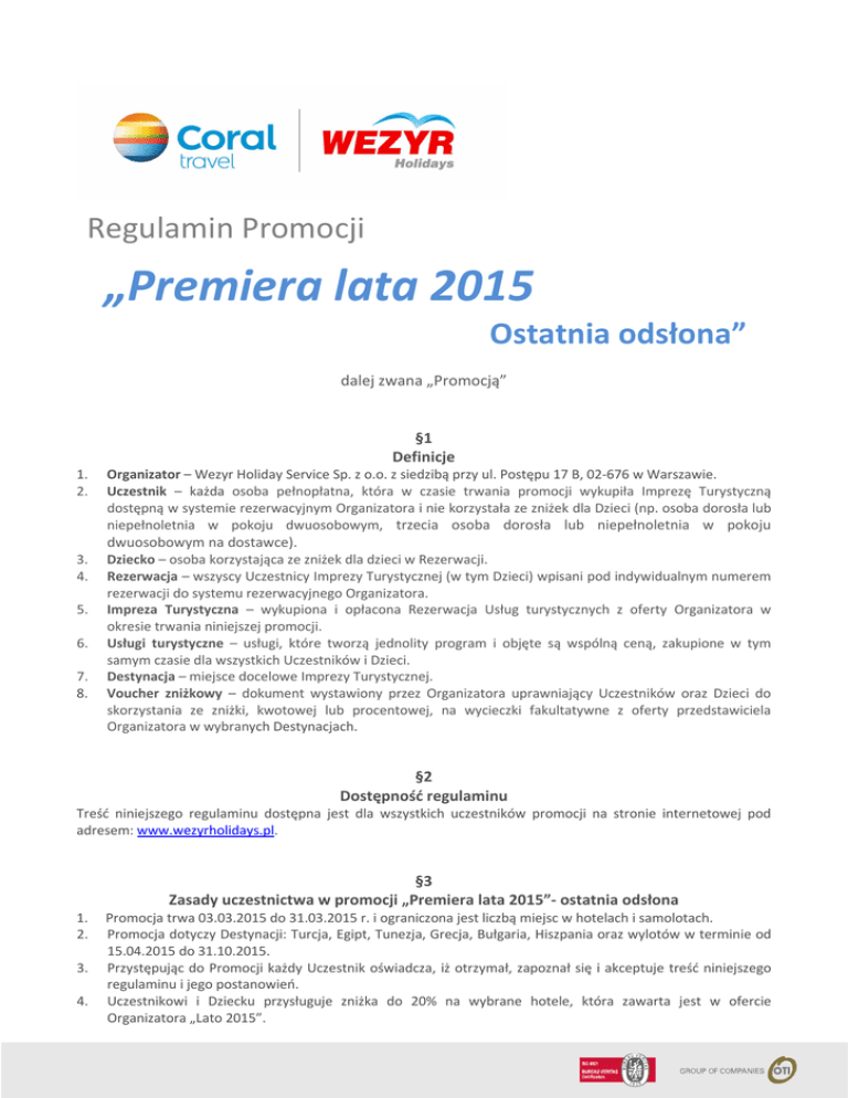Regulamin Promocji „Premiera lata 2015 Ostatnia odsłona” dalej zwana „Promocją” §1 Definicje 1. 2. 3. 4. 5. 6. 7. 8. Organizator – Wezyr Holiday Service Sp. z o.o. z siedzibą przy ul. Postępu 17 B, 02-676 w Warszawie. Uczestnik – każda osoba pełnopłatna, która w czasie trwania promocji wykupiła Imprezę Turystyczną dostępną w systemie rezerwacyjnym Organizatora i nie korzystała ze zniżek dla Dzieci (np. osoba dorosła lub niepełnoletnia w pokoju dwuosobowym, trzecia osoba dorosła lub niepełnoletnia w pokoju dwuosobowym na dostawce). Dziecko – osoba korzystająca ze zniżek dla dzieci w Rezerwacji. Rezerwacja – wszyscy Uczestnicy Imprezy Turystycznej (w tym Dzieci) wpisani pod indywidualnym numerem rezerwacji do systemu rezerwacyjnego Organizatora. Impreza Turystyczna – wykupiona i opłacona Rezerwacja Usług turystycznych z oferty Organizatora w okresie trwania niniejszej promocji. Usługi turystyczne – usługi, które tworzą jednolity program i objęte są wspólną ceną, zakupione w tym samym czasie dla wszystkich Uczestników i Dzieci. Destynacja – miejsce docelowe Imprezy Turystycznej. Voucher zniżkowy – dokument wystawiony przez Organizatora uprawniający Uczestników oraz Dzieci do skorzystania ze zniżki, kwotowej lub procentowej, na wycieczki fakultatywne z oferty przedstawiciela Organizatora w wybranych Destynacjach. §2 Dostępność regulaminu Treść niniejszego regulaminu dostępna jest dla wszystkich uczestników promocji na stronie internetowej pod adresem: www.wezyrholidays.pl. §3 Zasady uczestnictwa w promocji „Premiera lata 2015”- ostatnia odsłona 1. 2. 3. 4. Promocja trwa 03.03.2015 do 31.03.2015 r. i ograniczona jest liczbą miejsc w hotelach i samolotach. Promocja dotyczy Destynacji: Turcja, Egipt, Tunezja, Grecja, Bułgaria, Hiszpania oraz wylotów w terminie od 15.04.2015 do 31.10.2015. Przystępując do Promocji każdy Uczestnik oświadcza, iż otrzymał, zapoznał się i akceptuje treść niniejszego regulaminu i jego postanowień. Uczestnikowi i Dziecku przysługuje zniżka do 20% na wybrane hotele, która zawarta jest w ofercie Organizatora „Lato 2015”. 5. W czasie trwania Promocji, jednak nie później niż do dnia 31.03.2015, istnieje możliwość jednokrotnej zmiany Usługi turystycznej [po jednej zmianie z każdego przypadku opisanego poniżej], bez ponoszenia dodatkowej opłaty, w następującym zakresie: a. zmiana nazwiska jednego z Uczestników Imprezy Turystycznej przy założeniu, iż Rezerwacja dokonana jest na minimum dwóch Uczestników, b. zmiana daty rozpoczęcia i zakończenia Usługi turystycznej, c. zmiana trasy przelotu, d. zmiana hotelu, e. zmiana Destynacji. 6. Jeżeli zmiana Usługi turystycznej opisana w pkt. 5 ust. b, c, d, e będzie wiązała się ze zmianą ceny Imprezy Turystycznej, Organizator każdorazowo poinformuje Uczestnika o nowej cenie. Nowa cena będzie obliczona w dniu dokonania zmiany. 7. Uczestnik otrzyma Voucher zniżkowy do wykorzystania na wycieczkę fakultatywną organizowaną przez przedstawiciela Organizatora zgodnie z § 3 ust. 8. Warunkiem wykorzystania Voucheru zniżkowego jest jego okazanie w momencie zakupu wycieczki fakultatywnej u przedstawiciela Organizatora. 8. Wartość Voucherów zniżkowych w zależności od Destynacji: a) Turcja - Voucher zniżkowy o wartości 10 EUR dla każdego Uczestnika powyżej 12 roku życia. b) Egipt - Voucher zniżkowy o wartości 10 USD dla każdego Uczestnika powyżej 12 roku życia. c) Grecja (Kreta, Rodos, Kos) - Voucher zniżkowy o wartości 10 EUR dla każdego Uczestnika powyżej 12 roku życia. 9. Voucher zniżkowy może być wykorzystany na wszystkie wycieczki fakultatywne zakupione u przedstawiciela Organizatora. Voucher zniżkowy nie może być wykorzystany na zakup wycieczek fakultatywnych z transportem lotniczym lub promowym w Turcji (Rodos, Kos, Istanbul, Izrael) i Egipcie (Kair, Luxor). 10. Vouchery zniżkowe nie sumują się i nie są wymieniane na gotówkę, a niewykorzystane przepadają. 11. Przy minimum dwóch Uczestnikach w Rezerwacji, 7 (siedmio-) lub 14 (czternasto-) dniowej Imprezie Turystycznej, w wybranych Destynacjach i hotelach przysługuje specjalna cena dla Dziecka do 12 roku : a) Turcja, Egipt – od 990 zł, w wybranych datach, z wylotami z wybranych miast, b) Grecja, Hiszpania – od 890 zł, w wybranych datach, z wylotami z wybranych miast, c) Bułgaria – od 790 zł, w wybranych datach, z wylotami z wybranych miast. Liczba miejsc dla Dziecka w specjalnej cenie opisanej powyżej jest limitowana. 12. Dla każdej Imprezy Turystycznej do jednego z poniższych hoteli zostanie zorganizowany specjalny transfer bezpośrednio do wybranego hotelu uwzględniając możliwe przystanki w sąsiadujących ze sobą hotelach: a) Gloria Golf, Gloria Serenity, Xanadu Belek, Rixos Premium Belek, b) Susesi Luxury, Ela Quality, Gural Premier Belek, Maxx Royal, c) Regnum Carya, Titanic Deluxe Belek, d) Barut Lara, Delphin Imperial Lara, Mardan Palace, d) Rixos Sungate, Nirvana Lagoon, Maxx Royal Kemer, Gural Premier Tekirova. 13. Warunkiem skorzystania z bezpośredniego transferu opisanego w § 3 ust. 12 jest zakup Imprezy Turystycznej trwającej minimum 7 nocy. §4 Promocja dla grup 1. 2. Przy zakupie takiej samej Imprezy Turystycznej 7 (siedmio-) dniowej lub więcej na wyloty w terminie od 15.04.2015 do 31.10.2015 dla grupy od 8 do 15 Uczestników w tym Dzieci, każdy Uczestnik otrzyma rabat 25 zł. Dziecko poniżej 2go roku życia nie jest wliczane do grupy i nie otrzymuje rabatu. 3. 4. 5. Warunkiem skorzystania z rabatu jest dokonanie Rezerwacji w tym samym czasie na taką samą Usługę turystyczną dla wszystkich Uczestników i Dzieci. W przypadku rezygnacji Uczestników lub Dzieci z Imprezy Turystycznej w taki sposób, iż liczba Uczestników i Dzieci korzystających z rabatu dla grupy spadnie poniżej 8 rabat nie przysługuje. Różnica w cenie spowodowana zmniejszeniem ilości Uczestników opisana § 4 ust. 