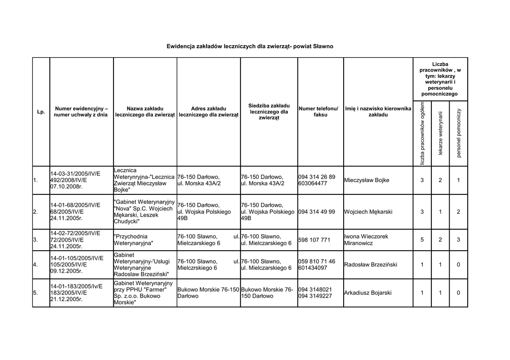 Ewidencja zakładów leczniczych dla zwierząt- powiat Sławno Nazwa zakładu Adres zakładu leczniczego dla zwierząt leczniczego dla zwierząt Siedziba zakładu leczniczego dla zwierząt Numer telefonu/ faksu Imię i nazwisko kierownika zakładu personel pomocniczy Numer ewidencyjny – numer uchwały z dnia lekarze weterynarii Lp. liczba pracowników ogółem Liczba pracowników , w tym: lekarzy weterynarii i personelu pomocniczego 094 314 26 89 603064477 Mieczysław Bojke 3 2 1 Wojciech Mękarski 3 1 2 1. 14-03-31/2005/IV/E 492/2008/IV/E 07.10.2008r. Lecznica Weterynryjna-"Lecznica 76-150 Darłowo, Zwierząt Mieczysław ul. Morska 43A/2 Bojke" 76-150 Darłowo, ul. Morska 43A/2 2. 14-01-68/2005/IV/E 68/2005/IV/E 24.11.2005r. "Gabinet Weterynaryjny 76-150 Darłowo, "Nova" Sp.C. Wojciech ul. Wojska Polskiego Mękarski, Leszek 49B Chudycki" 76-150 Darłowo, ul. Wojska Polskiego 094 314 49 99 49B 3. 14-02-72/2005/IV/E 72/2005/IV/E 24.11.2005r. "Przychodnia Weterynaryjna" 76-100 Sławno, Mielczarskiego 6 ul. 76-100 Sławno, ul. Mielczarskiego 6 598 107 771 Iwona Wieczorek Miranowicz 5 2 3 4. 14-01-105/2005/IV/E 105/2005/IV/E 09.12.2005r. Gabinet Weterynaryjny-'Usługi Weterynaryjne Radoslaw Brzeziński" 76-100 Sławno, Mielczrskiego 6 ul. 76-100 Sławno, ul. Mielczarskiego 6 059 810 71 46 601434097 Radosław Brzeziński 1 1 0 5. 14-01-183/2005/Iv/E 183/2005/IV/E 21.12.2005r. Gabinet Weterynaryjny przy PPHU "Farmer" Bukowo Morskie 76-150 Bukowo Morskie 76- 094 3148021 Sp. z.o.o. Bukowo Darłowo 150 Darłowo 094 3149227 Morskie" Arkadiusz Bojarski 1 1 0 6. 14-01-326/2006/IV/E 326/2006/IV/E 15.11.2006r. Gabinet weterynaryjny 72-100 Sławno, ul. Renata-Pilecka-Iwańska Mielczarskiego 6 72-100 Sławno, ul. Mielczarskiego 6 598 107 771 Renata Pilecka Iwańska 1 1 0