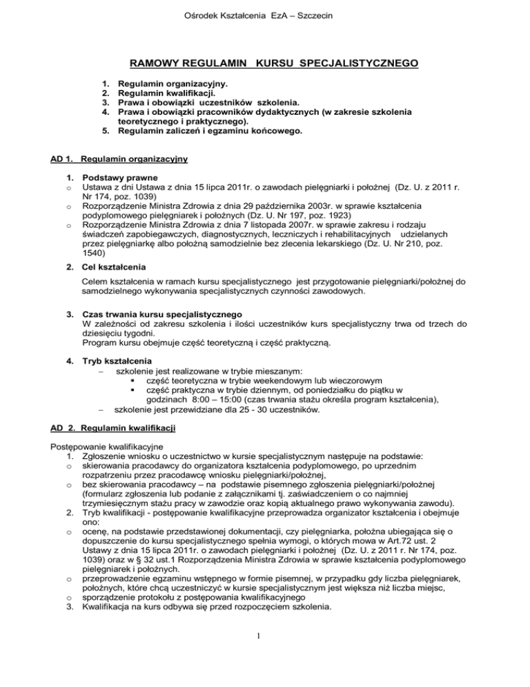 Ośrodek Kształcenia EzA – Szczecin RAMOWY REGULAMIN KURSU SPECJALISTYCZNEGO 1. 2. 3. 4. Regulamin organizacyjny. Regulamin kwalifikacji. Prawa i obowiązki uczestników szkolenia. Prawa i obowiązki pracowników dydaktycznych (w zakresie szkolenia teoretycznego i praktycznego). 5. Regulamin zaliczeń i egzaminu końcowego. AD 1. Regulamin organizacyjny 1. Podstawy prawne o Ustawa z dni Ustawa z dnia 15 lipca 2011r. o zawodach pielęgniarki i położnej (Dz. U. z 2011 r. Nr 174, poz. 1039) o Rozporządzenie Ministra Zdrowia z dnia 29 października 2003r. w sprawie kształcenia podyplomowego pielęgniarek i położnych (Dz. U. Nr 197, poz. 1923) o Rozporządzenie Ministra Zdrowia z dnia 7 listopada 2007r. w sprawie zakresu i rodzaju świadczeń zapobiegawczych, diagnostycznych, leczniczych i rehabilitacyjnych udzielanych przez pielęgniarkę albo położną samodzielnie bez zlecenia lekarskiego (Dz. U. Nr 210, poz. 1540) 2. Cel kształcenia Celem kształcenia w ramach kursu specjalistycznego jest przygotowanie pielęgniarki/położnej do samodzielnego wykonywania specjalistycznych czynności zawodowych. 3. Czas trwania kursu specjalistycznego W zależności od zakresu szkolenia i ilości uczestników kurs specjalistyczny trwa od trzech do dziesięciu tygodni. Program kursu obejmuje część teoretyczną i część praktyczną. 4. Tryb kształcenia szkolenie jest realizowane w trybie mieszanym: część teoretyczna w trybie weekendowym lub wieczorowym część praktyczna w trybie dziennym, od poniedziałku do piątku w godzinach 8:00 – 15:00 (czas trwania stażu określa program kształcenia), szkolenie jest przewidziane dla 25 - 30 uczestników. AD 2. Regulamin kwalifikacji Postępowanie kwalifikacyjne 1. Zgłoszenie wniosku o uczestnictwo w kursie specjalistycznym następuje na podstawie: o skierowania pracodawcy do organizatora kształcenia podyplomowego, po uprzednim rozpatrzeniu przez pracodawcę wniosku pielęgniarki/położnej, o bez skierowania pracodawcy – na podstawie pisemnego zgłoszenia pielęgniarki/położnej (formularz zgłoszenia lub podanie z załącznikami tj. zaświadczeniem o co najmniej trzymiesięcznym stażu pracy w zawodzie oraz kopią aktualnego prawo wykonywania zawodu). 2. Tryb kwalifikacji - postępowanie kwalifikacyjne przeprowadza organizator kształcenia i obejmuje ono: o ocenę, na podstawie przedstawionej dokumentacji, czy pielęgniarka, położna ubiegająca się o dopuszczenie do kursu specjalistycznego spełnia wymogi, o których mowa w Art.72 ust. 2 Ustawy z dnia 15 lipca 2011r. o zawodach pielęgniarki i położnej (Dz. U. z 2011 r. Nr 174, poz. 1039) oraz w § 32 ust.1 Rozporządzenia Ministra Zdrowia w sprawie kształcenia podyplomowego pielęgniarek i położnych. o przeprowadzenie egzaminu wstępnego w formie pisemnej, w przypadku gdy liczba pielęgniarek, położnych, które chcą uczestniczyć w kursie specjalistycznym jest większa niż liczba miejsc, o sporządzenie protokołu z postępowania kwalifikacyjnego 3. Kwalifikacja na kurs odbywa się przed rozpoczęciem szkolenia. 1 Ośrodek Kształcenia EzA – Szczecin 4. Uczestnik szkolenia otrzymuje pisemną informację o przyjęciu na szkolenie na adres podany w deklaracji zgłoszenia. Na życzenie uczestnika, o kwalifikacji na kurs informuje się również pracodawcę. AD 3. Prawa i obowiązki uczestników szkolenia. 1. 2. 3. 4. 5. 6. Uczestnik szkolenia ma obowiązek uiścić w całości opłatę za szkolenie przed jego rozpoczęciem i przedłożyć organizatorowi dowód wpłaty. Dopuszcza się rozłożenie opłaty na dwie raty, przy czym płatność pierwszej z nich następuje przed rozpoczęciem szkolenia, drugiej przed terminem zakończenia (egzaminu) Uczestnik szkolenia ma prawo do ubiegania się o refundację lub dofinansowanie (częściowe lub całkowite) kosztów szkolenia w : zakładzie pracy, Szczecińskiej Izbie Pielęgniarek i Położnych, Urzędach Pracy zgodnych z miejscem zamieszkania, u ewentualnych sponsorów (firmy farmaceutyczne, kosmetyczne itp.) na warunkach określonych przez wymienione instytucje. Uczestnik szkolenia ma obowiązek obecności na zajęciach realizowanych w ramach kursu. Dopuszcza się nieobecność na zajęciach w ilości nie przekraczającej 5% ogółu zajęć teoretycznych. Nie dopuszcza się takiej możliwości w przypadku zajęć praktycznych. Uczestnik ma prawo do korzystania z materiałów dydaktycznych dostarczonych przez wykładowców , biblioteki wskazanej przez organizatora oraz sprzętu , materiałów i urządzeń w placówkach szkolenia praktycznego. W przypadku nieobecności na zajęciach spowodowanej chorobą uczestnika (zaświadczenie lekarskie do wglądu organizatora) trwającej nie dłużej niż dwa dni wśród zaplanowanych na odbywanie zajęć, uczestnik ma prawo zwrócić się do organizatora o ustalenie formy zaliczenia zajęć , na których był nieobecny. W przypadku przedłużającej się choroby uczestnik ma prawo do uczestnictwa w następnej edycji kursu bez wnoszenia dodatkowej opłaty. Możliwość taka wygasa po upływie roku kalendarzowego od momentu przerwania szkolenia. AD 4 Prawa i obowiązki pracowników dydaktycznych 1. 2. 3. 4. 5. Pracownicy dydaktyczni wykonują swe obowiązki na podstawie zawartej z organizatorem umowy o dzieło, w której określa się warunki finansowe oraz zakres działań dydaktycznych. Pracownicy dydaktyczni poza prowadzeniem zajęć dydaktycznych mają obowiązek : a. WYKŁADOWCY – zapoznać uczestników szkolenia z rozkładem materiału i literaturą obowiązkową i uzupełniającą wykładanego przedmiotu oraz ze sposobem zaliczenia, b. OPIEKUNOWIE STAŻU – zapoznać uczestników szkolenia z planem i celami zajęć praktycznych oraz wykazem umiejętności przewidzianych do opanowania w ramach zajęć stażowych. Wykładowcy obowiązani są do przygotowywania środków dydaktycznych do realizacji wykładanych przedmiotów oraz do przygotowywania materiałów dydaktycznych do pracy w z