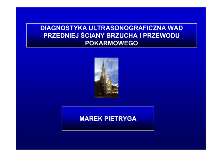 DIAGNOSTYKA ULTRASONOGRAFICZNA WAD PRZEDNIEJ ŚCIANY BRZUCHA I PRZEWODU POKARMOWEGO MAREK PIETRYGA WADY PRZEDNIEJ ŚCIANY BRZUCHA AWD – ABDOMINAL WALL DEFECT VWD – VENTRAL WALL DEFECTS PŁYN W JAMIE BRZUSZNEJ HYPERECHOGENICZNE JELITA NIEPRAWIDŁOWE MASY ECHOGENNE W JAMIE BRZUSZNEJ NIEDROŻNOŚĆ JELIT WADY PRZEDNIEJ ŚCIANY BRZUCHA AWD – ABDOMINAL WALL DEFECT VWD – VENTRAL WALL DEFECTS ETIOLOGIA I PATOGENEZA KRYTERIA ROZPOZNANIA – KIEDY ? CZYNNIKI ROKOWNICZE SPOSÓB ROZWIAZANIA - KIEDY I JAK ? MP WADY PRZEDNIEJ ŚCIANY BRZUCHA AWD – ABDOMINAL WALL DEFECT VWD – VENTRAL WALL DEFECTS BECKWITH-WIEDEMANN S. OMPHALOCELE PENTALOGIA OF CANTRELL AMNIOTIC BAND SYNDROME GASTROSCHISIS LIMB-BODY WALL COMPLEX BLADER AND CLOACAL EXTROPHY CLEFT & ABSENT STERNUM MP WADY PRZEDNIEJ ŚCIANY BRZUCHA AWD – ABDOMINAL WALL DEFECT OMPHALOCELE PRZEPUKLINA PĘPKOWA i PĘPOWINOWA GASTROSCHISIS PARAOMPHALOCELE ABDOMINOSCHISIS EMBRONAL RUPTURED OMPHALOCELE WYTRZEWIENIE MP ETIOLOGIA OMPHALOCELE PRZETRWAŁY PIERWOTNY „BODY STALK” Z USZKODZENIEM POWROTU JELIT DO JAMYBRZUSZNEJ- DO 12 T.C. DEFEKT WE WZROSCIE BOCZNYCH FAŁDÓW, KTÓRE OTACZJĄ BRZUCH - 3-5 T.C. GASTROSCHISIS PRZEDWCZESNA ATROPHIA PRAWEJ ŻYŁY PĘPOWINOWEJ MIĘDZY 28-33 DNIEM PO ZAPŁODNIENIU (42-47 dzień cyklu) – 5 - 6T.C. MP OMPHALOCELE „DUŻY WOREK” „MAŁY WOREK” 3 WĄTROBA 4 JELITO MP OMPHALOCELE WOREK PRZEPUKLINOWY: DWUNASTNICA, JELITO CZCZE, KRĘTE, OKRĘŻNICA BEZ WĄTROBY WYSTĄPIENIE ANEUPLOIDII - 50-70% MP OMPHALOCELE WOREK PRZEPUKLINOWY: Z WĄTROBĄ WYSTĄPIENIA ANEUPLOIDII - 5-20% WAD SERCA MP KRYTERIA ROZPOZNANIA – KIEDY ? FIZJOLOGICZNA PRZEPUKLINA PĘPKOWA DO 12 TYGODNIA CIĄŻY PATOLOGICZNA PRZEPUKLINA PĘPKOWA PO 12 TYGODNIU CIĄŻY ROZPOZNANIE OMPHALOCELE 12-13 TYDZIEŃ CIĄŻY MP KRYTERIA ROZPOZNANIA – KIEDY ? FIZJOLOGIA CZY PATOLOGIA PATOLOGICZNA PRZEPUKLINA PĘPKOWA PO 12 TYGODNIU CIĄŻY MP OMPHALOCELE MP OMPHALOCELE MP OMPHALOCELE MP OMPHALOCELE MP OMPHALOCELE MP OMPHALOCELE MP OMPHALOCELE MP OMPHALOCELE NIEPRAWIDŁOWOŚCI INNE WADY 50-80% ABERRACJE CHROMOSOMALNE - 40-60% - TRISOMIA 18, TRISOMIA 13, - TRISOMIA 21, Z. TURNER’A, Z.KLINEFELTELA,TRIPLOIDIA ZŁE ROKOWANIE: MAŁOWODZIE I WIELOWODZIE -P. CANTRELLA, Z. BECKWITH-WIEDEMANN -CLOACAL EXTROPHY, OEIS MP OMPHALOCELE WADY SERCA - VSD, ASD, TETRALOGIA FALLOTA, - STENOSIS I HYPOPLASIA TĘTNICY PŁUCNEJ, DORV - KOARKTACJA AORTY - TRANSPOZYCJA DUŻYCH NACZYŃ - ECTOPIA SERCA MP OMPHALOCELE INNE WADY WADY CUN + U.POK + U.MOCZ-PŁ WADY PRZEWODY POKARMOWEGO – 40% : - DIAPHRAGMATIC HERNIA - JELITA (PODWOJENIE, ATRESIA) - ASCITES - TRACHEOESOPHAGEAL FISTULA - PERFORACJA ODBYTU MP OMPHALOCELE INNE WADY - CLUBFOOT - MICROCEPHALIA - CLEFT LIB - ALLANTOIN CYST - CHORIANGIOMA - CYSTIC HYGROMA - MICROGNATHIA, SCOLIOSIS - HEMIVERTEBRA - MYELOMENINGOCELE - SYNDACTYLIA - SUA MP TRISOMIA 18 DEFORMACJA STÓP MP TRISOMIA 18 DEFORMACJA DŁONI MP ULTRASONOGRAFI A STOSUNEK MAS PRZEPUKLINOWYCH DO PRZEKROJU POPRZECZNEGO BRZUCHA < 60% - TYLKO JELITA POMIAR WRÓT PRZEPUKLINY I WIELKOŚCI WORKA ? BRAK ZNACZENIA KLINICZNEGO ? MP OMPHALOCELE - WYSTĘPOWANIE - 2.5/ 10 000 - M:K – 1:1 - WIEK - ABERRACJE CHROMOSOMALNE 40-70% -ŚMIERTELNOŚĆ – 56 – 80 -100% SEPSA I POWIKŁANIA CHIRURGICZNE 1-10% MP OMPHALOCELE OPIEKA W CIĄŻY - ROZPOZNANIE - OCENA KARIOTYPU - ECHOKARDIOGRAFIA - KTG I DOPPLER - SPOSÓB ROZWIĄZANIA ? ROKOWANIE WADY WSPÓŁISTNIEJĄCE ZAWARTOŚĆ W WORKU PRZEPUKLINOWYM: JELIT, ŻOŁĄDKA, WĄTROBY WIELKOŚĆ ? MP GASTROSCHISIS - WYSTĘPOWANIE – 1.75 - 2.5/ 10 000 - PŁEĆ MĘSKA - GŁÓWNIE JELITO CIENKIE (ŻOŁĄDEK) - DOTYCZY PRAWEJ STRONY BRZUCHA - IUGR – 40-60% -Masa płodu < 2500g. – śmiertelności o 10% NAJCZĘŚCIEJ WADA IZOLOWANA !! MP GASTROSCHISIS MECHANIZMY USZKADZAJĄCE WYTRZEWIONE JELITA : BRAK BŁONY OCHRONNEJ NA DZIAŁANIE PŁYNU OWODNIOWEGO -TWORZENIE ZŁOGÓW WŁÓKNIKA - W USG > 33 T.C. - OSMOLARNOSCI > 30 T.C. - SODU, POTASU, MOCZNIKA I KREATYNINY LECZENIE ? - ZMNIEJSZONA PERYSTALTYKA - ATRESIA Z POWODU PROCESÓW NIEDOKRWIENNYCH - PROGRESYWNA KOMPRESJA PROWADZI DO OBRZĘKU I ROZSZERZENIA JELIT MP GASTROSCHISIS 12 TYGODNI CIĄŻY MP GASTROSCHISIS 35 TYGODNI CIĄŻY MP GASTROSCHISIS 22 TYGODNIE CIĄŻY MP GASTROSCHISIS 22 TYGODNIE CIĄŻY MP GASTROSCHISIS 26 TYGODNI CIĄŻY MP GASTROSCHISIS MP GASTROSCHISIS 26 TYGODNI CIĄŻY MP GASTROSCHISIS 35 TYGODNI CIĄŻY MP GASTROSCHISIS INNE WADY1-10% (5-20%) POWIKŁANIA ZWIĄZANE Z JELITAMI: BRAK ROTACJI TRZEWI W ROZWOJU PŁODOWYM( MALROTATION) ATRESIA POWIKŁANIA - WADY NIE ZWIĄZANE Z JELITAMI ANENCEPHALY CLEFT LIP/ PALATE ASD ECTOPIA CORDIS DIAPHRAGMATIC HERNIA SCOLIOSIS SYNDACTYLIA AMNIOTIC BANDS MP GASTROSCHISIS ULTRASONOGRAFIA POSZERZENIE WYTRZEWIONYCH JELIT -10-18mm. ? BOND SJ. et al. J. PEDIATR.SURGERY 1988 - ? BABCOOK CJ. et al. J.ULTRASOUND MED. 1994 - 11mm. ALSULYMAN J.M. et al. Am.J OBSTET GYNECOL 1996 LANGER J.A. et al. ULTRASOUND OBSTET. GYNEC. 1993 – 18mm. PRYDE PG. et al. ULTRASOUND OBSTET. GYNEC. 1994 – 18mm. MP GASTROSCHISIS POSZERZENIE JELIT W JAMIE BRZUSZNEJ 19-25 TYGODNIEM CIĄŻY KORELACJA 90 - 100% NIEDROŻNOŚĆ JELIT- ATREZJA Nick A.M. et al. Ultrasound Obstet Gynec. 2006 MP GASTROSCHISIS ULTRASONOGRAFIA MP GASTROSCHISIS JELITO – POSZERZENIE > 25mm. : - WZROST RYZYKA OBJAWÓW ZAGROŻENIA ŻYCIA I OBUMARCIA PŁODU JELITO – GROBOŚĆ ŚCIANY > 2.5mm. : - WZROST RYZYKA POWIKŁAŃ JELITOWYCH - REOPERACJI Heining et a. Prenat. Diagn 2008 MP GASTROSCHISIS DIAGNOSTYKA ULTRASONOGRAFICZNA CO JEST NAJWAŻNIEJSZE W ROKOWANIU ? ROZPOZNANIE !!!!!!!!!!!!!!!! POSZERZENIE JELIT W JAMIE BRZUSZNEJ !!!!!!!!!! UWAGA ! CECHY PERFORACJI JELIT: POGRUBIENIE ŚCIAN , ZWAPNIENIA BRZUSZNE MYCONIUM CYST Nick A.M. et al. Ultrasound Obstet Gynec. 2006 MP GASTROSCHISIS ROKOWANIE DOBRE ! -PRZEŻYWALNOŚĆ 80-100% ( NIE ZALEŻNE OD WIELKOŚCI I CZASU POWSTANIA WADY) -PRZEŻYWALNOŚĆ W WADACH IZOLOWANYCH 95-10O% - POWIKŁANIA PO ZABIEGACH OPERACYJNYCH 2-10% - ŚMIERTELNOŚĆ – 5 -12% MP GA