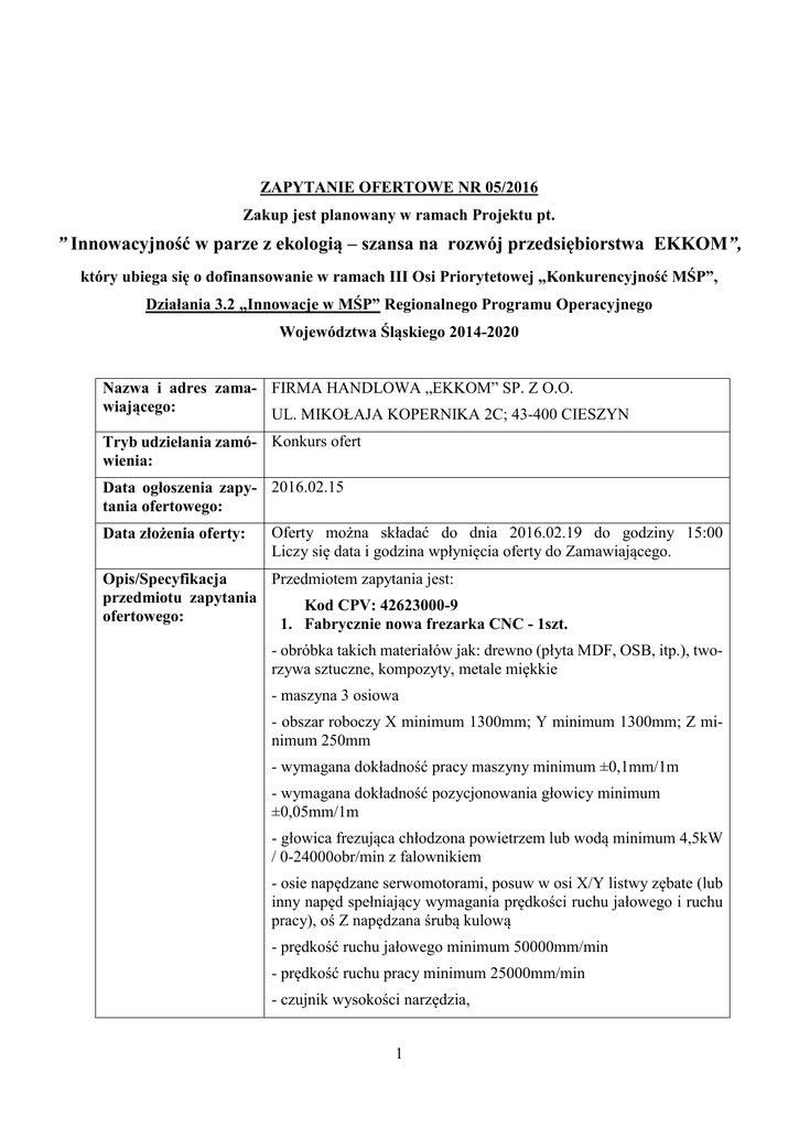 ZAPYTANIE OFERTOWE NR 05/2016 Zakup jest planowany w ramach Projektu pt. ” Innowacyjność w parze z ekologią – szansa na rozwój przedsiębiorstwa EKKOM”, który ubiega się o dofinansowanie w ramach III Osi Priorytetowej „Konkurencyjność MŚP”, Działania 3.2 „Innowacje w MŚP” Regionalnego Programu Operacyjnego Województwa Śląskiego 2014-2020 Nazwa i adres zama- FIRMA HANDLOWA „EKKOM” SP. Z O.O. wiającego: UL. MIKOŁAJA KOPERNIKA 2C; 43-400 CIESZYN Tryb udzielania zamó- Konkurs ofert wienia: Data ogłoszenia zapy- 2016.02.15 tania ofertowego: Data złożenia oferty: Oferty można składać do dnia 2016.02.19 do godziny 15:00 Liczy się data i godzina wpłynięcia oferty do Zamawiającego. Przedmiotem zapytania jest: Opis/Specyfikacja przedmiotu zapytania Kod CPV: 42623000-9 ofertowego: 1. Fabrycznie nowa frezarka CNC - 1szt. - obróbka takich materiałów jak: drewno (płyta MDF, OSB, itp.), tworzywa sztuczne, kompozyty, metale miękkie - maszyna 3 osiowa - obszar roboczy X minimum 1300mm; Y minimum 1300mm; Z minimum 250mm - wymagana dokładność pracy maszyny minimum ±0,1mm/1m - wymagana dokładność pozycjonowania głowicy minimum ±0,05mm/1m - głowica frezująca chłodzona powietrzem lub wodą minimum 4,5kW / 0-24000obr/min z falownikiem - osie napędzane serwomotorami, posuw w osi X/Y listwy zębate (lub inny napęd spełniający wymagania prędkości ruchu jałowego i ruchu pracy), oś Z napędzana śrubą kulową - prędkość ruchu jałowego minimum 50000mm/min - prędkość ruchu pracy minimum 25000mm/min - czujnik wysokości narzędzia, 1 - system odzysku wiórów, - stół stalowy podciśnieniowy z dodatkowymi rowkami „T” - niezależny pulpit/szafa zdalnego sterowania maszyną - sterowanie: niezależny kontroler posiadający własny procesor - oprogramowanie: program CAD/CAM do tworzenia projektów 3D z możliwością przetwarzania plików wektorowych, bitmapowych na ścieżkę narzędzia (tzw. generowania g-kodów) - gwarancja minimum 24 miesiące - reakcja serwisu maksymalnie do 48 godzin 2. Dostawa urządzenia do zakładu Zamawiającego do 2016.04.29 (zgodnie z HRF) 3. Montaż urządzenia w Zakładzie, w tym zainstalowanie całości niezbędnej do jego prawidłowego działania 4. Wykonanie konfiguracji urządzenia w Zakładzie, w tym również dokonania konfiguracji całości zainstalowanego w jego ramach oprogramowania 5. Sprawdzenie urządzenia oraz jego zdolności do rozpoczęcia produkcji, a następnie dokonanie uruchomienia i weryfikacja prawidłowości działania urządzenia w Zakładzie. 6. Po zakończeniu uruchomienia przewidziany jest instruktaż operatorów w zakresie obsługi maszyny w czasie maksymalnie 1 dnia roboczego. Koszt instruktażu zawarty w cenie maszyny Termin realizacji Dostawa do 2016.04.29 (zgodnie z HRF) przedmiotu oferty: Miejsce dostarczenia FIRMA HANDLOWA „EKKOM” SP. Z O.O. przedmiotu oferty: UL. MIKOŁAJA KOPERNIKA 2C; 43-400 CIESZYN Kryteria oferty wyboru Wybór najkorzystniejszej oferty nastąpi w oparciu o następujące kryteria: 1. 2. 3. 4. cena – 70 pkt. (70%) termin realizacji zamówienia – 15 pkt (15%) dostępność i koszt serwisu – 10 pkt. (10%) automatyzacja ustawień parametrów maszyny - 5 pkt (5%) 1. Liczba punktów w kryterium „cena” będzie przyznawana wg wzoru: 𝑃𝑖 = 𝐶𝑚𝑖𝑛 𝐶𝑖 𝑥70𝑝𝑘𝑡 gdzie Pi - liczba punktów dla oferty nr „i’ w kryterium „cena” zaokrąglona do liczby całkowitej 2 Cmin – najmniejsza cena całkowita ze wszystkich cen zaproponowanych przez wszystkich oferentów Ci - cena całkowita oferty nr „i” 2. Liczba punktów w kryterium „dostępność i koszt serwisu” będzie przyznawana wg schematu: 10 pkt. – reakcja serwisu maksymalnie do 48 godzin i najniższe koszty serwisu 5 pkt. – reakcja serwisu powyżej 48 godzin i wyższe koszty serwisu 3. Liczba punktów w kryterium „termin realizacji zamówienia” będzie przyznawana wg schematu 15 pkt. – najkrótszy termin realizacji zamówienia 5 pkt. – pozostałe terminy realizacji zamówienia 4. Liczba punktów w kryterium „automatyzacja ustawień parametrów maszyny” będzie przyznawana wg schematu: 5 pkt. – więcej niż 1 (jeden) udokumentowane systemy automatyzacji ustawień parametrów 1 pkt. – co najmniej 1 (jeden) udokumentowane systemy automatyzacji ustawień parametrów W ofercie należy odnieść się do wszystkich kryteriów wyboru oferty. W przypadku, gdy Oferent pominie jedno z kryteriów jego oferta może zostać uznana za nieważną lub w ocenie zostanie przyznanych mu 0 pkt. w danym kryterium. Oferta może zostać uznana za nieważną w przypadku nie spełnienia specyfikacji przedmiotu. Zamawiający dokona wyboru najkorzystniejszej oferty wg systemu punktowego i spełnienia specyfikacji przedmiotu. Za najkorzystniejszą zostanie uznana oferta która spełnia wymagania specyfikacji przedmiotu oraz której suma uzyskanych punktów będzie najwyższa. Zamawiający po dokonaniu oceny oferty całościowej zaproponuje oferentowi, który uzyskał największą ilość punktów i spełnił specyfikację przedmiotu, zawarcie umowy na realizację przedmiotu zamówienia. Oferta musi zawierać następujące elementy Pełne dane identyfikujące oferenta (nazwa, adres, nr NIP, nr KRS/EDG) Datę przygotowania i termin ważności oferty, 3 Zakres i szczegółowy opis oferowanego produktu w ramach oferty, Odniesienie się do każdego z zamieszczonych w zapytaniu ofertowym kryteriów wyboru oferty. Formularz oferty może zostać rozszerzony o dodatkowe informacje dotyczące przedmiotu oferty, Cenę całkowitą netto i brutto, Warunki i termin płatności, Datę/okres realizacji przedmiotu oferty, Dane osoby do kontaktu (imię, nazwisko, numer telefonu, adres e-mail), Czytelny podpis osoby upoważnionej do wystawienia oferty. Brak jakiegokolwiek z wyżej wymienionych elementów może skutkować odrzuceniem oferty. Sposób oferty: składania Oferta może być zł