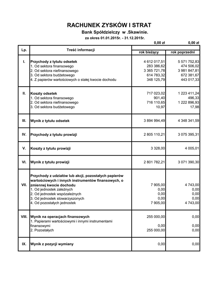 RACHUNEK ZYSKÓW I STRAT Bank Spółdzielczy w .Skawinie. za okres 01.01.2015r. - 31.12.2015r. 0,00 zł Lp. Treść informacji I. Przychody z tytułu odsetek 1. Od sektora finansowego 2. Od sektora niefinansowego 3. Od sektora budżetowego 4. Z papierów wartościowych o stałej kwocie dochodu II. Koszty odsetek 1. Od sektora finansowego 2. Od sektora niefinansowego 3. Od sektora budżetowego III. rok bieżący 0,00 zł rok poprzedni 4 612 017,51 283 386,62 3 365 721,78 614 783,32 348 125,79 5 571 752,83 474 506,02 3 981 847,81 672 381,67 443 017,33 717 023,02 901,40 716 110,65 10,97 1 223 411,24 496,33 1 222 896,93 17,98 Wynik z tytułu odsetek 3 894 994,49 4 348 341,59 IV. Przychody z tytułu prowizji 2 805 110,21 3 075 395,31 V. Koszty z tytułu prowizji 3 328,00 4 005,01 VI. Wynik z tytułu prowizji 2 801 782,21 3 071 390,30 7 905,00 0,00 0,00 0,00 7 905,00 4 743,00 0,00 0,00 0,00 4 743,00 255 000,00 0,00 0,00 255 000,00 0,00 0,00 0,00 0,00 Przychody z udziałów lub akcji, pozostałych papierów wartościowych i innych instrumentów finansowych, o VII. zmiennej kwocie dochodu 1. Od jednostek zależnych 2. Od jednostek wspózależnych 3. Od jednostek stowarzyszonych 4. Od pozostałych jednostek VIII. Wynik na operacjach finansowych 1. Papierami wartościowymi i innymi instrumentami finansowymi 2. Pozostałych IX. Wynik z pozycji wymiany X. Wynik na działalności bankowej 6 959 681,70 7 424 474,89 XI. Pozostałe przychody operacyjne 84 909,15 199 810,30 431 576,49 328 045,08 4 713 760,29 2 382 481,18 378 332,40 1 952 946,71 5 012 340,38 2 795 261,31 437 997,48 1 779 081,59 Amortyzacja środków trwałych oraz wartości XIV. niematerialnych i prawnych 619 491,77 639 523,02 XV. Odpisy na rezerwy i aktualizacja wartości 1. Odpisy na rezerwy celowe i na ogólne ryzyko bankowe 2. Aktualizacja wartości aktywów finansowych 857 449,80 857 449,80 0,00 1 419 615,52 1 419 615,52 0,00 XVI. Rozwiązanie rezerw i aktualizacja wartoścci dotyczące aktualizacji 356 930,50 1 073 985,98 356 930,50 0,00 1 073 985,98 0,00 XVII. Różnica wartości rezerw i aktualizacji 500 519,30 345 629,54 XVIII. Wynik z działalności operacyjnej 779 243,00 1 298 747,17 0,00 0,00 0,00 0,00 0,00 0,00 XX. Zysk (strata) brutto 779 243,00 1 298 747,17 XXI. Podatek dochodowy 143 357,00 138 760,00 0,00 0,00 635 886,00 1 159 987,17 XII. Pozostałe koszty operacyjne XIII. Koszty działania banku 1. Wynagrodzenia 2. Ubezpieczenia i inne świadczenia 3. Inne 1. Rozwiązanie rezerw celowych i rezerw na ryzyko ogólne 2. Aktualizacja wartości aktywów finansowych XIX. Wynik na operacjach nadzwyczajnych 1. Zyski nadzwyczajne 2. Straty nadzwyczajne Pozostałe obowiązkowe zmniejszenia zysku (zwiększenie XXII. straty) XXII. Zysk (strata) netto