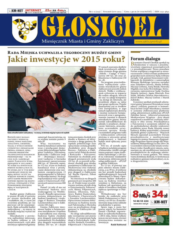 R E K L A M A Nr 1-2 (223) | Styczeń-Luty 2015 | Cena: 1,90 zł (w tym 8%VAT) | ISSN 1231-4641 www.zakliczyninfo.pl Rada Miejska uchwaliła tegoroczny budżet gminy FOT. MAREK NIEMIEC Jakie inwestycje w 2015 roku? Rada uchwaliła budżet nadwyżkowy – to znaczy, że dochody mają być wyższe niż wydatki Rozwój sieci kanalizacyjnej i wodociągowej, nowe nakładki asfaltowe, chodniki, walka z wykluczeniem cyfrowym i odnawialne źródła energii, opracowanie projektów technicznych kolejnych przedsięwzięć – na te cele m.in. samorząd gminy Zakliczyn wyda pieniądze w 2015 roku. W sumie na inwestycje pójdzie blisko 9 mln zł. To sporo, bo w tym roku samorządy jeszcze nie będą mogły liczyć na większe wsparcie unijne, gdyż nabór projektów dopiero będzie się rozpoczynał i pieniądze z Unii Europejskiej dostępne będą w następnych latach. Budżet gminy Zakliczyn to prawie 40 mln zł zarówno po stronie dochodów jak i wydatków, ale, o czym już wcześniej pisaliśmy, po raz pierwszy od lat niepamiętnych, Rada uchwaliła budżet nadwyżkowy – to znaczy, że dochody mają być wyższe niż wydatki. Mieszkańców z pewnością najbardziej interesuje, co będzie robione w ich miejscowościach, czyli jakie inwestycje zaplanował gminny samorząd. Inaczej mówiąc, na co wydane zostanie prawie 9 mln zł? Więc zaczynamy: na budowę kanalizacji sanitarnej wraz z przyłączami domowymi, która przebiegać będzie przez Lusławice, Faściszową, Kończyska i Zakliczyn (etap IV – obejmujący miejscowość Lusławice w kierunku Faściszowej) zarezerwowano 600 tys. zł. Niewiele mniej, bo 572 tys. zł jest na budowę kanalizacji wraz z przyłączami domowymi oraz zasilaniem energetycznym (3 przepompownie) w Paleśnicy (w kierunku Jamnej). Na drugi etap kanalizacji wraz z przyłączami w Charzewicach i Faliszewicach zarezerwowano 800 tys. zł. Ponad 1,6 mln zł ma zaś kosztować budowa sieci wodociągowej we Wróblowicach. Ponadto opracowane zostaną dokumentacje na budowę kanalizacji i wodociągu w Roztoce, Zawadzie Lanckorońskiej oraz w Zakliczynie (III etap). Gmina Zakliczyn inwestować będzie w bezpieczeństwo mieszkańców i wspólnie z marszałkiem oraz starostą budować będzie chodniki przy drogach wojewódzkich i powiatowych. Do chodników przy drogach wojewódzkich dołoży 245 tys. zł i dzięki temu powstanie chodnik przy drodze w Roztoce od skrzyżowania z drogą gminną do szpitala położniczego oraz opracowane zostaną projekty chodników przy drogach Borowa – Paleśnica, w Zakliczynie (od ul. Polnej do mostu) i Kończyska – Faściszowa. Natomiast na chodniki przy drogach powiatowych wyda 191 tys. zł, co pozwoli wybudować chodnik przy drodze powiatowej w Zakliczynie (ul. Mickiewicza) oraz wykonać dokumentację na chodniki przy drogach w Zakliczynie (ul. Ruchu Oporu), Zdoni i Gwoźdźcu. Na inwestycje na drogach gminnych jest niespełna 400 tys. zł. Dzięki temu wyasfaltowane zostaną odcinki dróg w Dzierżaninach, Faliszewicach, Słonej, Filipowicach, Jamnej, Olszowej, Paleśnicy, Rudzie Kameralnej, Wesołowie, Charzewicach i Zawadzie Lanckorońskiej. Opracowana zostanie dokumentacja na budowę mostu nad Paleśnianką w Bieśniku oraz na przebudowę drogi gminnej w Zakliczynie (ul. Grabina). Na drogi zakwalifikowane jako wewnętrzne jest prawie 250 tys. zł i poprawiane będą drogi w Kończyskach, Lusławicach, Stróżach, Gwoźdźcu, Filipowicach i Faściszowej. W ramach usuwania skutków klęsk żywiołowych odbudowana zostanie droga gminna „Szkoła – Cepiga” w Faściszowej (60 tys. zł) oraz ul. Klasztorna w Zakliczynie (50 tys. zł). Na program przeciwdziałania wykluczeniu cyfrowemu mieszkańców gminy Zakliczyn jest przeszło milion złotych. Walka z wykluczeniem cyfrowym to wsparcie dla rodzin ubogich, których nie stać na zakup komputera i na dostęp do Internetu, ale projektem objęte są także inne grupy społeczne. Projekt finansowany jest ze środków Unii Europejskiej, w jego ramach zaplanowano dostawę i montaż zestawów komputerowych wraz z oprogramowaniem (montaż w domach mieszkańców gminy, którzy zostali zakwalifikowani do udziału w projekcie), dostarczenie Internetu, przeszkolenie uczestników, serwisowanie sprzętu. Każdy z uczestników programu walki z wykluczeniem cyfrowym otrzyma w użyczenie sprzęt komputerowy, a Internet będzie miał opłacany przez pięć lat. 934 tys. zł zostało ujęte w budżecie na kolejny program „Odnawialne źródła energii szansą poprawy stanu środowiska naturalnego”, a 183 tys. zł na wdrożenie standardów świadczenia elektronicznych usług publicznych – ePUAP w gminie Zakliczyn. Za 15 tys. zł powstać ma plan odnowy miasta Zakliczyna, a za 39 tys. zł zrobiony ma być projekt budowlany ogólnodostępnych łazienek mineralnych w Słonej. Opracowana będzie dokumentacja na budowę świetlicy wiejskiej w Melsztynie, na budowę sali sportowej przy szkole w Gwoźdźcu i budynku zaplecza sportowego w Paleśnicy. Wybudowane ma być boisko do siatkówki przy Szkole Podstawowej w Faściszowej, a za 191 tys. zł zmodernizowane mają zostać oddziały przedszkolne w gminie. Sporo tego, a może być jeszcze więcej, bo burmistrz Dawid Chrobak zapowiedział, że nadwyżka budżetowa z 2014 roku, której wielkość jeszcze nie jest znana, również przeznaczona zostanie na inwestycje. Rafał Kubisztal Forum dialogu B urmistrz Dawid Chrobak spotkał się dwukrotnie w ratuszu z przedstawicielami organizacji pozarządowych i z przedsiębiorcami. Nowo powołane Forum współpracy magistratu ze stowarzyszeniami i właścicielami podmiotów gospodarczych animować będą wybrane zarządy. I tak, gminni biznesmani wydelegowali do kontaktów z samorządem Romana Skalskiego (prezesa zarządu) oraz Zdzisława Jarosza, Marka Sobola, Macieja Gofrona, Annę Różak, Henryka Migdała oraz Jacka Słowińskiego. Stowarzyszenia reprezentować będą: Ewelina Siepiela (prezes), Agata Murczek, Ewa 